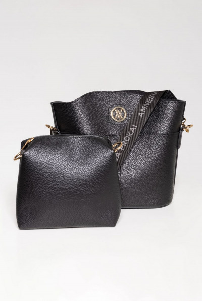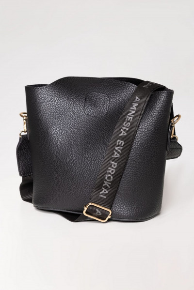 Amnesia Fashion - Eva béleletlen műbőr oldaltáska fekete színben; ívelt felsőrésszel; mágnespatentos záródással; állítható vállpánttal; hozzá tartozó kisméretű neszeszerrel; elején két zsebbel és fém márkajelzéssel.