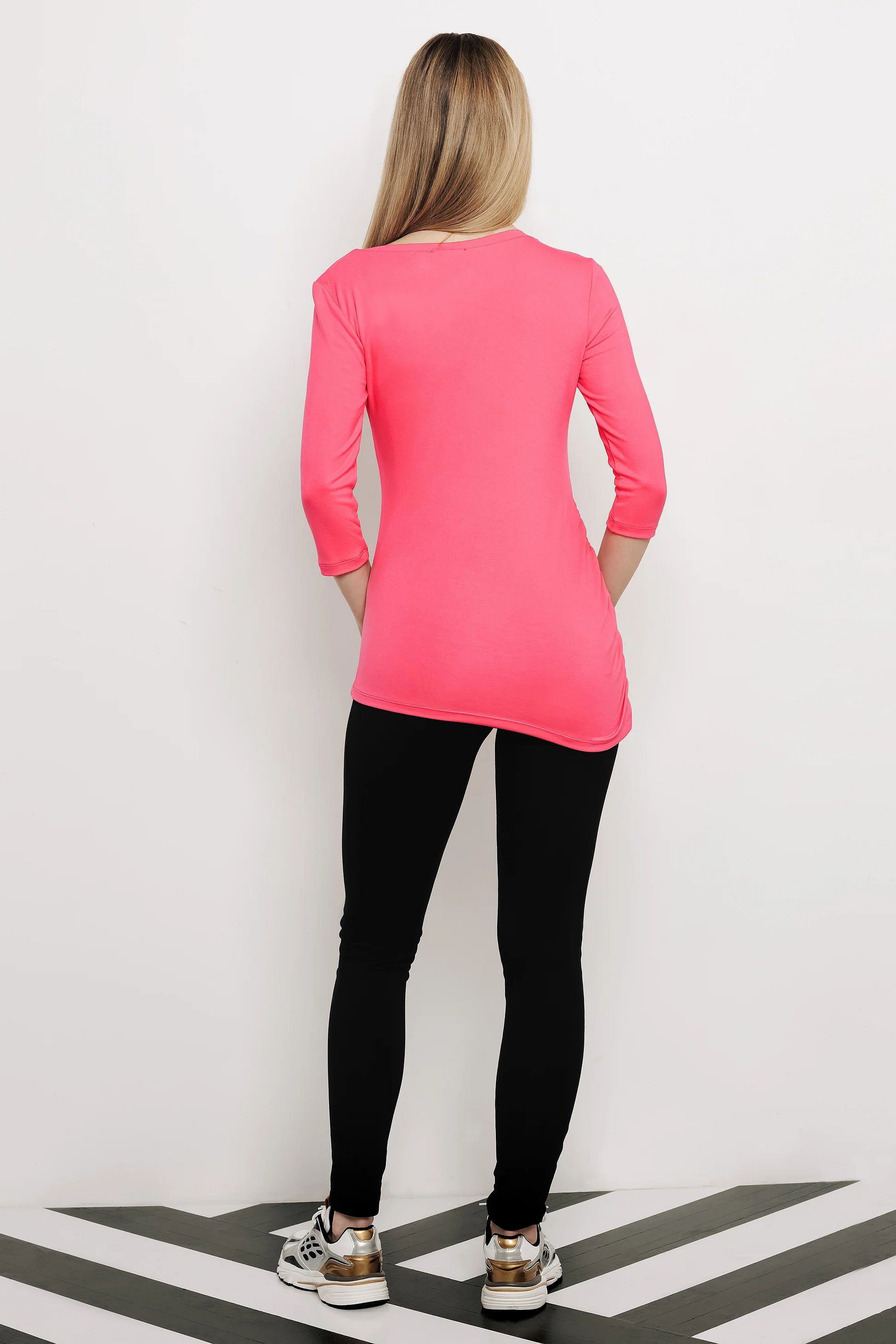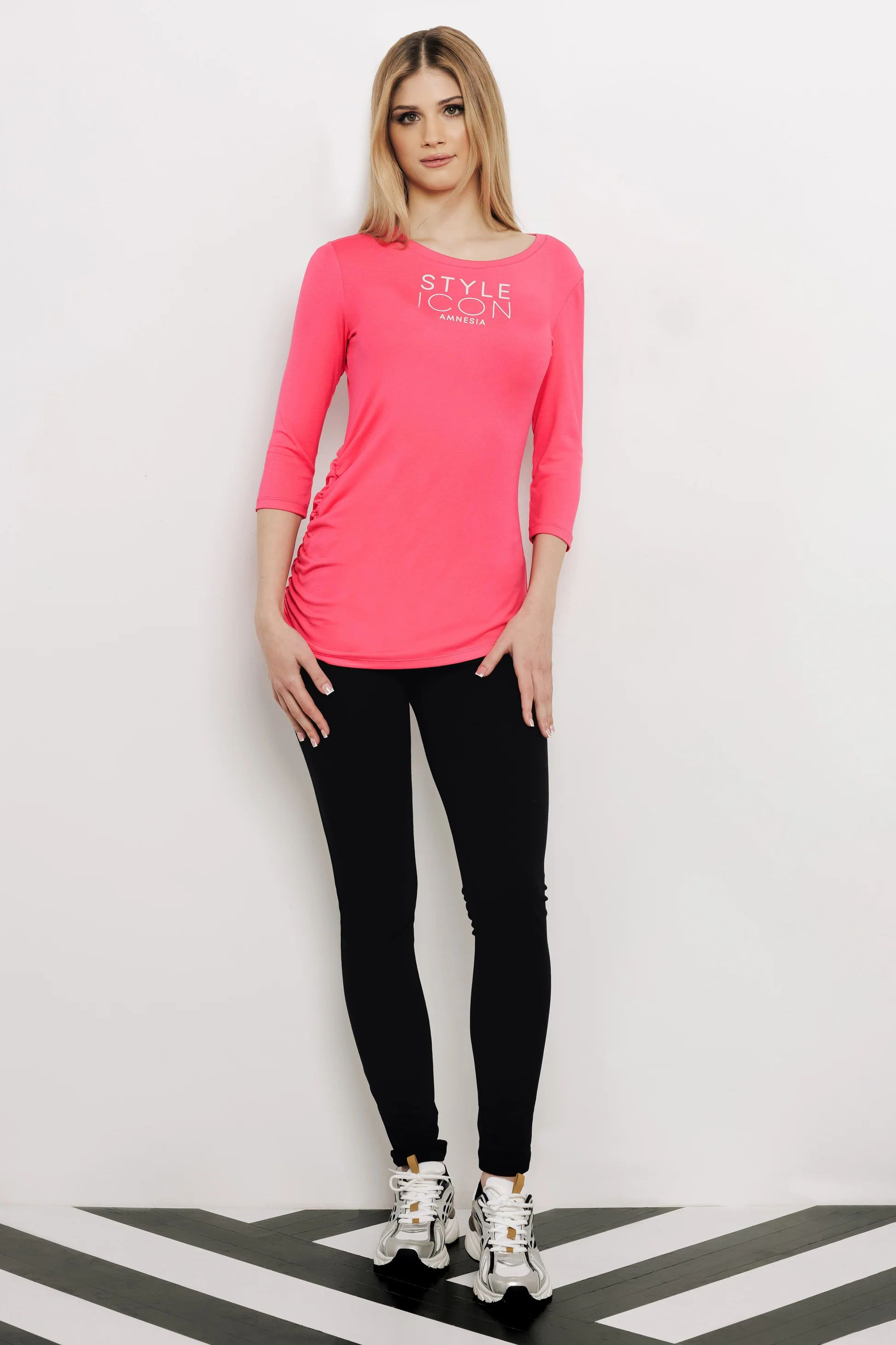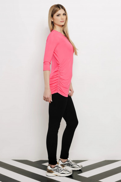 Amnesia felső, pink színben, karcsúsított szabással, kerek nyakkivágással, egyik oldalán ráncolással, elején filmnyomott márkajelzéssel.
