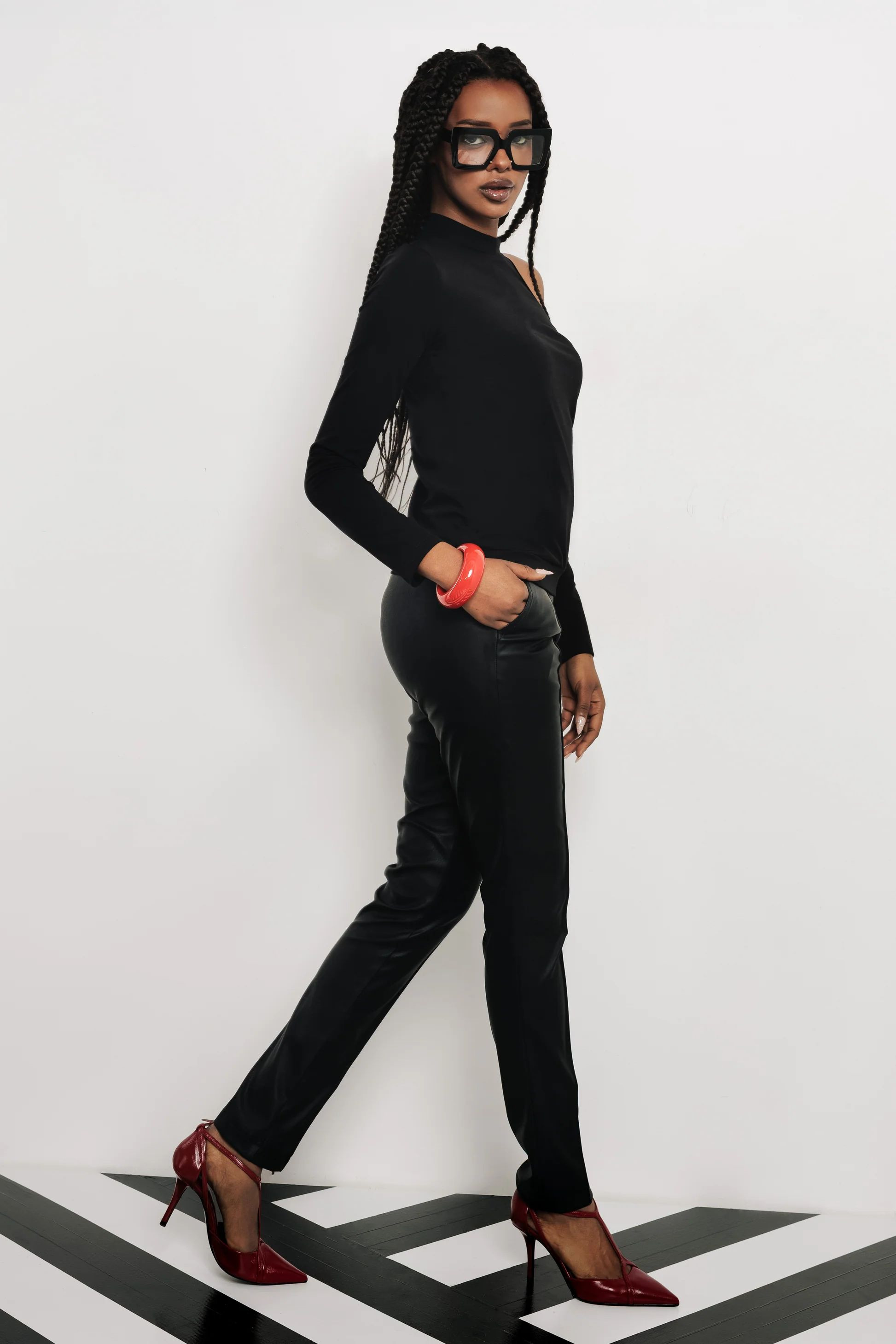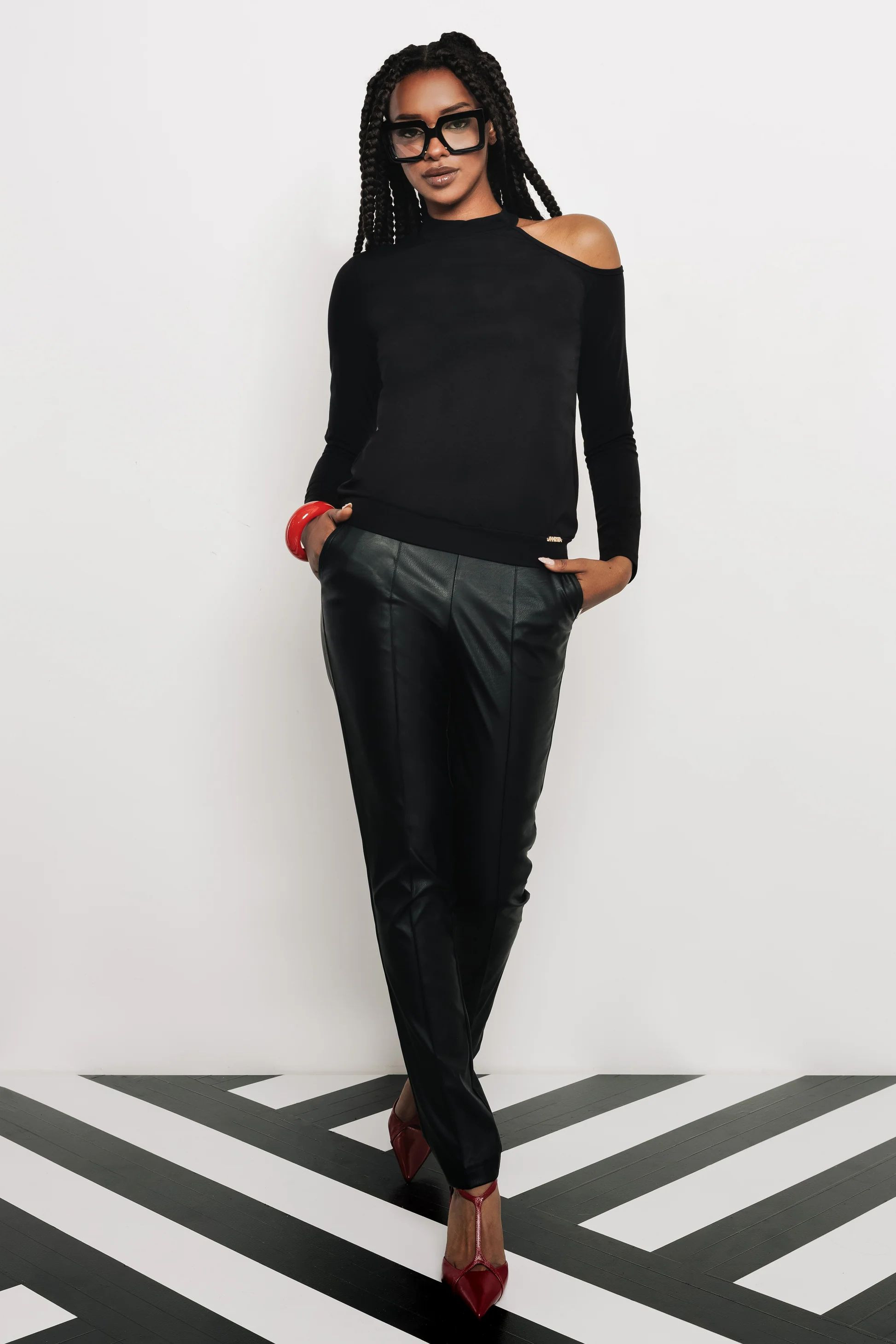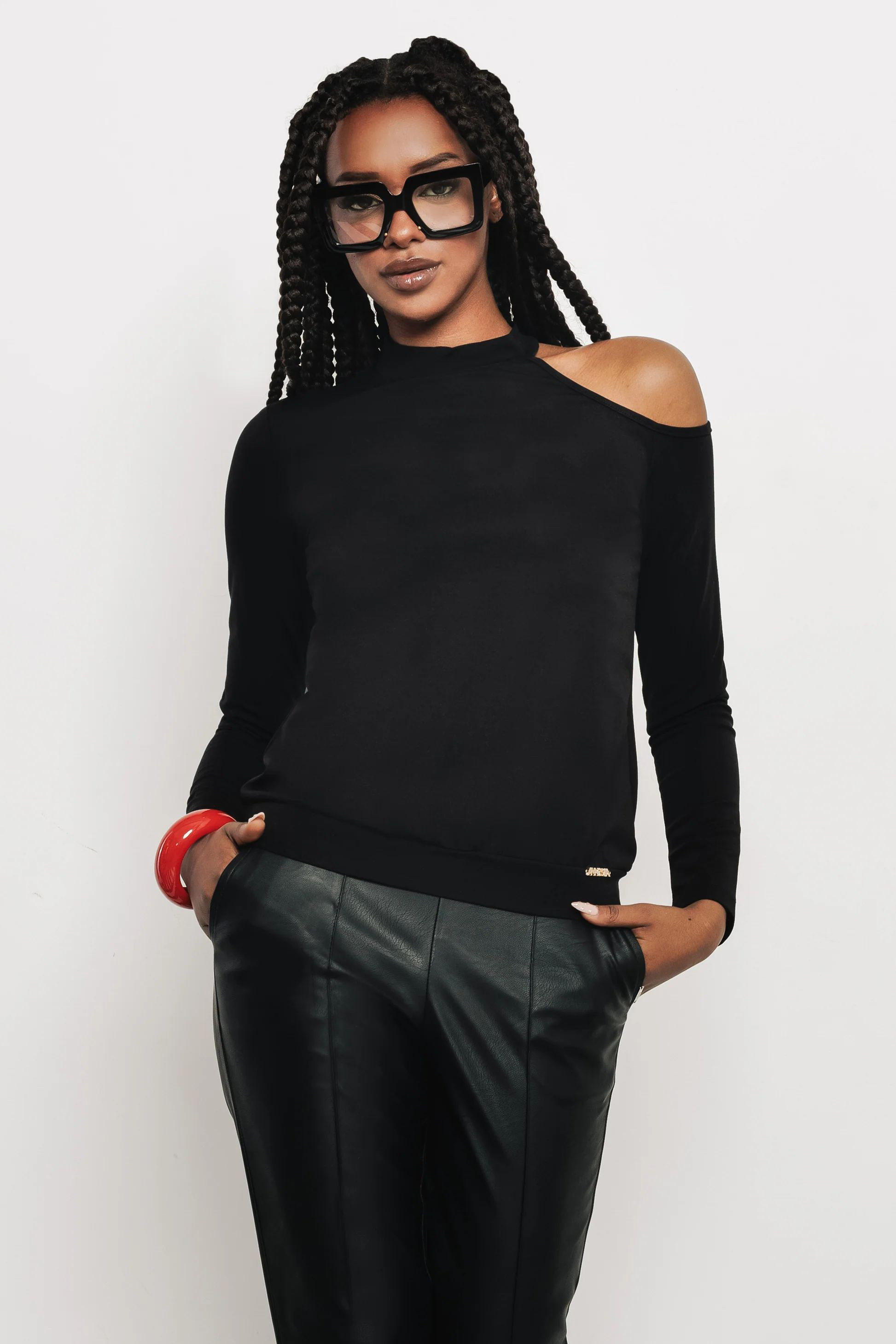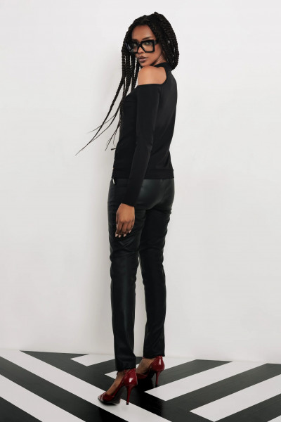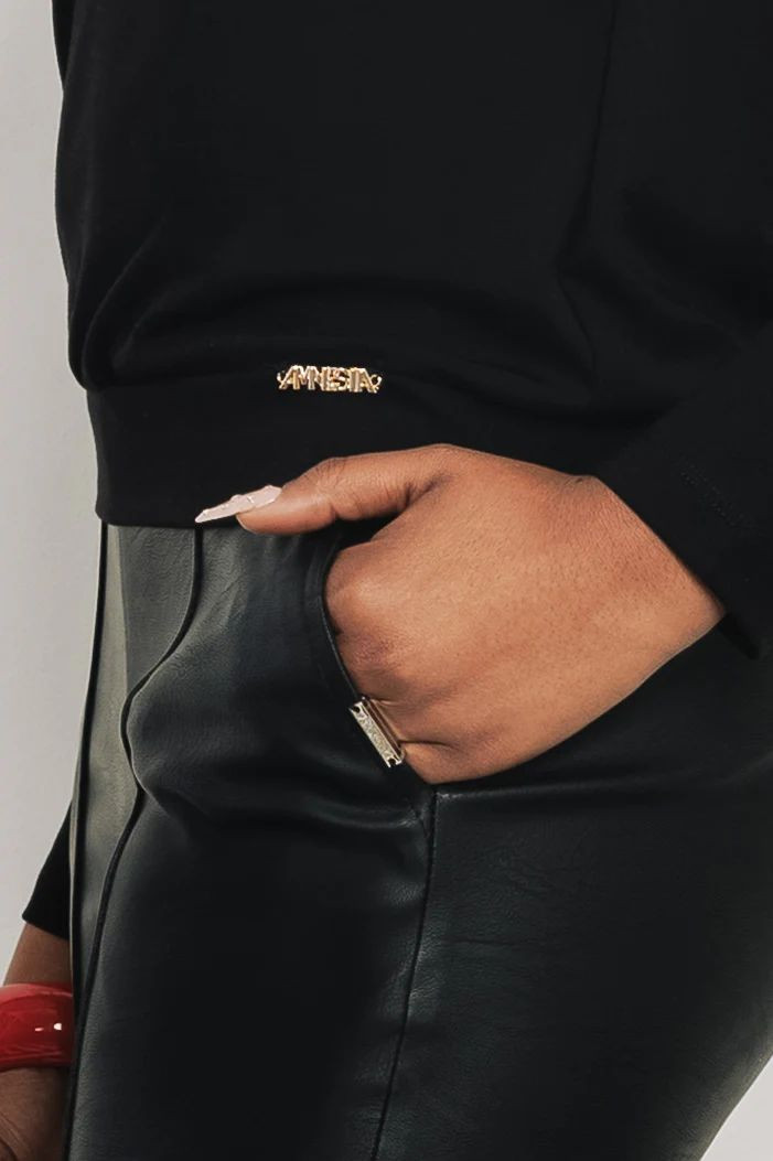 Amnesia felső, fekete színben, egyenes szabással, magasított nyakrésszel, vállán kivágással, alján fém márkajelzéssel.