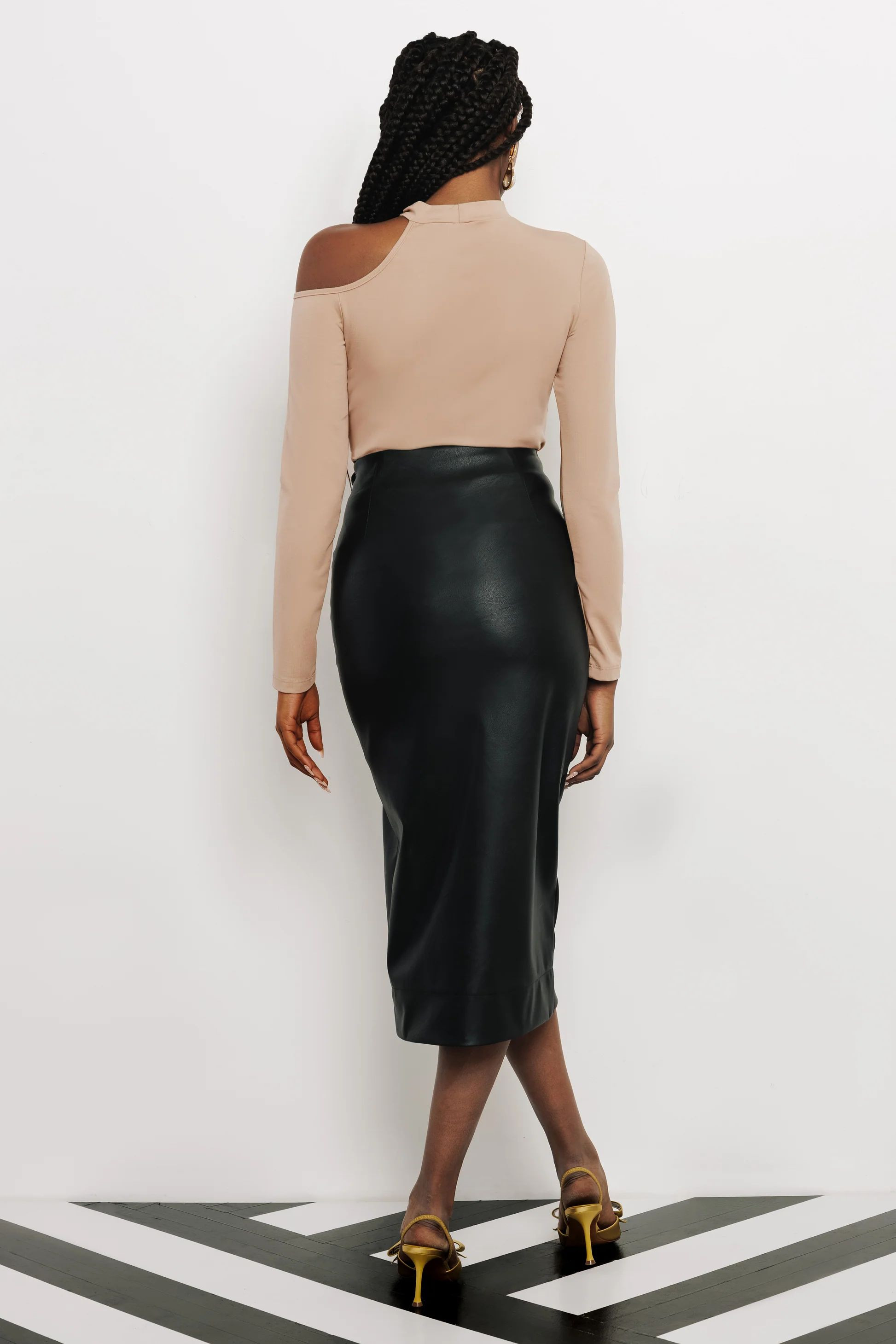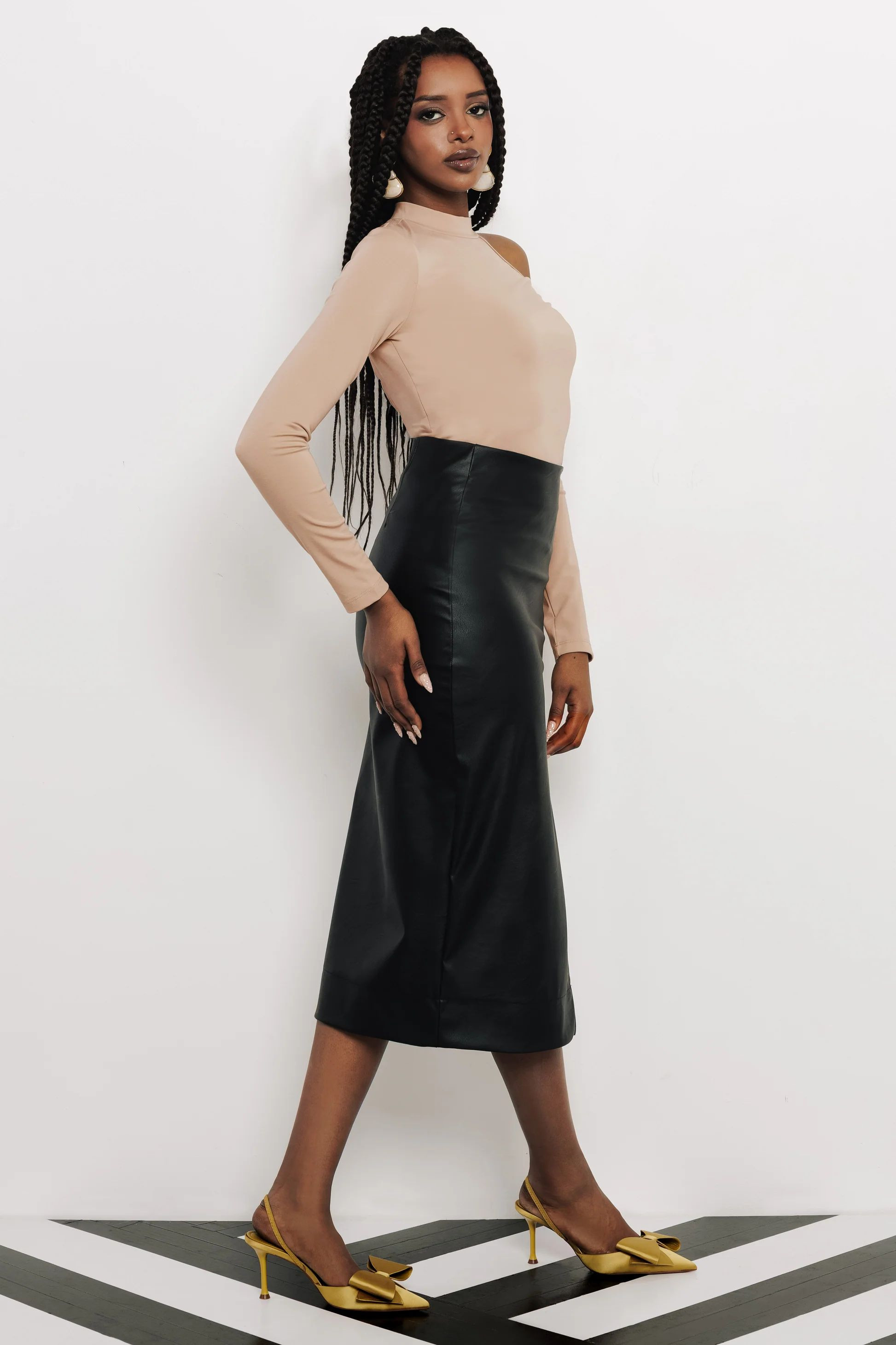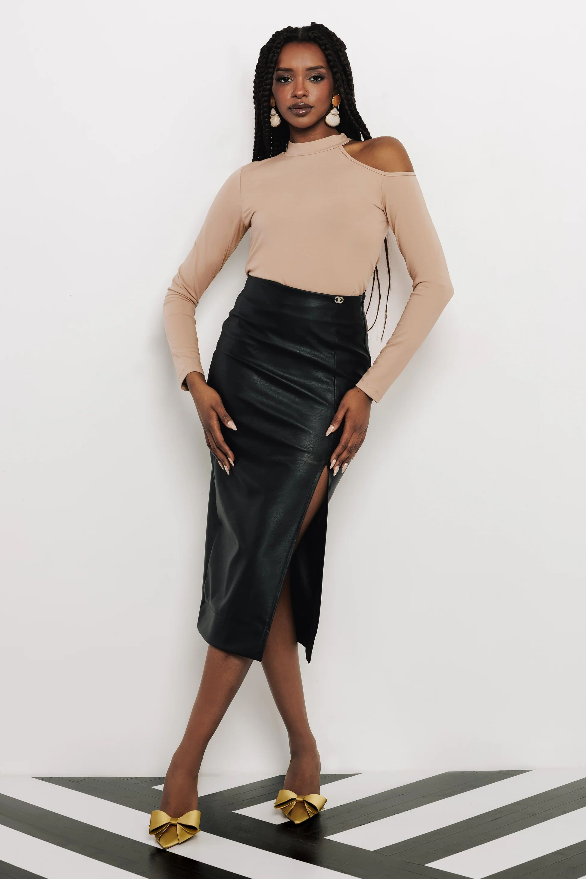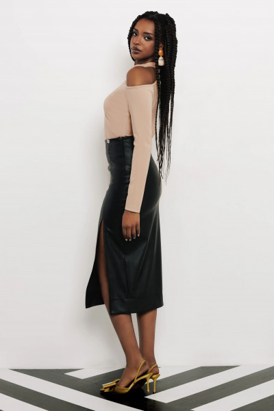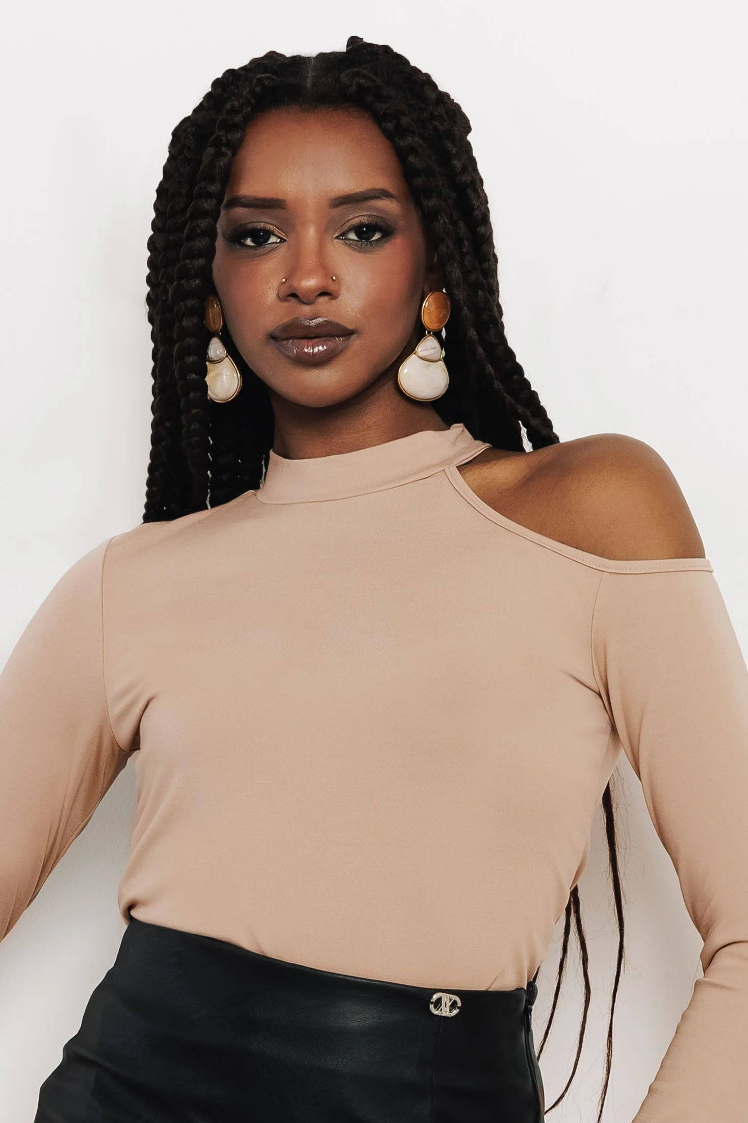 Amnesia felső, barna színben, egyenes szabással, magasított nyakrésszel, vállán kivágással, alján fém márkajelzéssel.