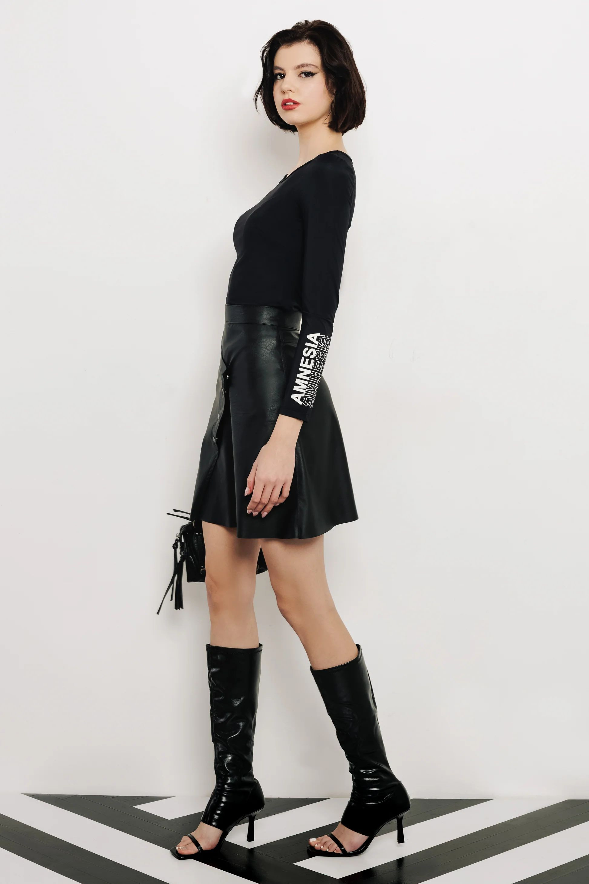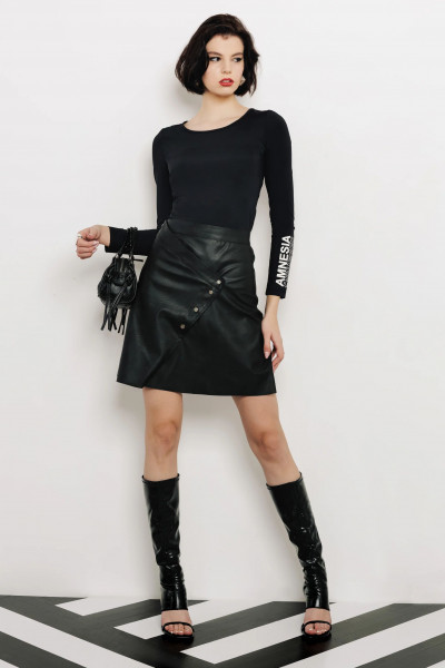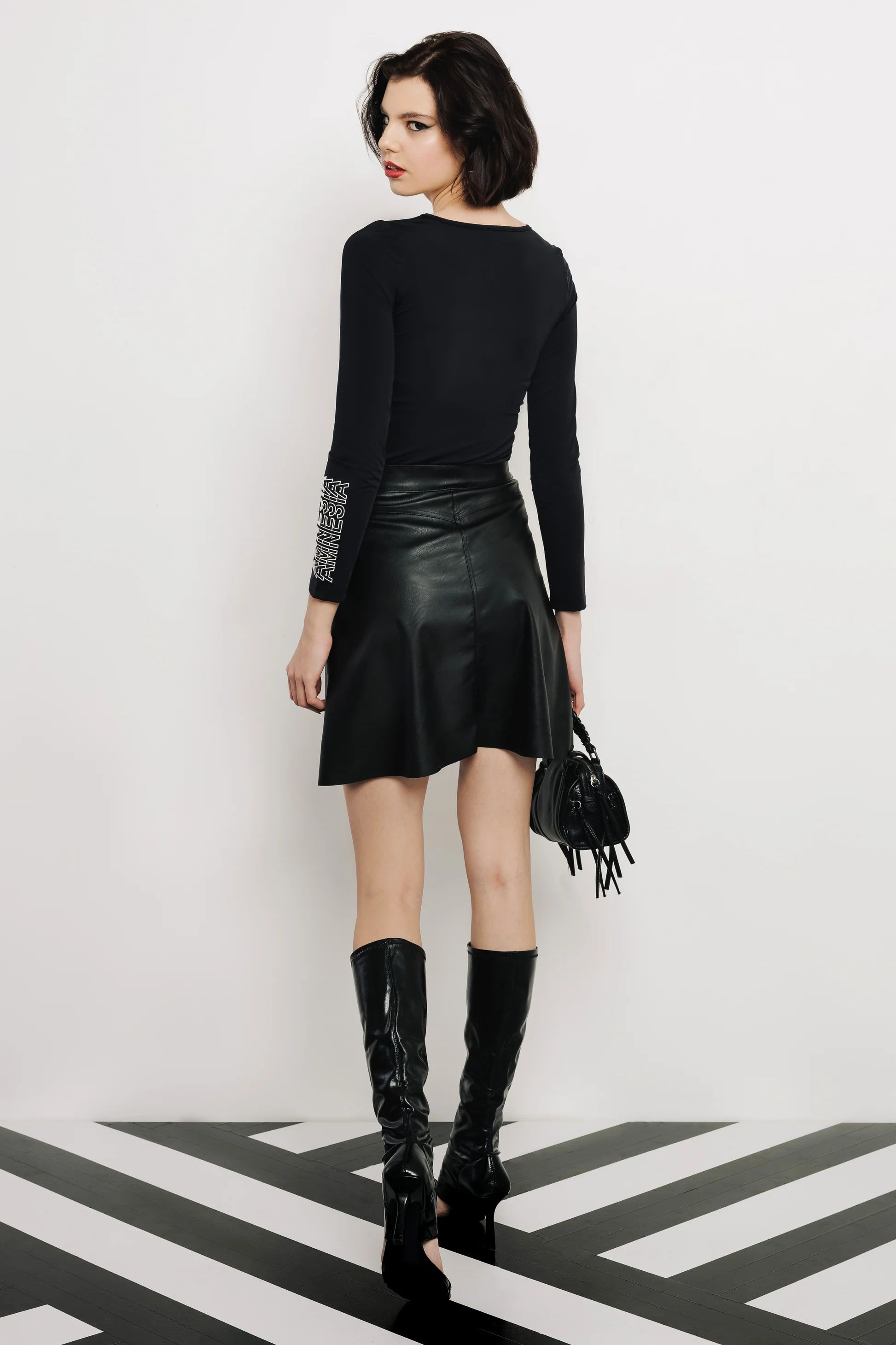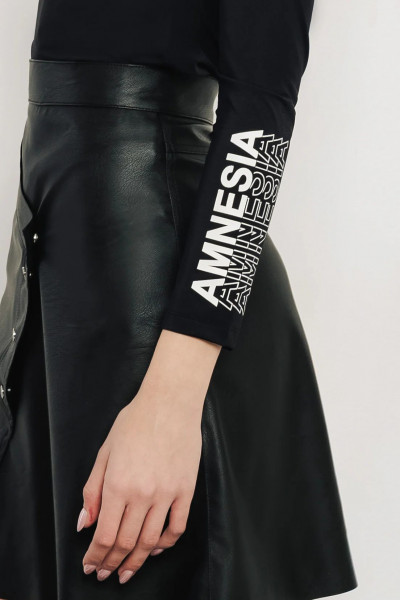 Amnesia felső, fekete színben, karcsúsított szabással, kerek nyakkivágással, ujján filmnyomott márkajelzéssel.