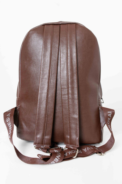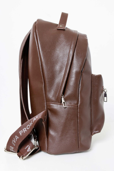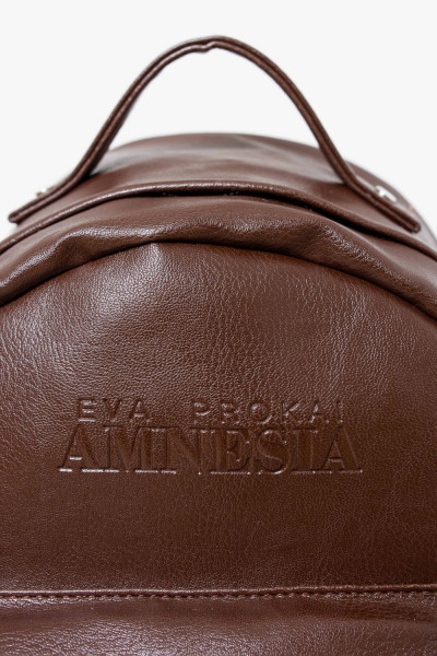 Amnesia Fashion - Eva Prokai műbőr hátizsák, csokoládébarna színben, cipzáras záródással, egyterű belsőrésszel, benne egy kis cipzáras zsebbel, elején egy nagyobb cipzáras zsebbel, márkajelzett, állítható pánttal, elején nyomott márkajelzéssel az őszi/téli Amnesia kollekcióból.