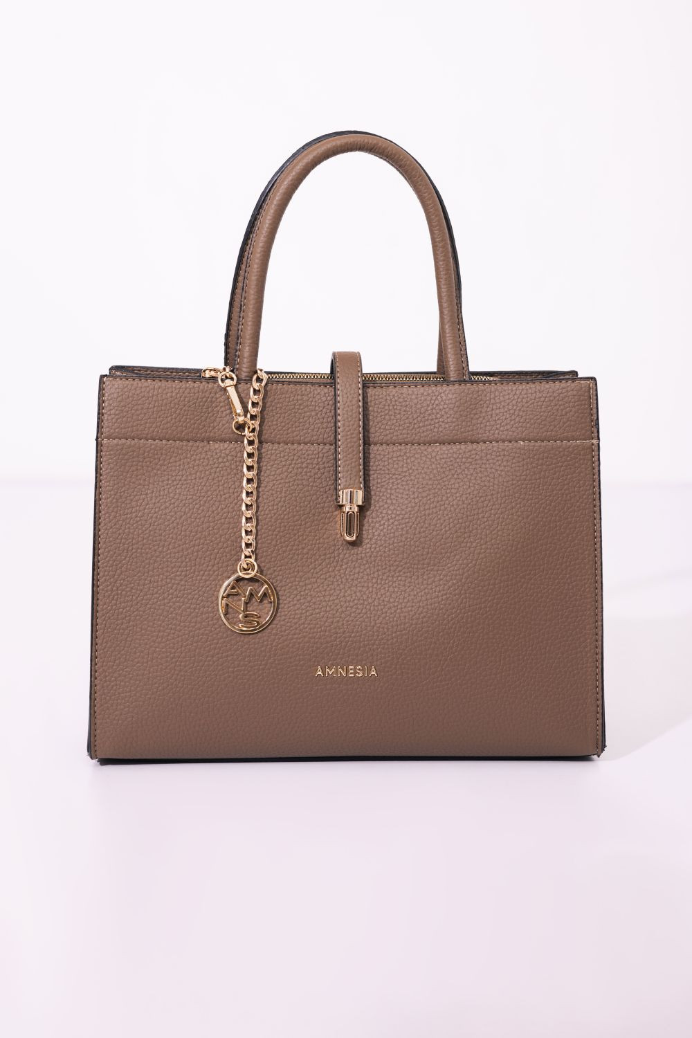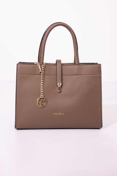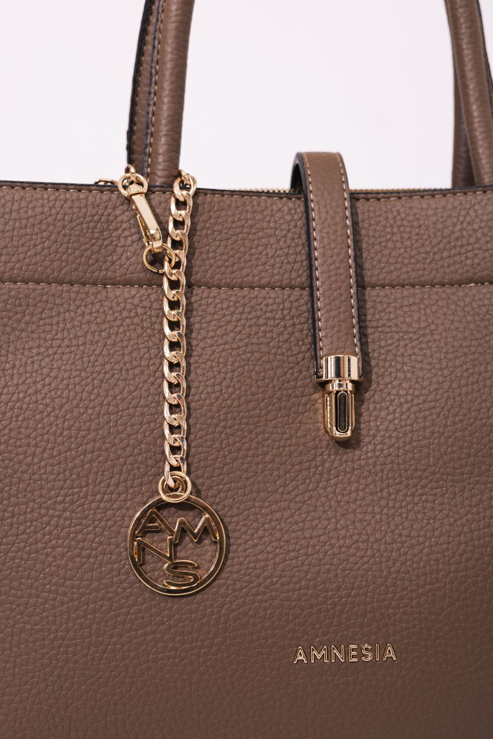 Amnesia arany színű láncos táskadísz, két méretben kapcsolható, márkajleztett medállal.