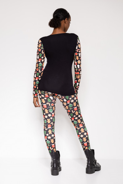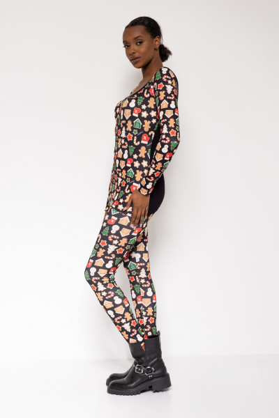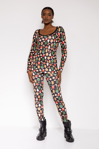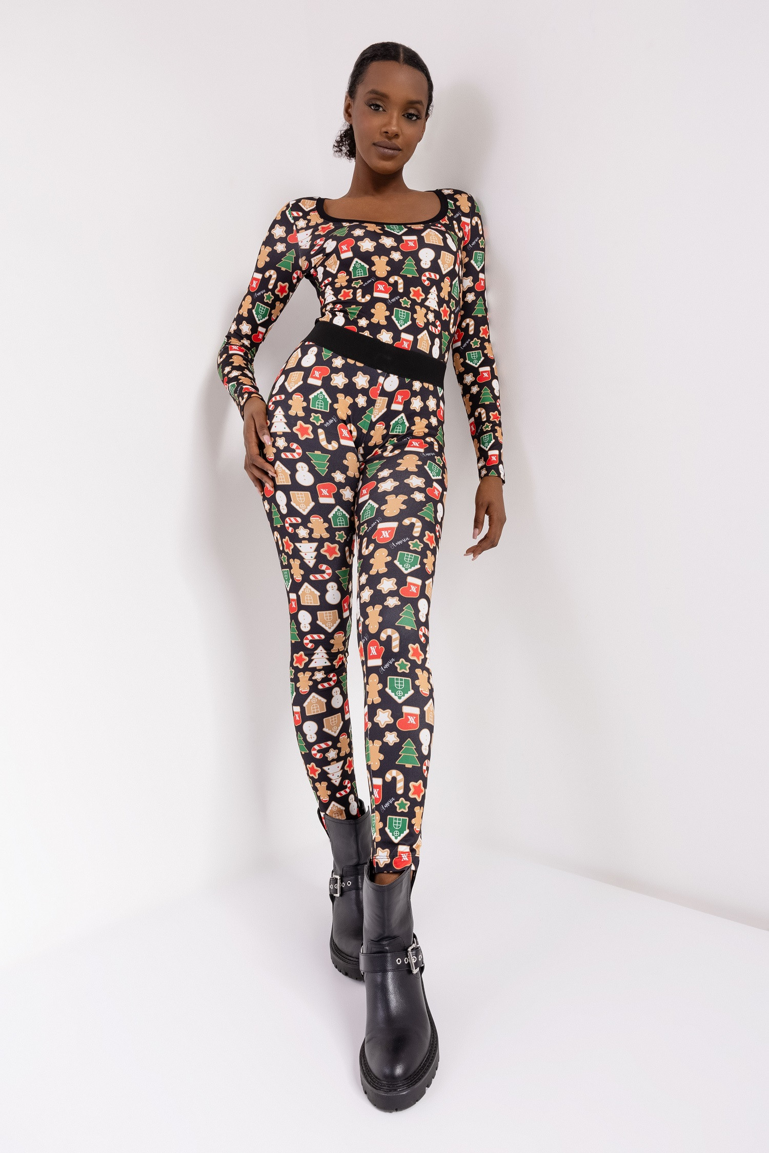 Amnesia Fashion - Eva Prokai - leggings karácsonyi mintás, testhezálló fazonban, vastag gumis derékrésszel, mintájában márkajelzéssel.