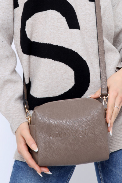 Amnesia Fashion - Eva Prokai - bőrhatású táska fangó színben, zipzáros záródással, bőrhatású vállpánttal, egyterű belsőrésszel, oldalán dombornyomott márkajelzéssel az őszi Amnesia kollekcióból.