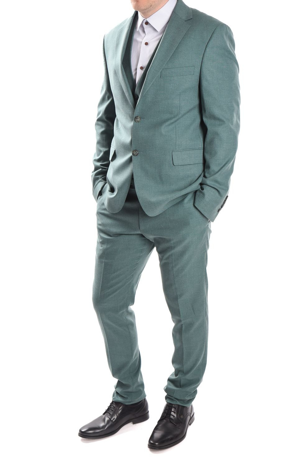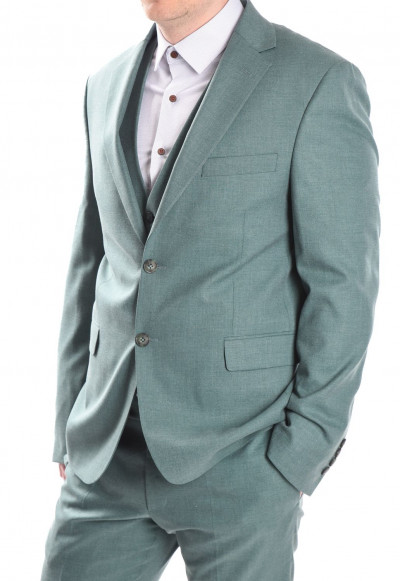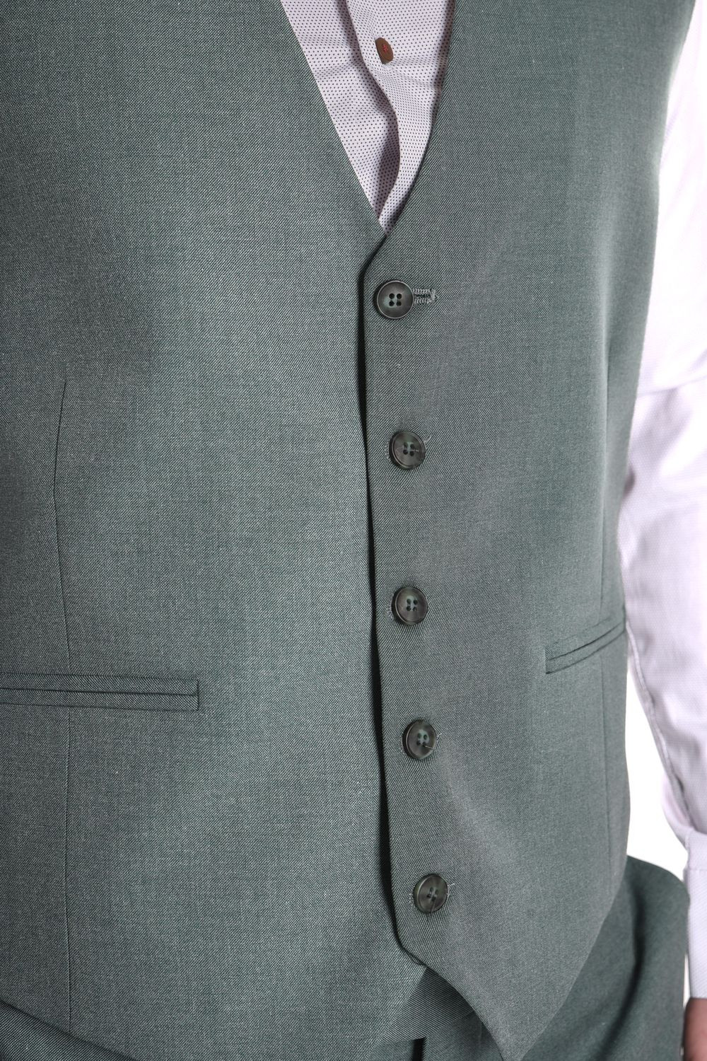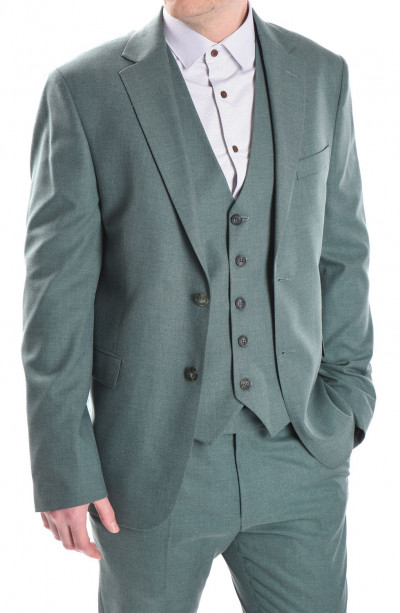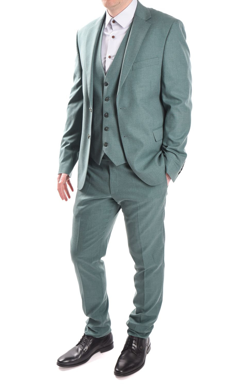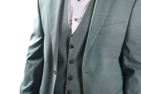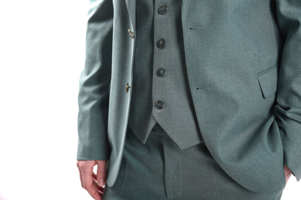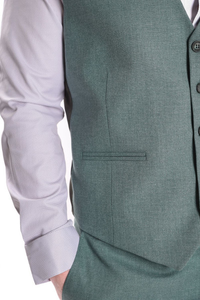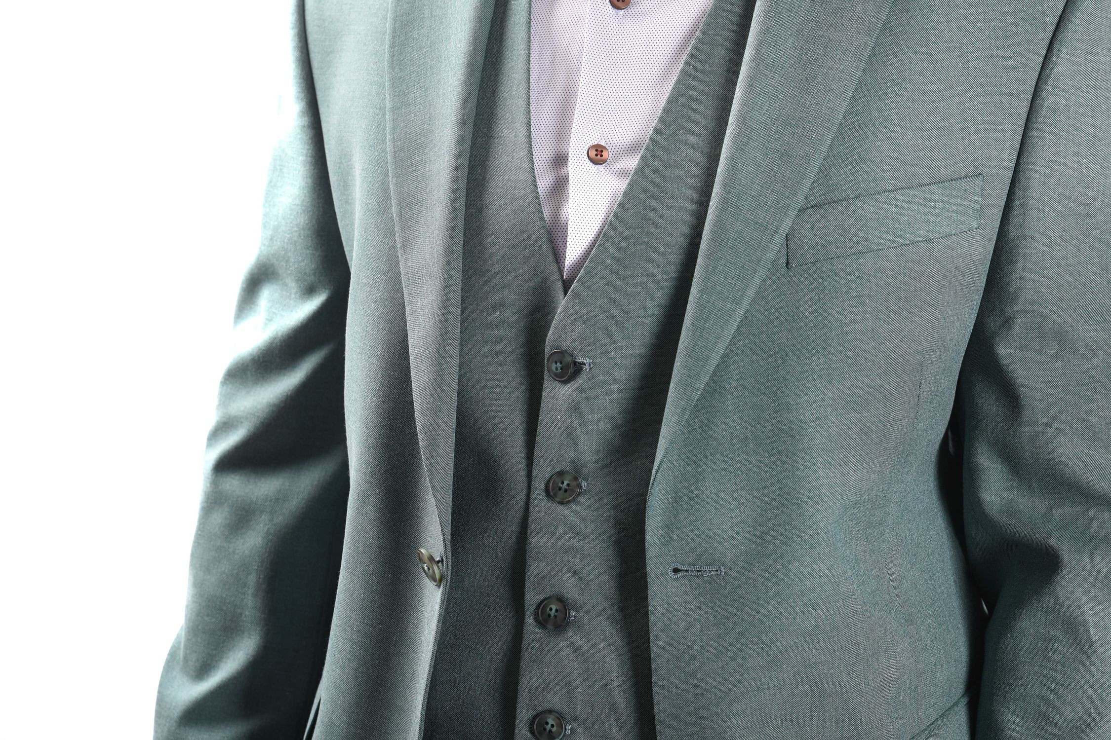 Balance férfi karcsúsított szabásvonalú három részes öltöny szett, zöld színben. Hátul dupla slicces zakó, kétgombos záródással. A zakó belsejében két zseb található. Igényes béléssel készült. A mellény egysoros gombolású, hátulján állítható. . Élére vasalt nadrágja övbújtatós, oldal és gombos farzsebes, derék része gombos és rejtett kapcsos záródású, slicc része cipzáras.