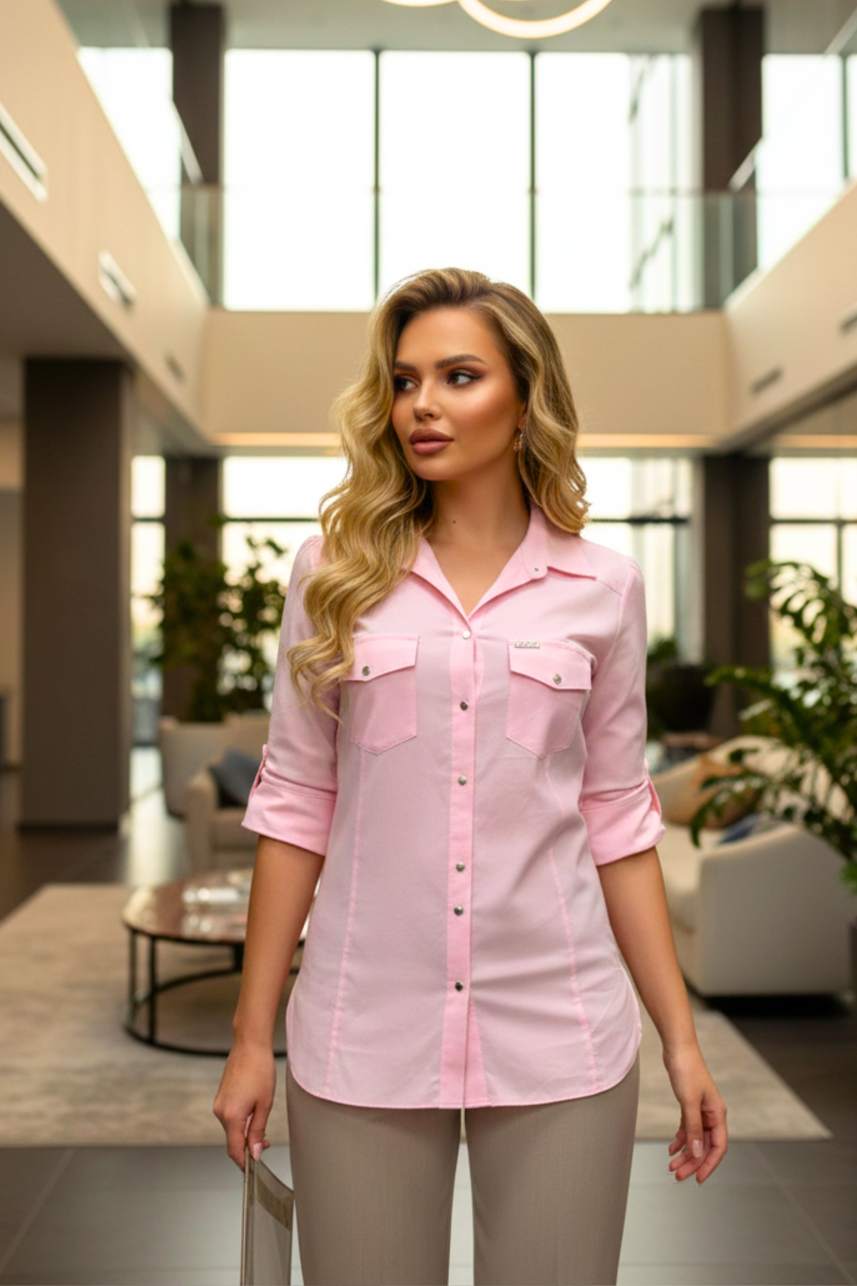 Blue Nature női ing, rózsaszín színben, patentos záródással, 3/4-es ujjhosszal, zsebekkel, karcsúsított fazonban, elején rávarrt fém márkajelzéssel.