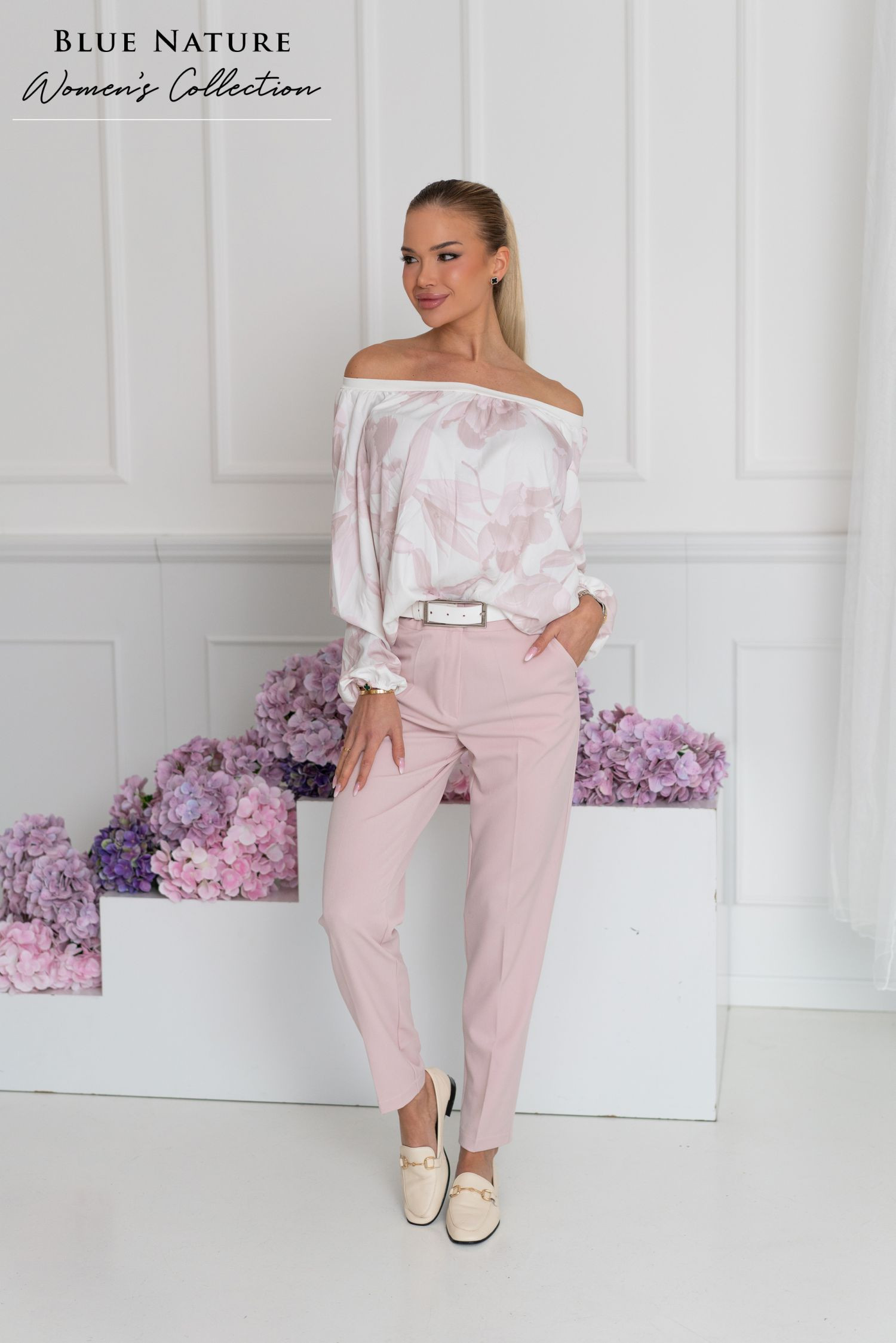 Blue Nature női szivar nadrág, pasztell rózsaszín színben, magas övbújtatós derékrésszel, svédzsebekkel, elején gombos és cipzáros záródással, zsebénél rávarrt fém márkajelzéssel.