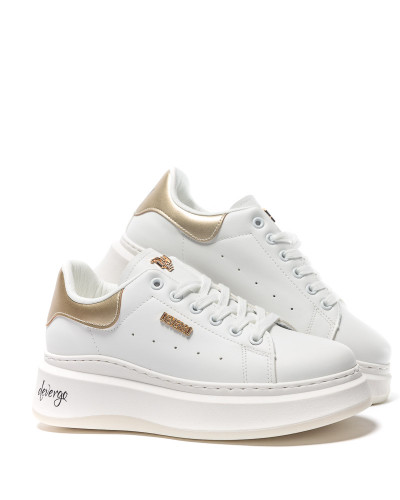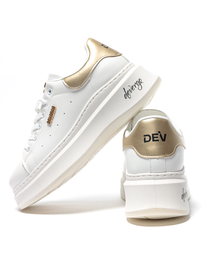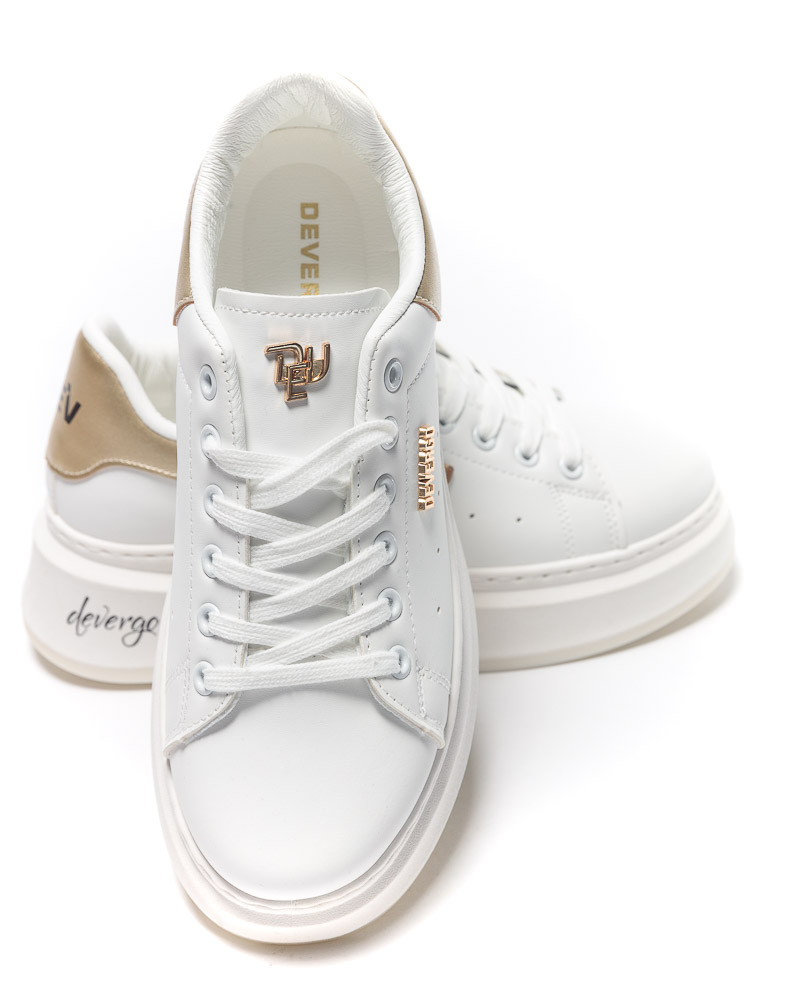 DevergoJeans női sneaker műbőr anyagból, fehér színben, magasított, gumis talprésszel, fűzős kialakítású felsőrésszel, nyelvén, külső oldalán, talpán és sarkán arany színű fém, illetve filmnyomott márkajelzésekkel.