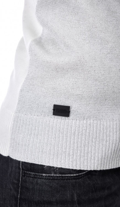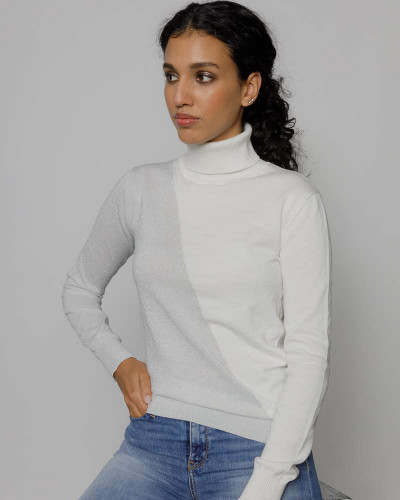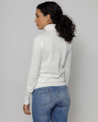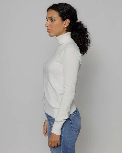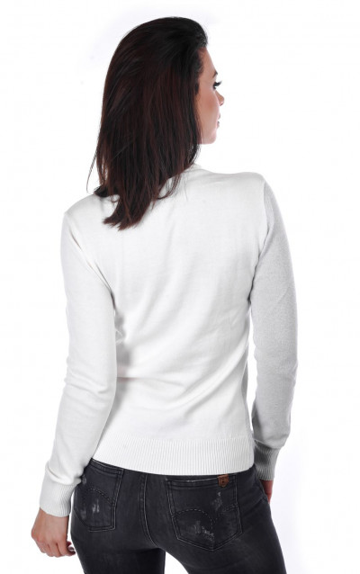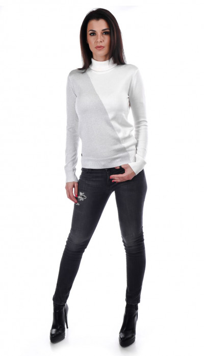 Devergo női vékony kötött hosszú ujjú garbós felső, fehér színben, bordázott passzékkal, lurex szálakkal, alján szilikon márkajelzéssel az őszi DevergoJeans kollekcióból.