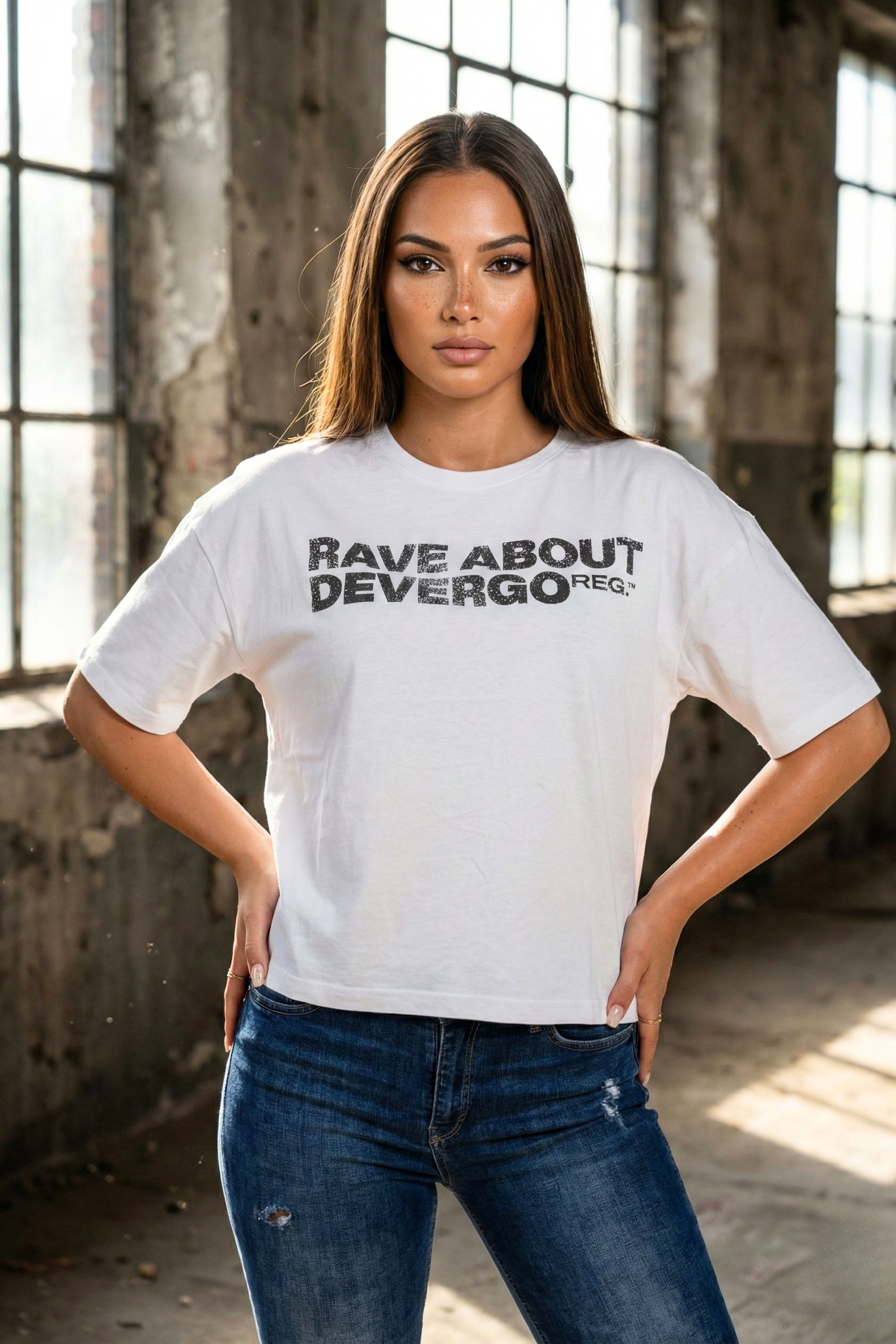 DevergoJeans női póló, fehér színben, laza fazonban, kerek nyakkivágással, ejtett vállal, oldalán rávarrt textil márkajelzéssel, elején filmnyomott felirattal és márkajelzéssel.