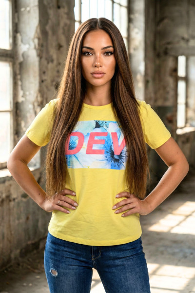 DevergoJeans női póló, citromsárga színben, egyenes szabással, kerek nyakkivágással, elején filmnyomott mintával és márkajelzéssel.