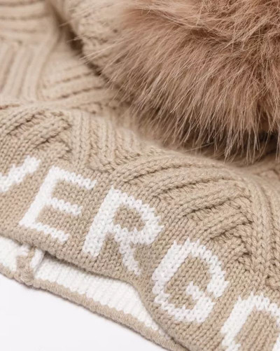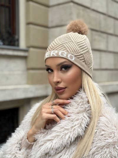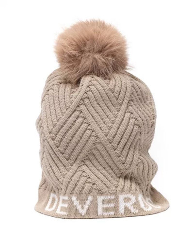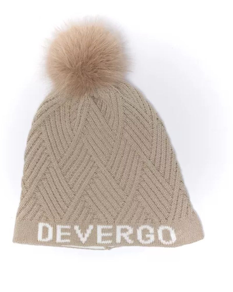 DevergoJeans női kötött bojtos sapka, bézs színben, anyagában márkajelzéssel.