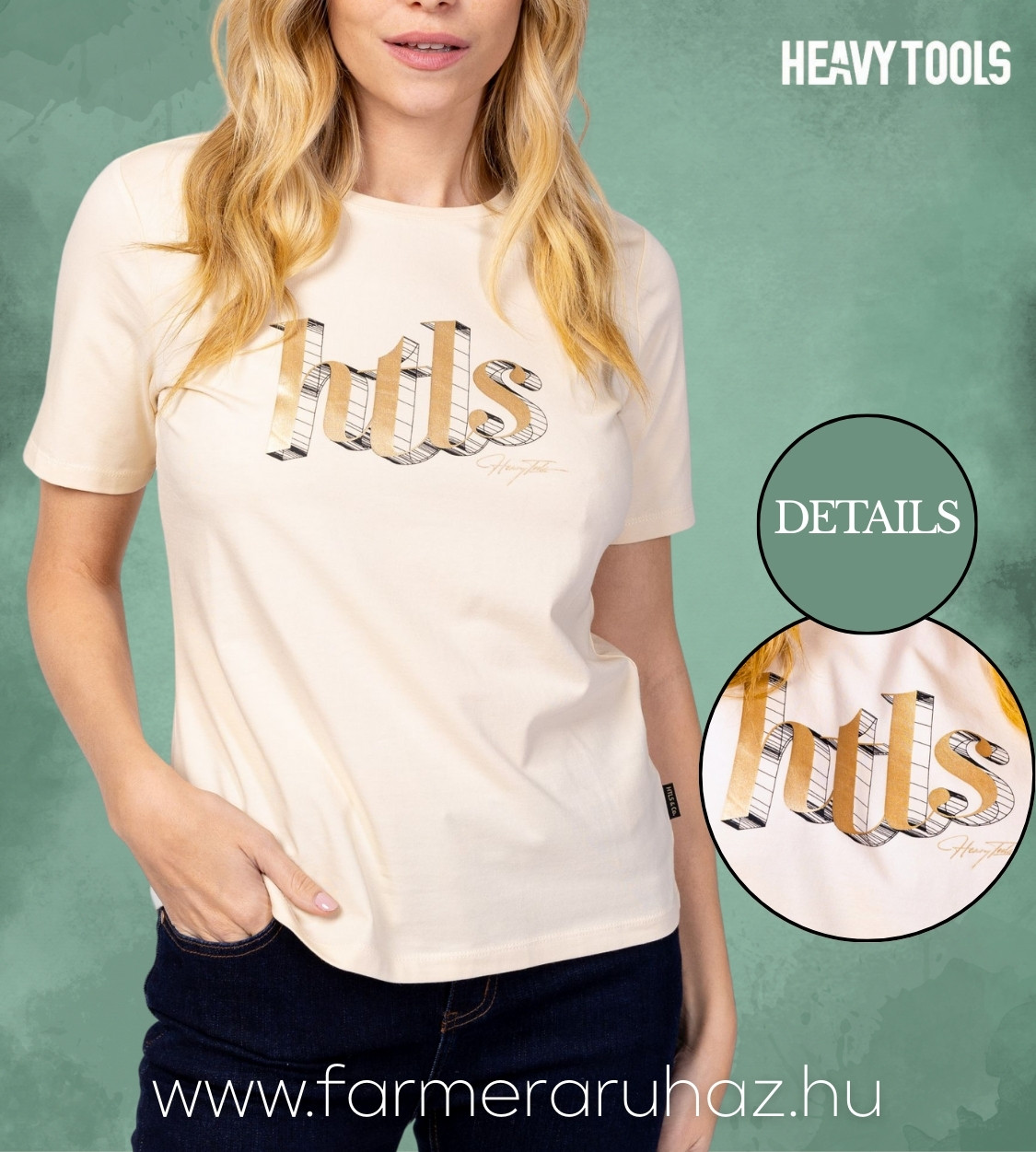 Heavy Tools Női rövid ujjú póló, vanilia sárga színben, enyhén karcsúsított szabással, kerek nyakkal, elasztánnal kevert pamut anyagból, elején nyomott márkajelzéssel, oldalában szövött címkével.