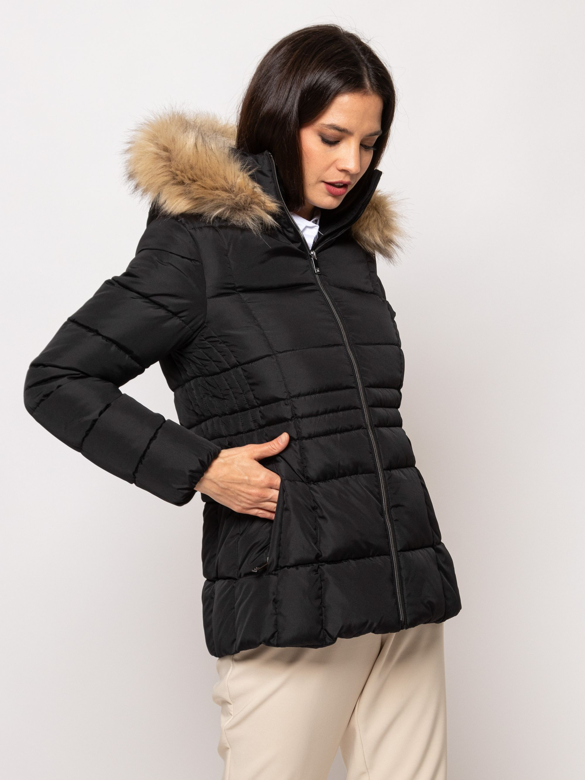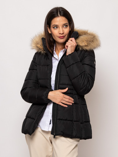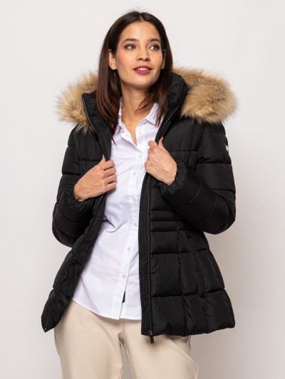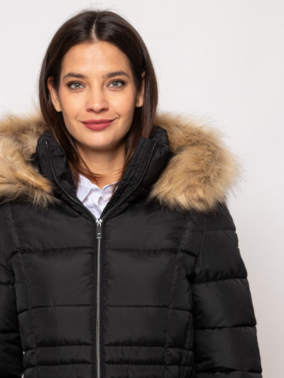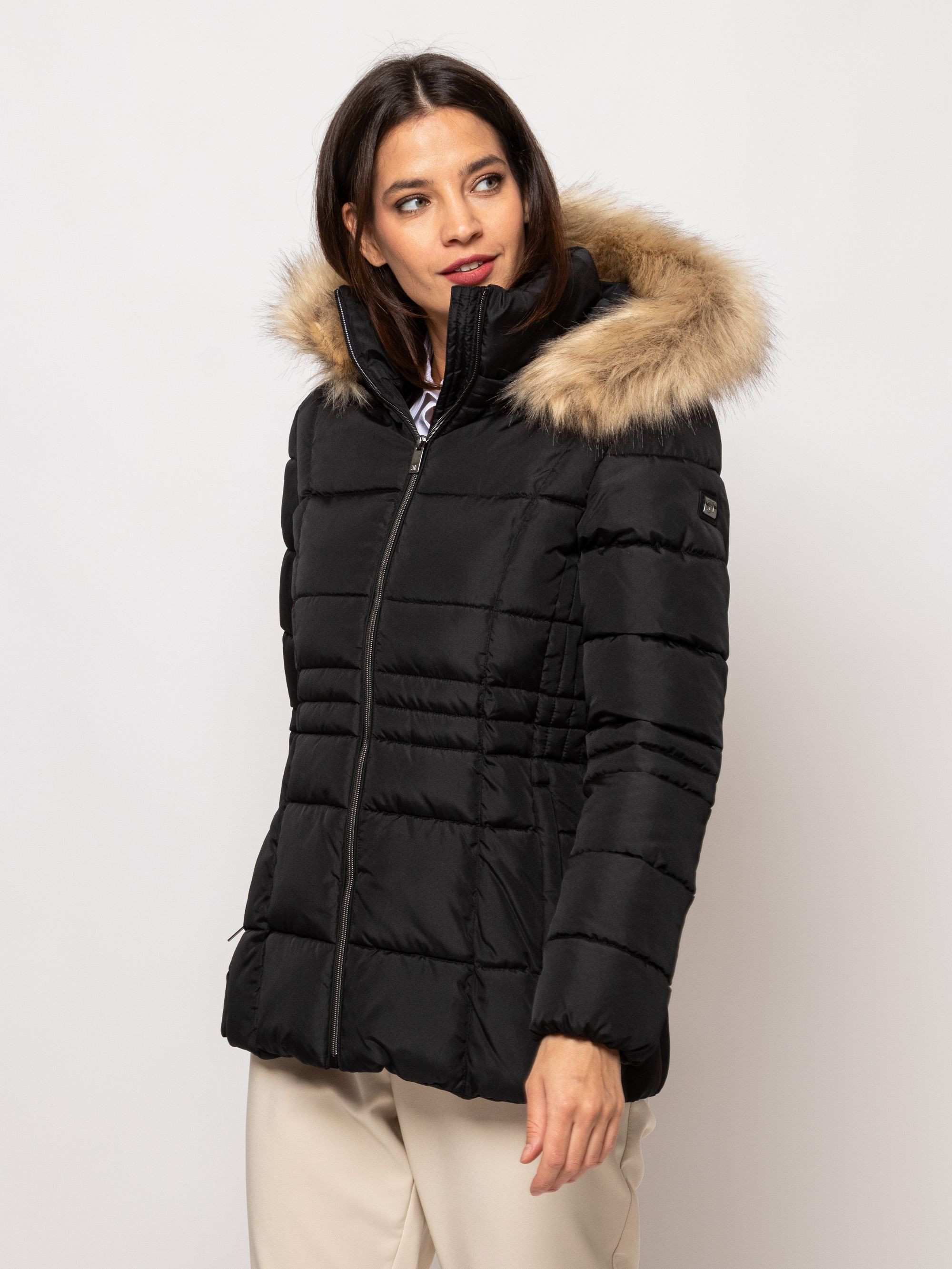 Heavy Tools női steppelt, karcsúsított kabát, fekete színben, levehető szőrmés kapucnival, elején cipzáras záródással, cipzáras oldalzsebekkel, ujján fém márkajelzéssel.