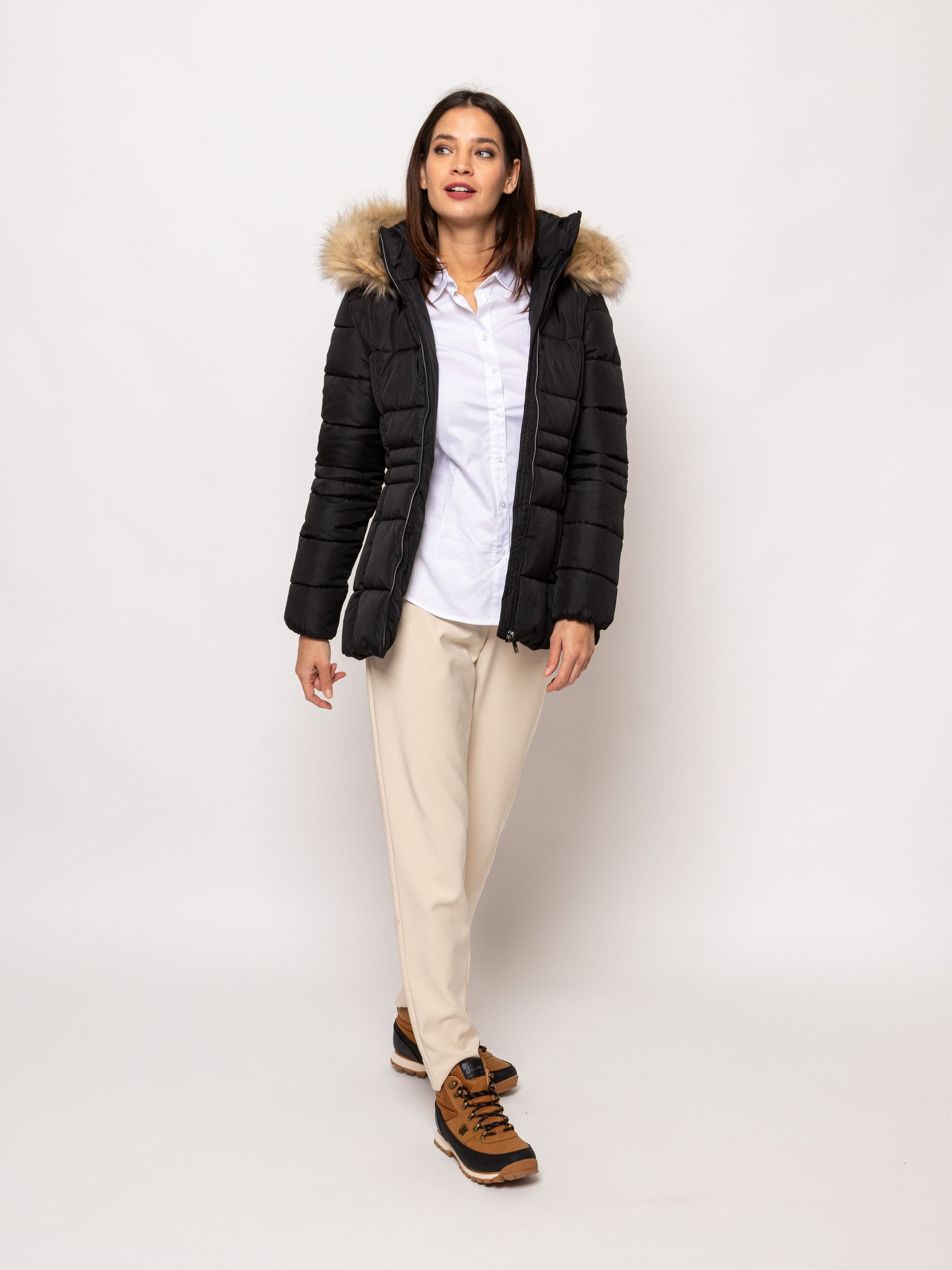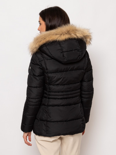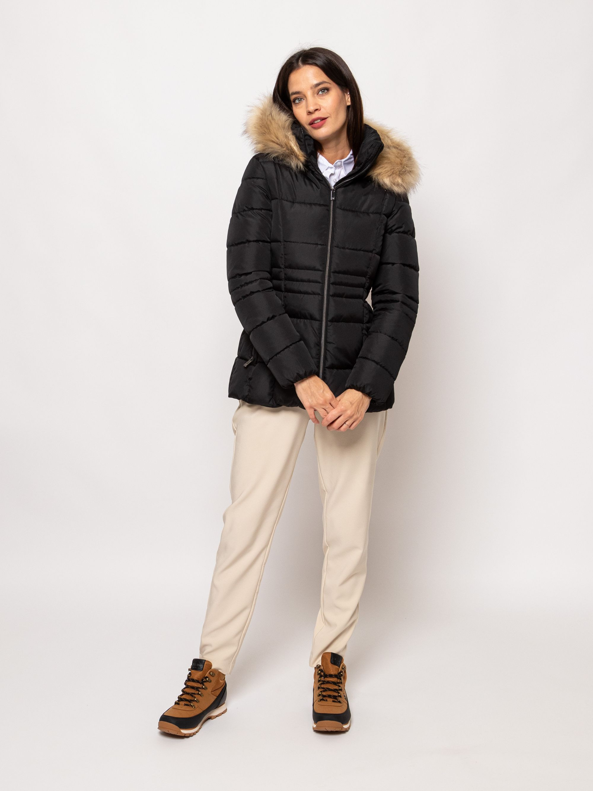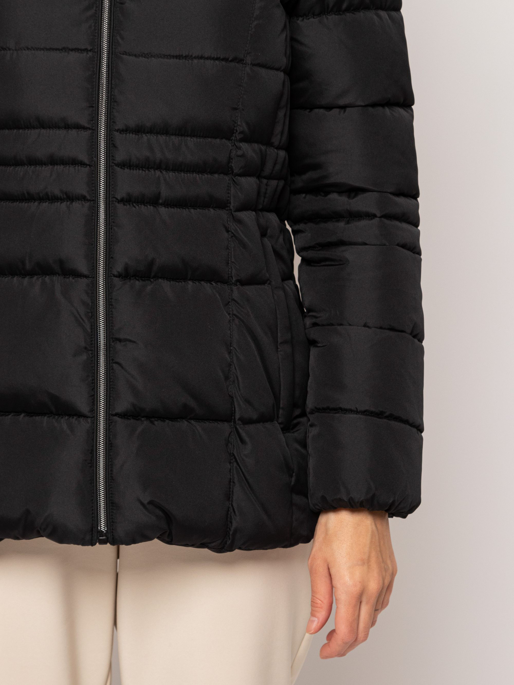 Heavy Tools női steppelt, karcsúsított kabát, fekete színben, levehető szőrmés kapucnival, elején cipzáras záródással, cipzáras oldalzsebekkel, ujján fém márkajelzéssel.