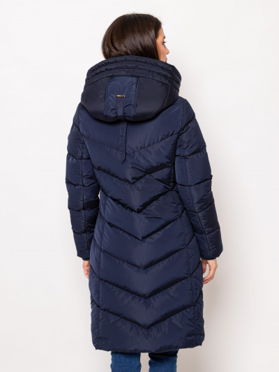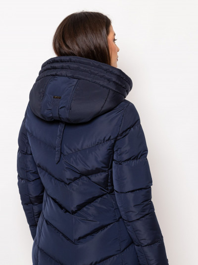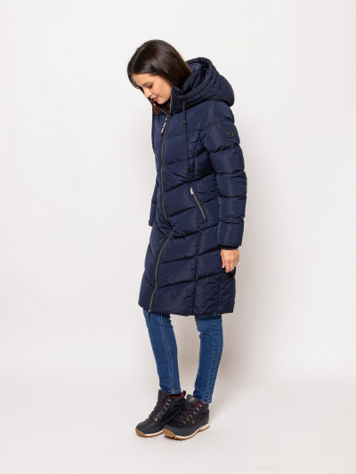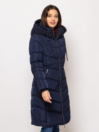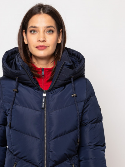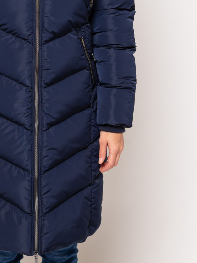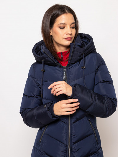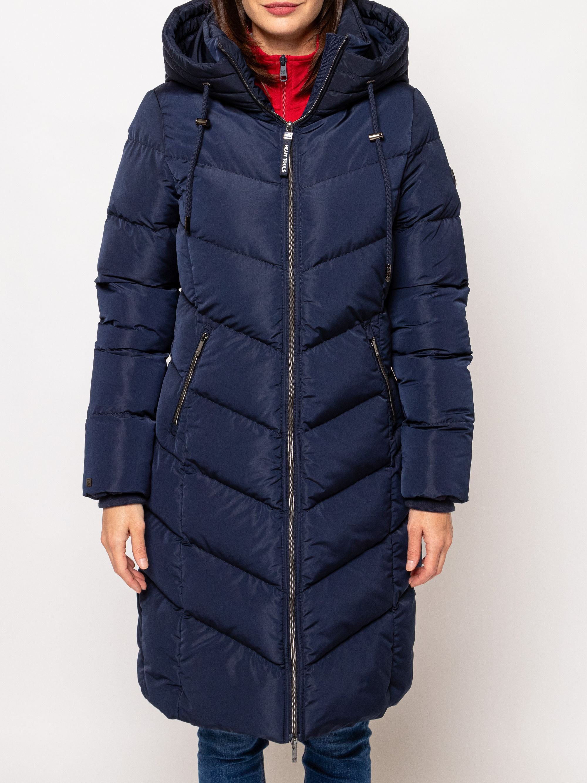 Heavy Tools női steppelt kabát sötétkék színben, térdig érő hosszúsággal,vízlepergető külső réteggel, elején cipzáros záródással és belső szélfogóval, ujja végén bordázott kézelővel, fix kapucnival, cipzáras oldalzsebekkel, ujján márkajelzéssel az őszi/téli Heavy Tools kollekcióból.
