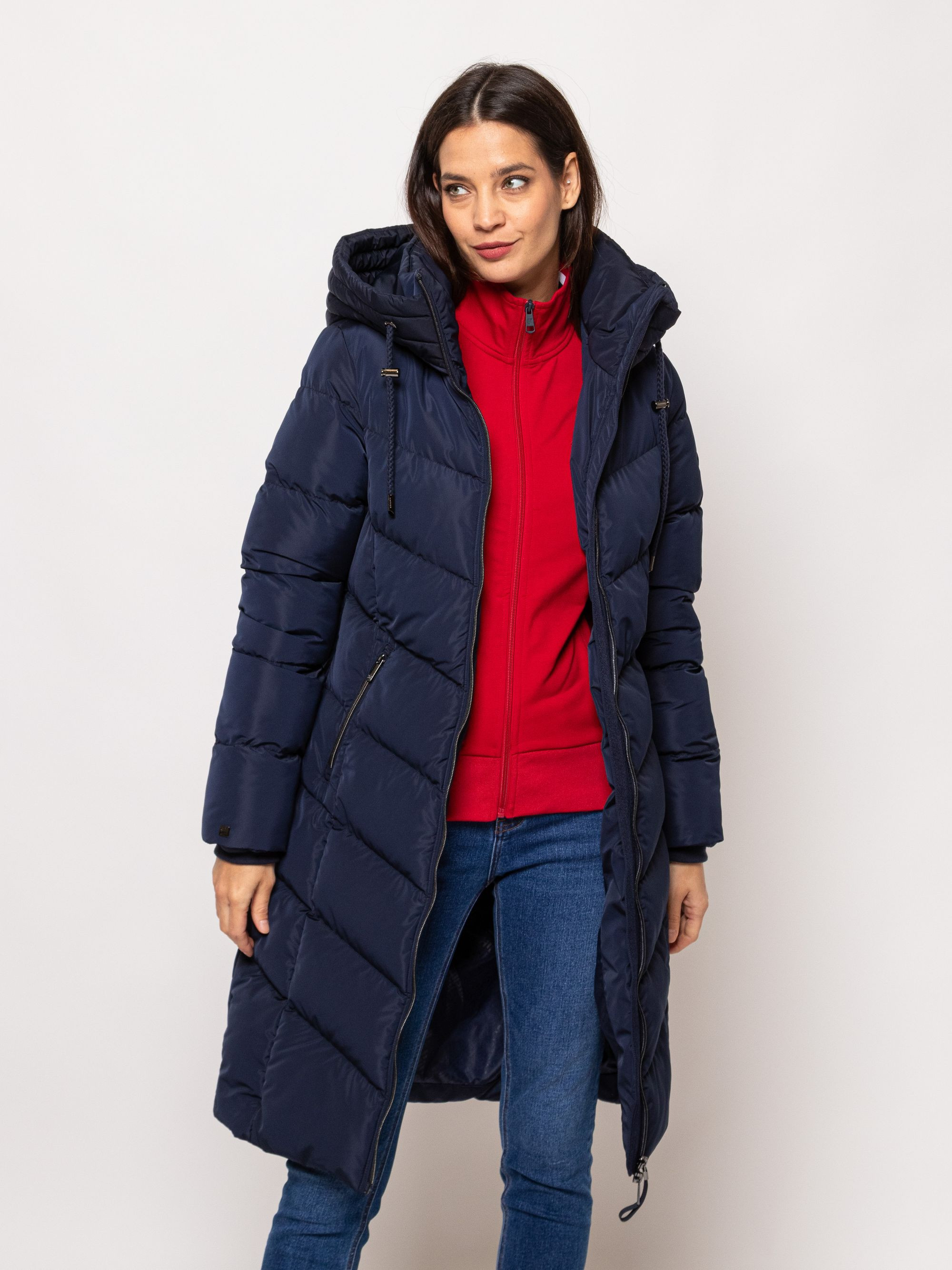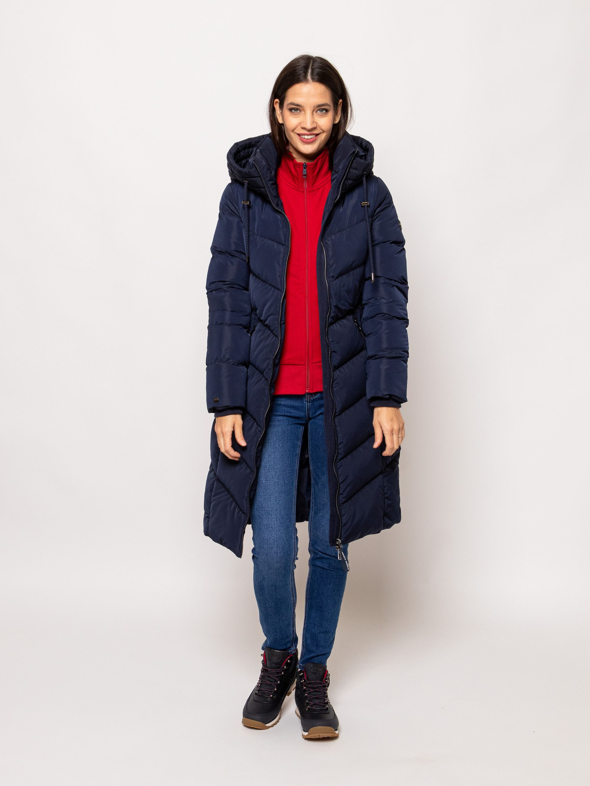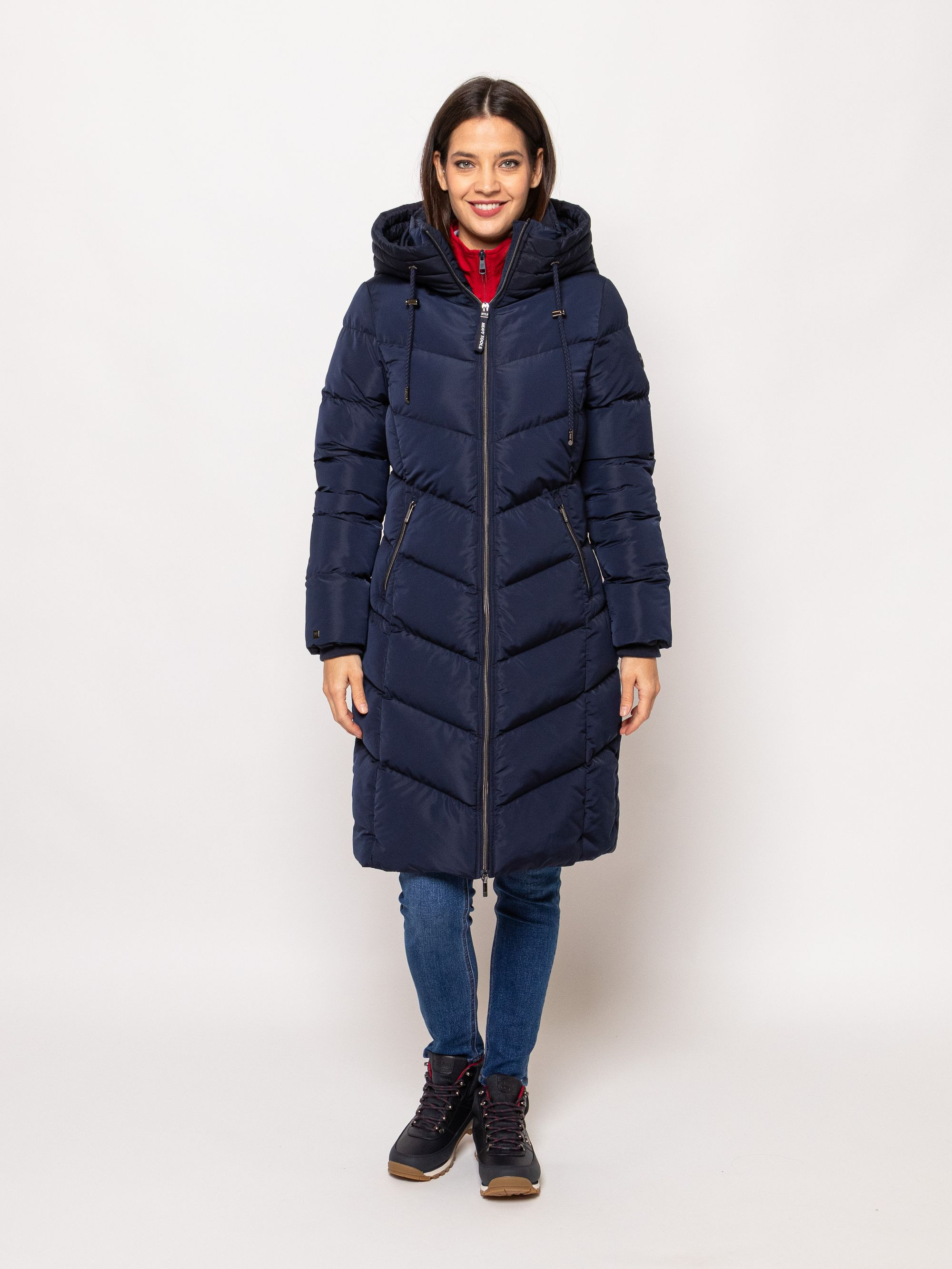 Heavy Tools női steppelt kabát sötétkék színben, térdig érő hosszúsággal,vízlepergető külső réteggel, elején cipzáros záródással és belső szélfogóval, ujja végén bordázott kézelővel, fix kapucnival, cipzáras oldalzsebekkel, ujján márkajelzéssel az őszi/téli Heavy Tools kollekcióból.