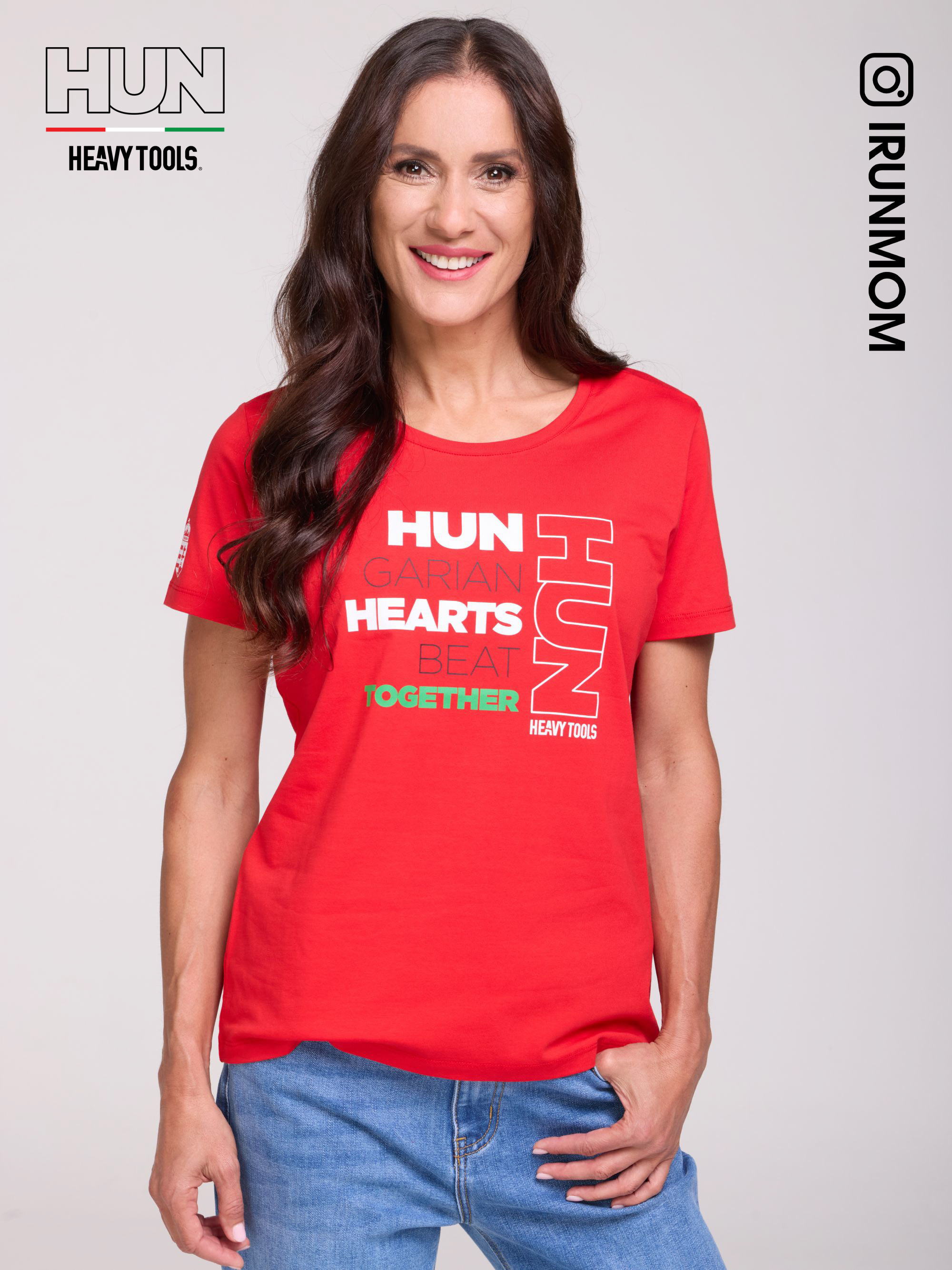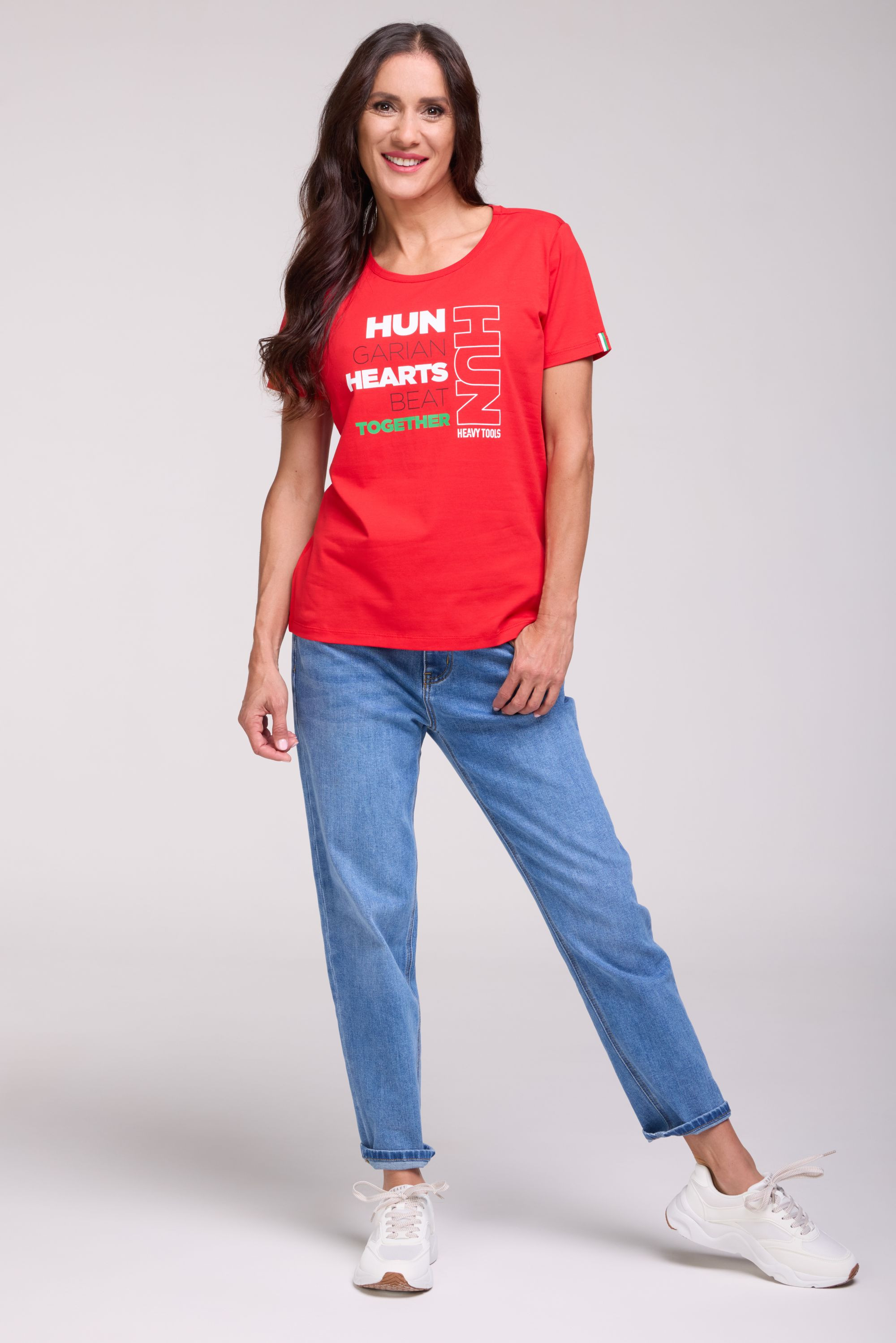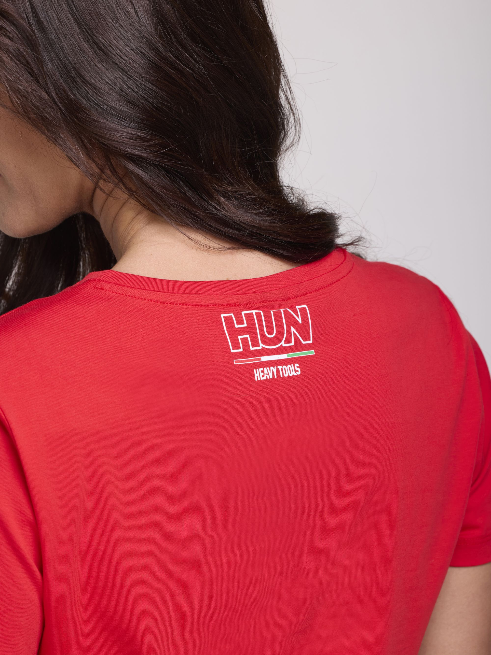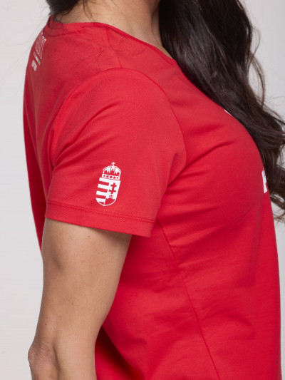 Heavy Tools női szurkolói felső, piros színben, testhezálló fazonnal, nemzeti színű felirattal és márkajelzéssel az elején, kis nemzeti nyomással a hátán, nemzeti címerrel az ujján, nemzeti szalaggal a kézelőn.