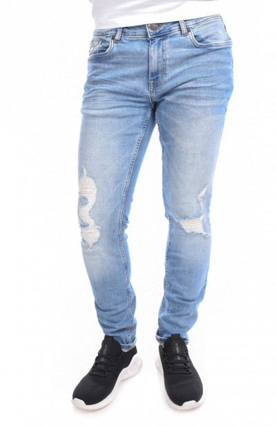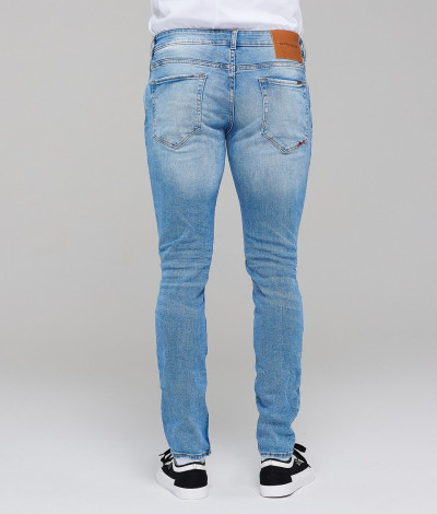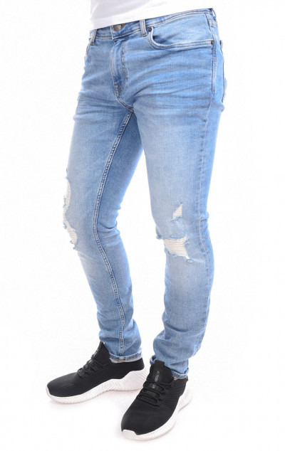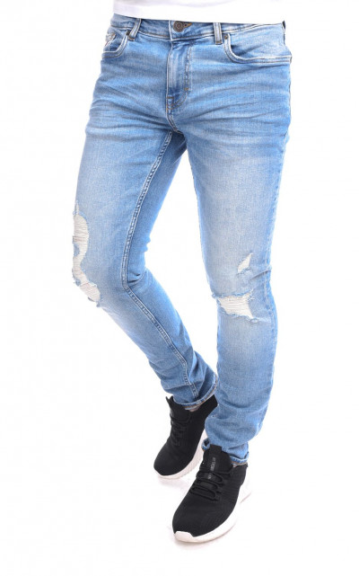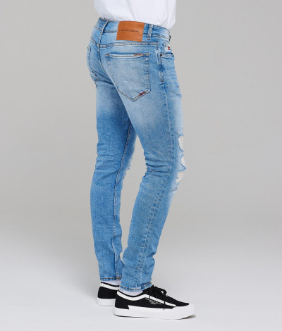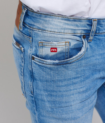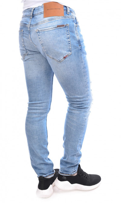 RetroJenas férfi farmernadrág, világos farmerkék színben, skinny fazonú, cipzáras és gombos záródással, övbújtatós derékrésszel, klasszikus ötzsebes, koptatott és szaggatott fazonban, oldal- és farzsebes, derekán szilikon, - farzsebén hímzett, - kis zsebén fém márkajelzéssel a tavaszi/nyári Retro Jeans kollekcióból.