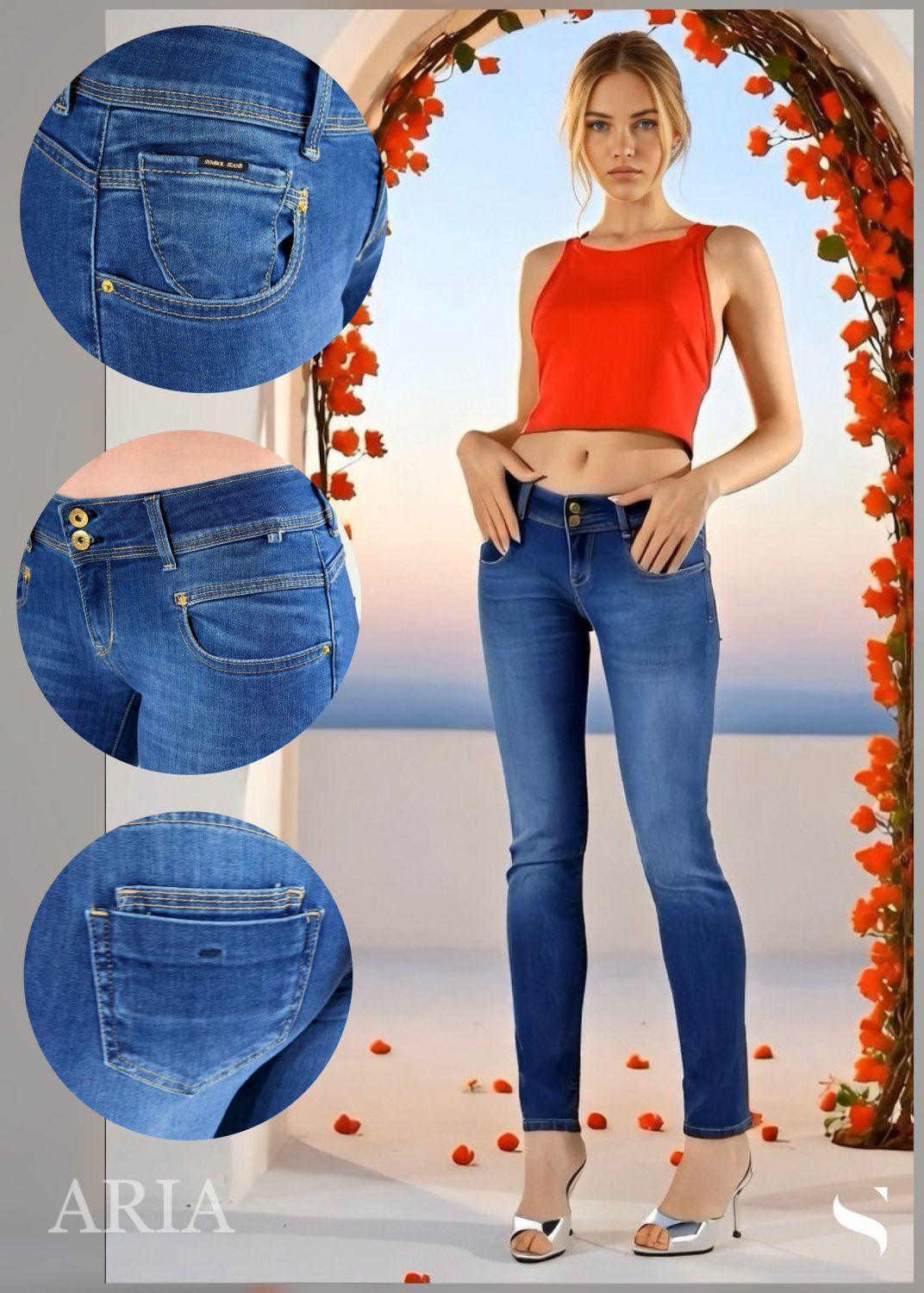 SymbolJeans női elasztikus skinny fazonú farmernadrág, koptatott középkék színben, középmagas derékkal, klasszikus ötzsebes, övbújtatós derékrésszel, gombos és cipzáros záródással, kontrasztos dísztűzésekkel, feneket formáló szabással, zsebén fém-, derekán rávarrt márkajelzéssel.