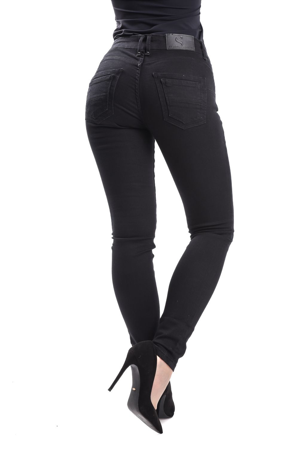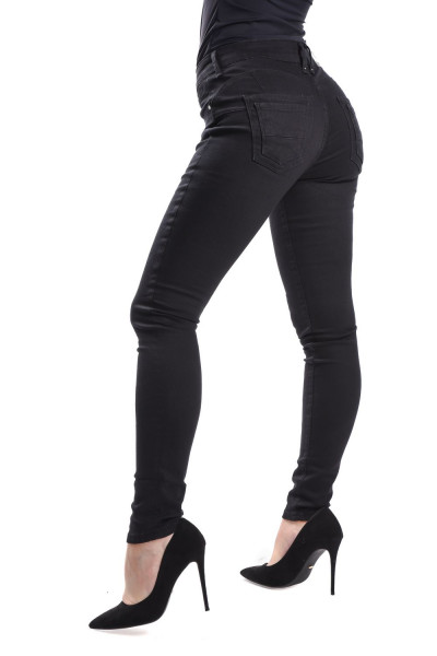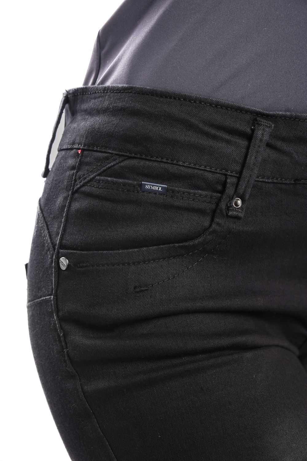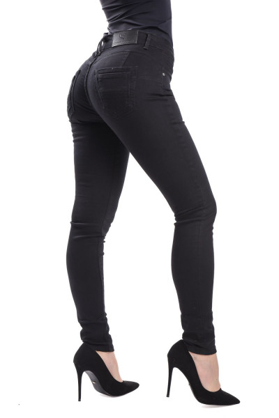 SymbolJeans női elasztikus skinny farmernadrág; fekete színben; feneket formáló szabással; övbújtatós derékrésszel; elején gombos és cipzáros záródással; zsebekkel; márkajelzett fémkellékekkel, derekán bőrhatású-, zsebén fém márkajelzéssel.