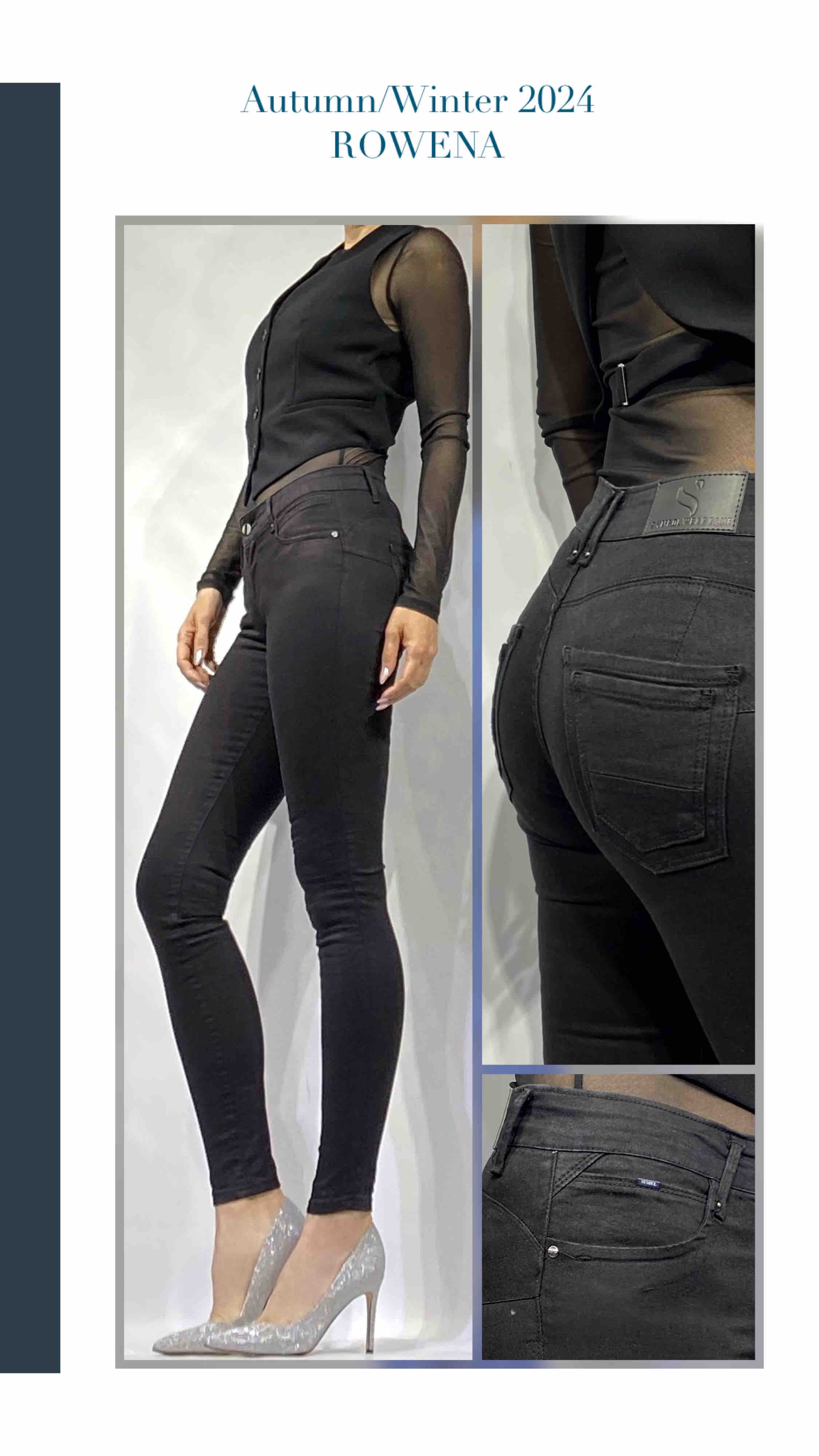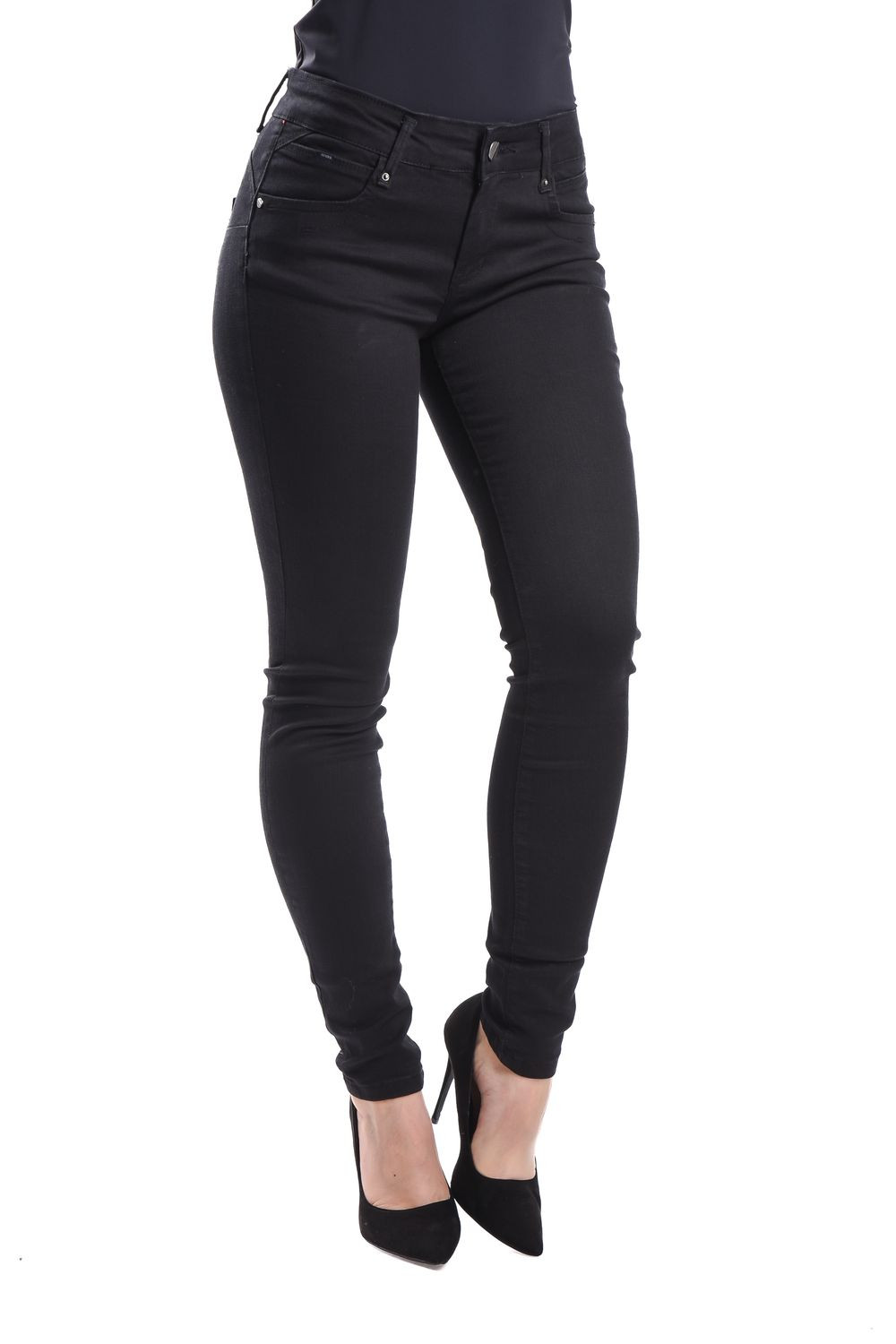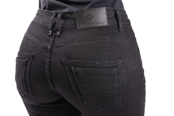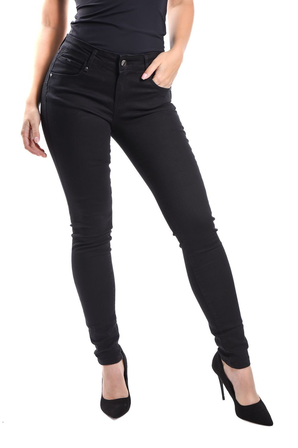 SymbolJeans női elasztikus skinny farmernadrág; fekete színben; feneket formáló szabással; övbújtatós derékrésszel; elején gombos és cipzáros záródással; zsebekkel; márkajelzett fémkellékekkel, derekán bőrhatású-, zsebén fém márkajelzéssel.