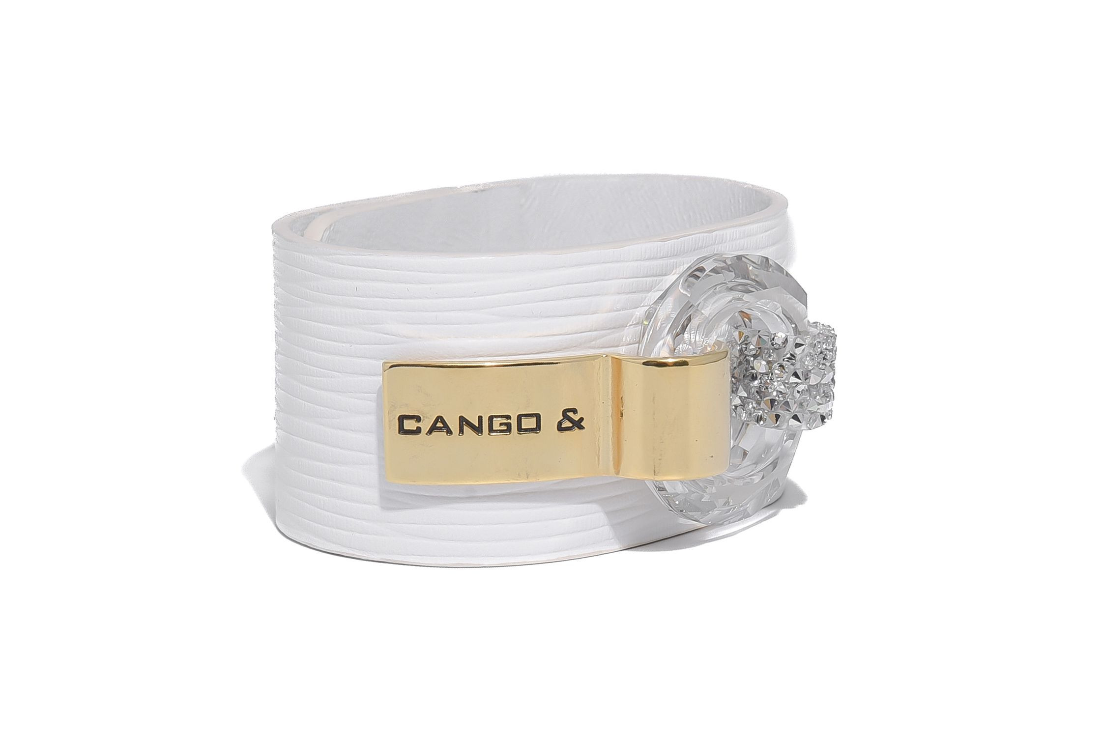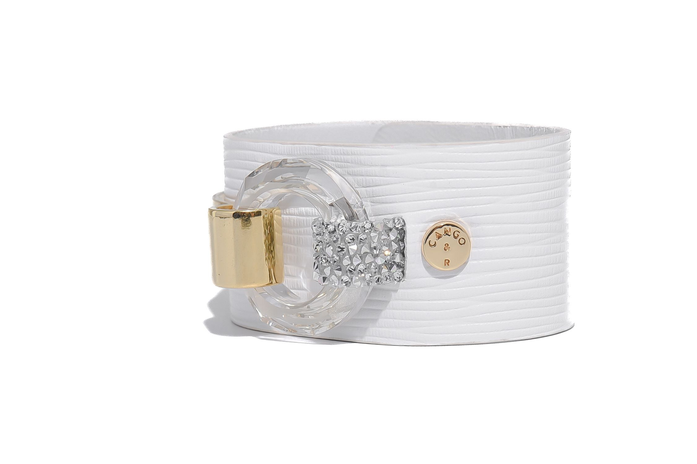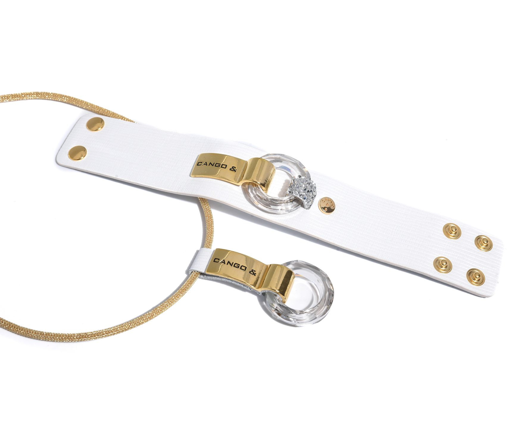 Cango&Rinaldi karkötő texturált fehér színű minőségi olasz bőrből, amelyet középen egy arany színű fém foglalatban különleges csiszolású kör alakú fehér kő és fehér (001) szilánk formájú Crystal Rock Swarovski kristályok díszítenek. A fémkellékeken lévő gravírozott Cango& és Cango&R márka feliratok jelölik a brand eredetiséget és minőséget.