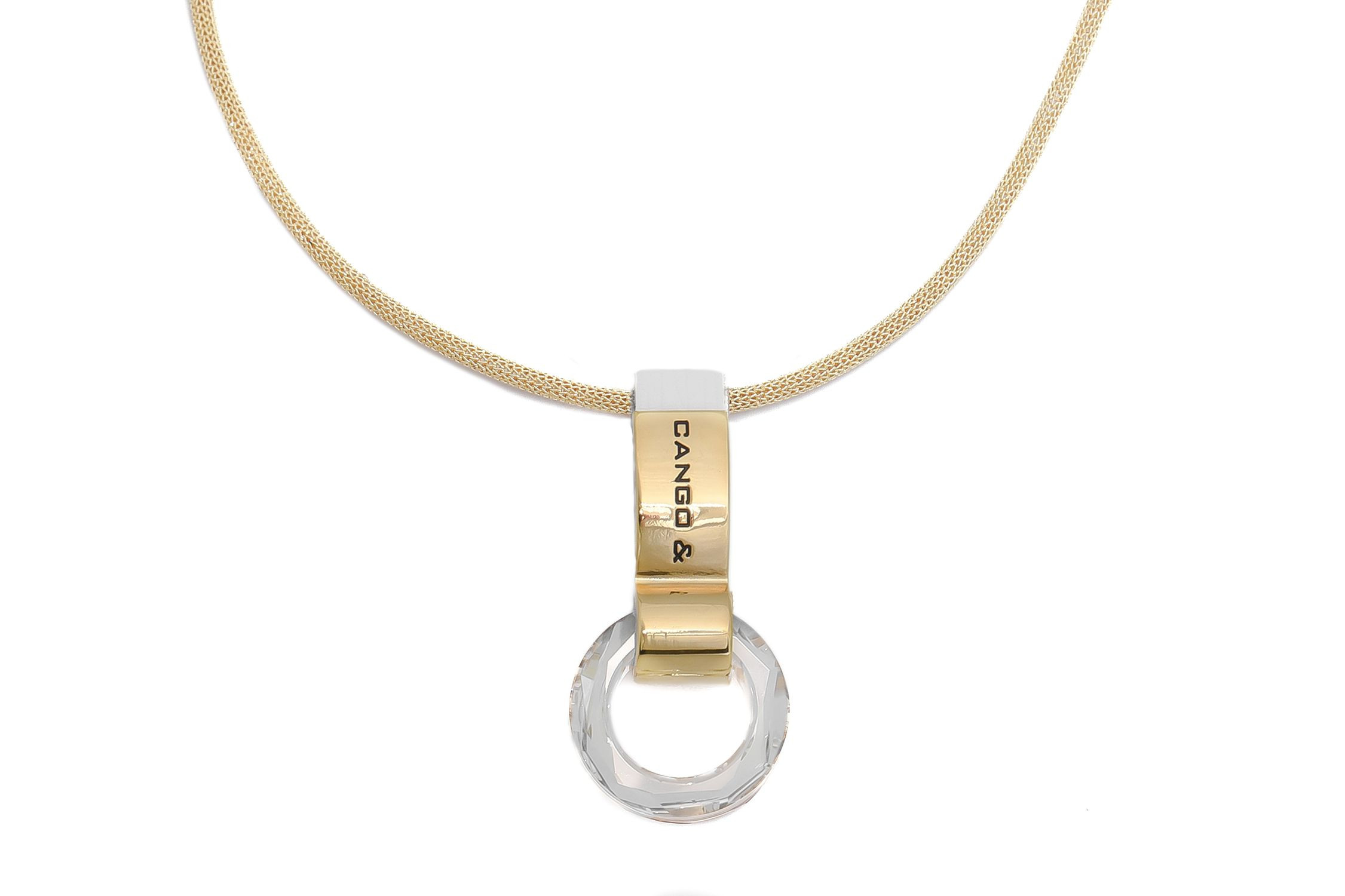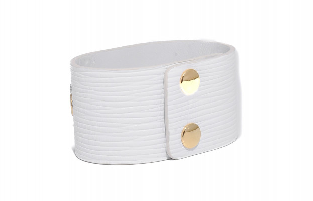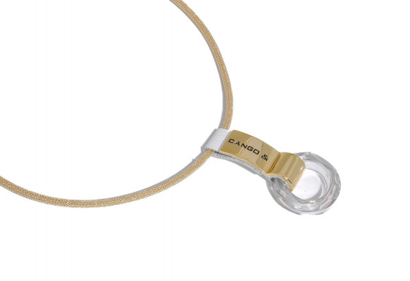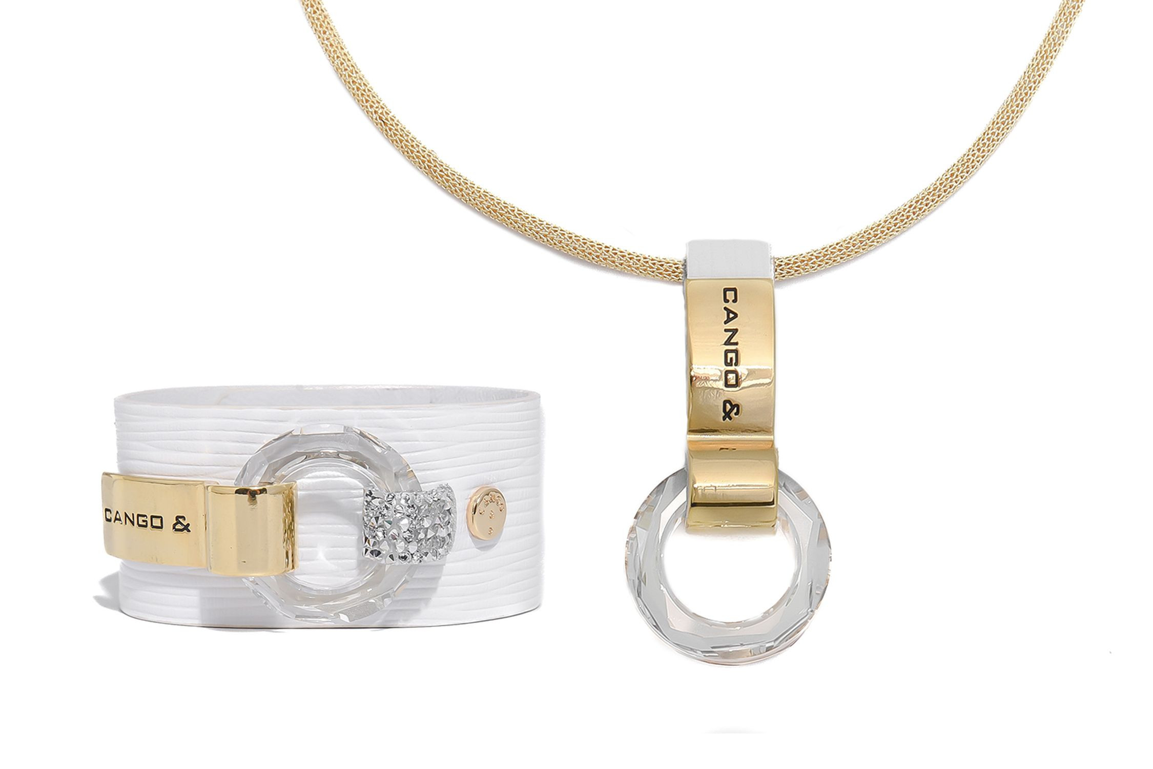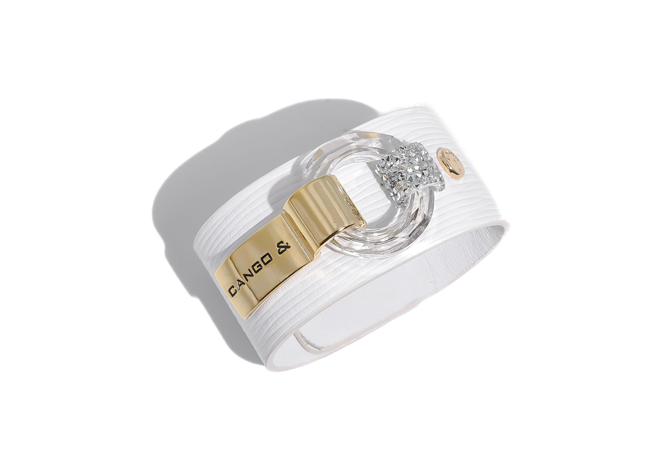 Cango&Rinaldi karkötő texturált fehér színű minőségi olasz bőrből, amelyet középen egy arany színű fém foglalatban különleges csiszolású kör alakú fehér kő és fehér (001) szilánk formájú Crystal Rock Swarovski kristályok díszítenek. A fémkellékeken lévő gravírozott Cango& és Cango&R márka feliratok jelölik a brand eredetiséget és minőséget.