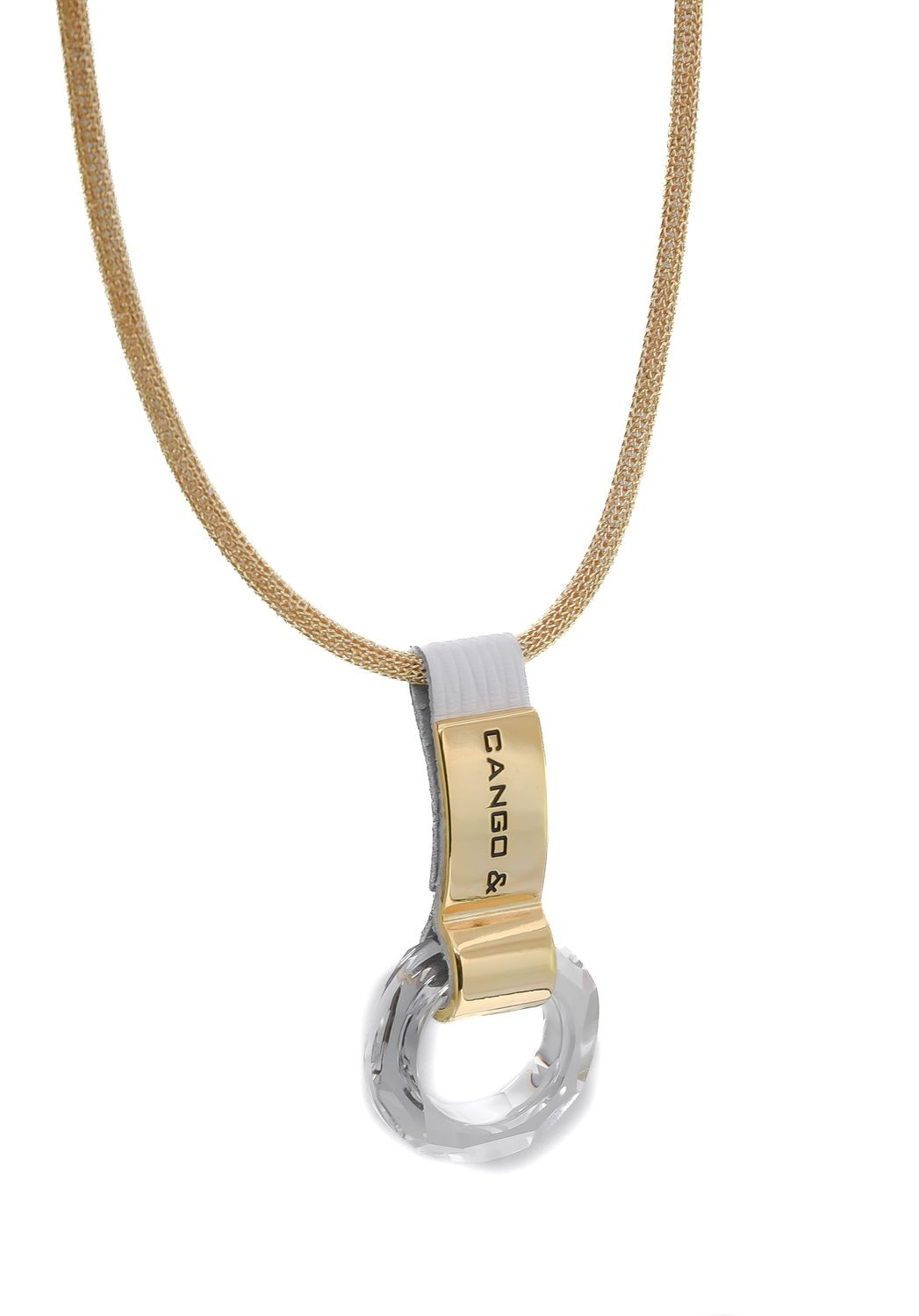 Cango&Rinaldi nyaklánc arany színű huzalból, amelyet texturált fehér színű minőségi olasz bőrön arany színű fém foglalatban különleges csiszolású kör alakú fehér színű kő díszít. A fémkellékeken található gravírozott Cango& és Cango&R márkafeliratok jelölik a brand eredetiséget és minőséget.