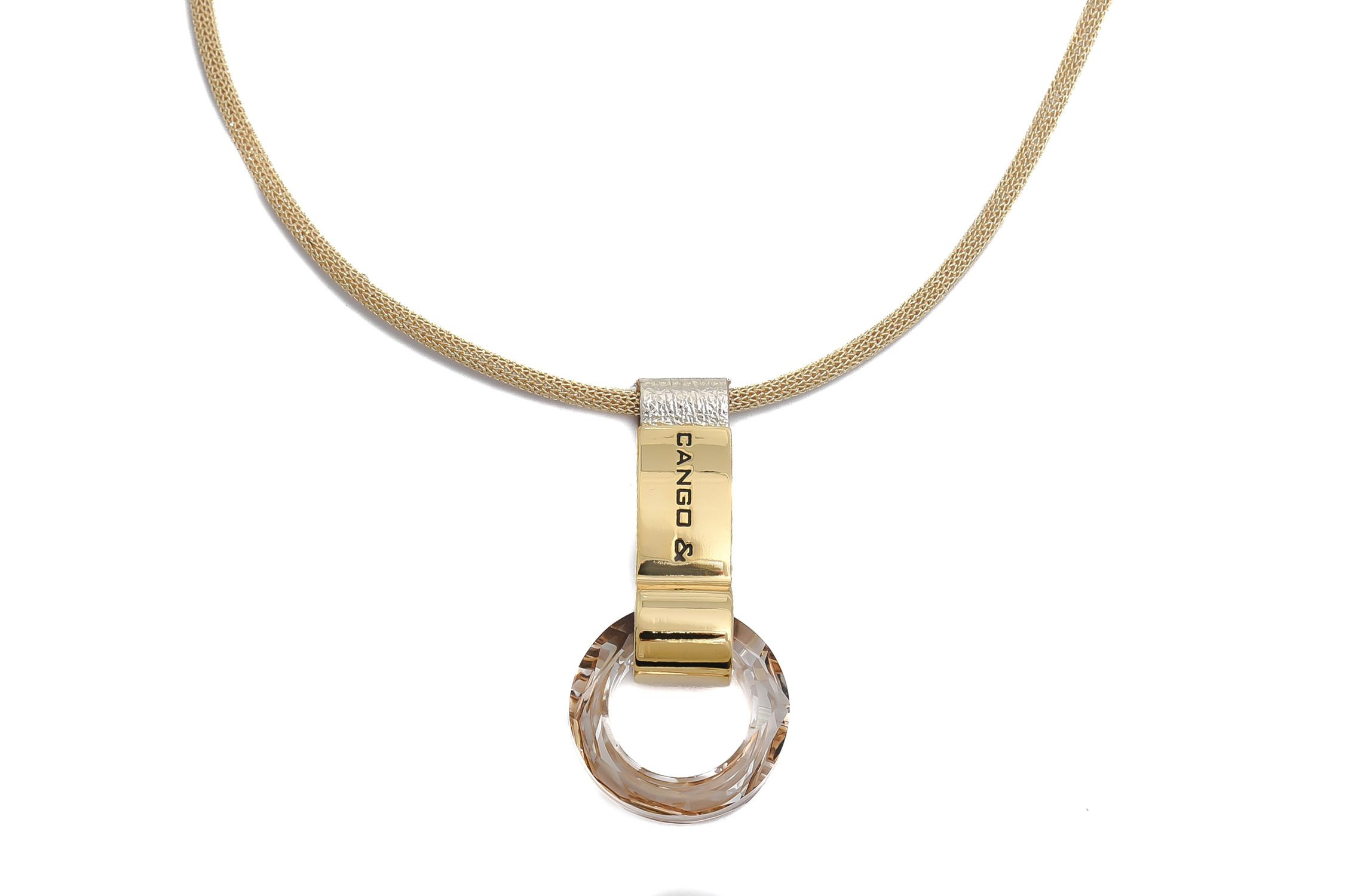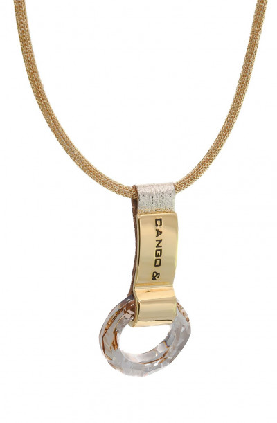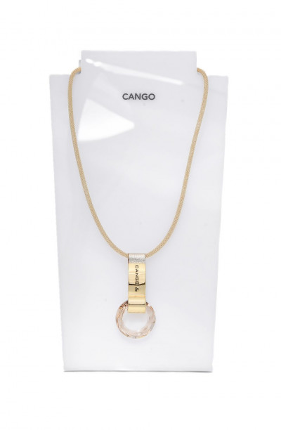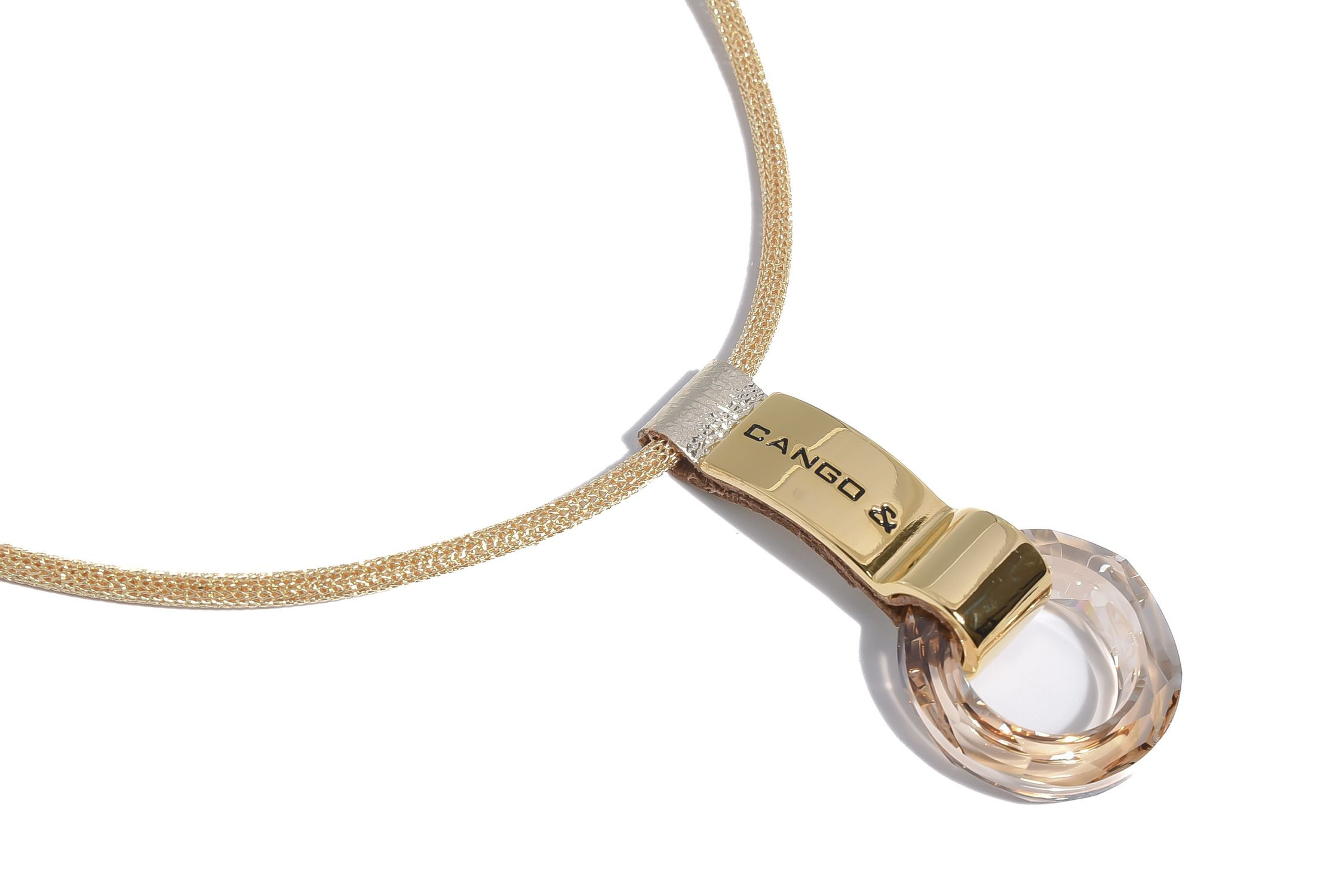 Cango&Rinaldi nyaklánc arany színű huzalból, amelyet texturált világos arany színű minőségi olasz bőrön arany színű fém foglalatban különleges csiszolású kör alakú arany színű kő díszít. A fémkellékeken található gravírozott Cango& és Cango&R márkafeliratok jelölik a brand eredetiséget és minőséget.