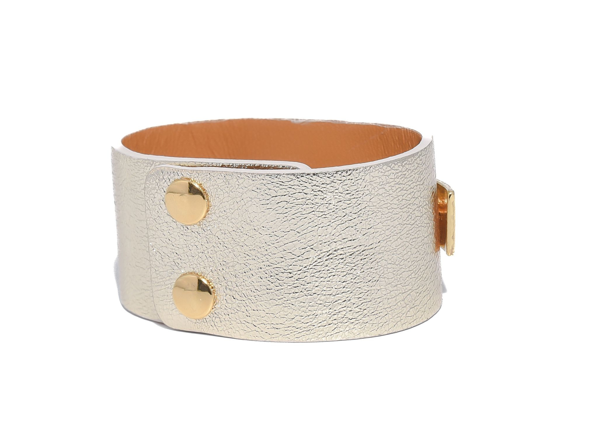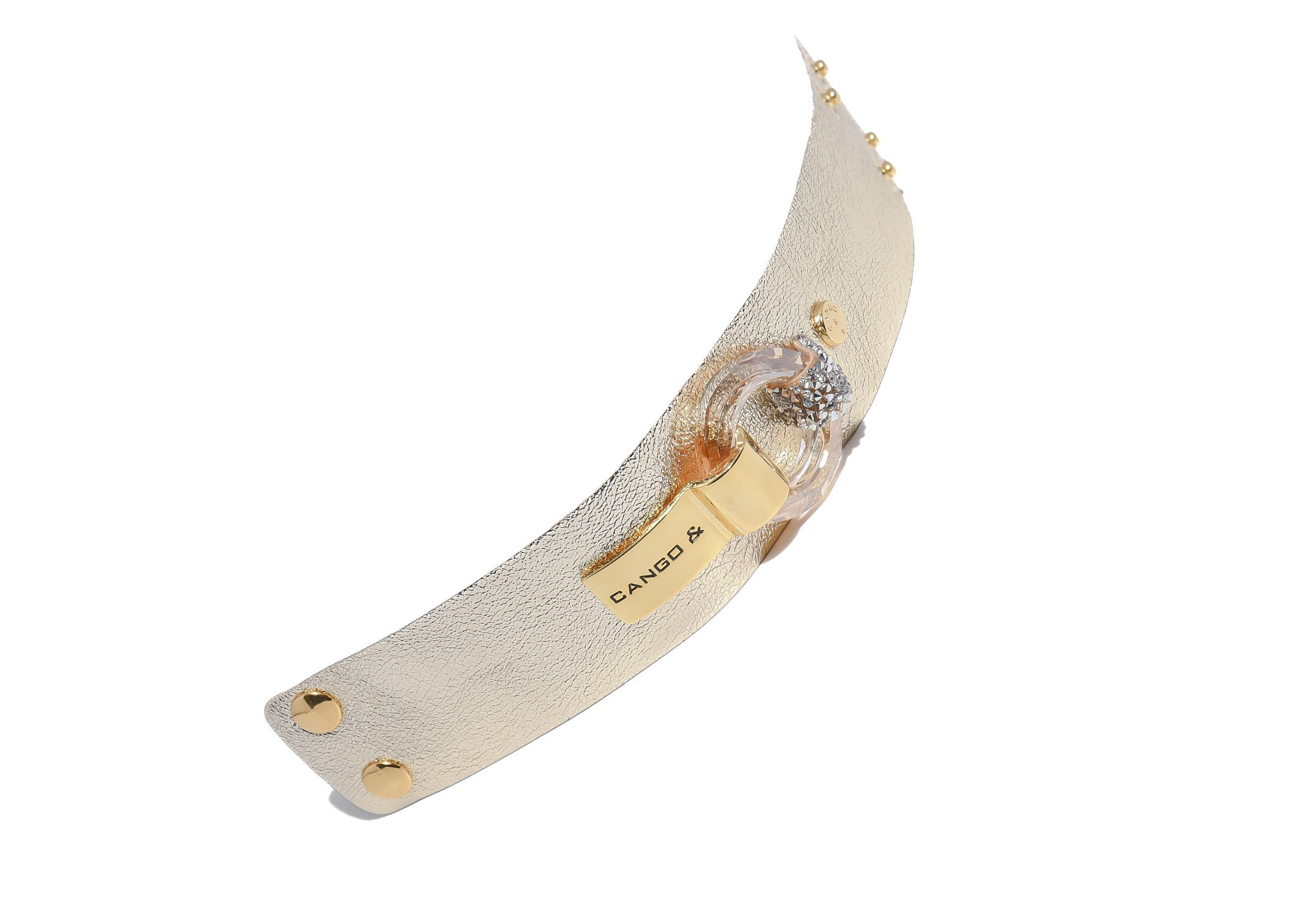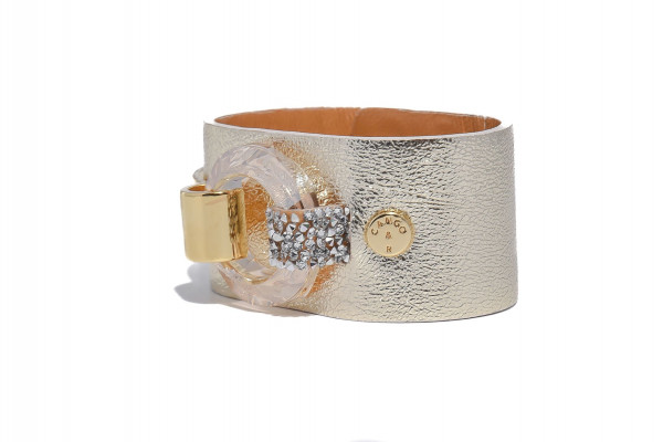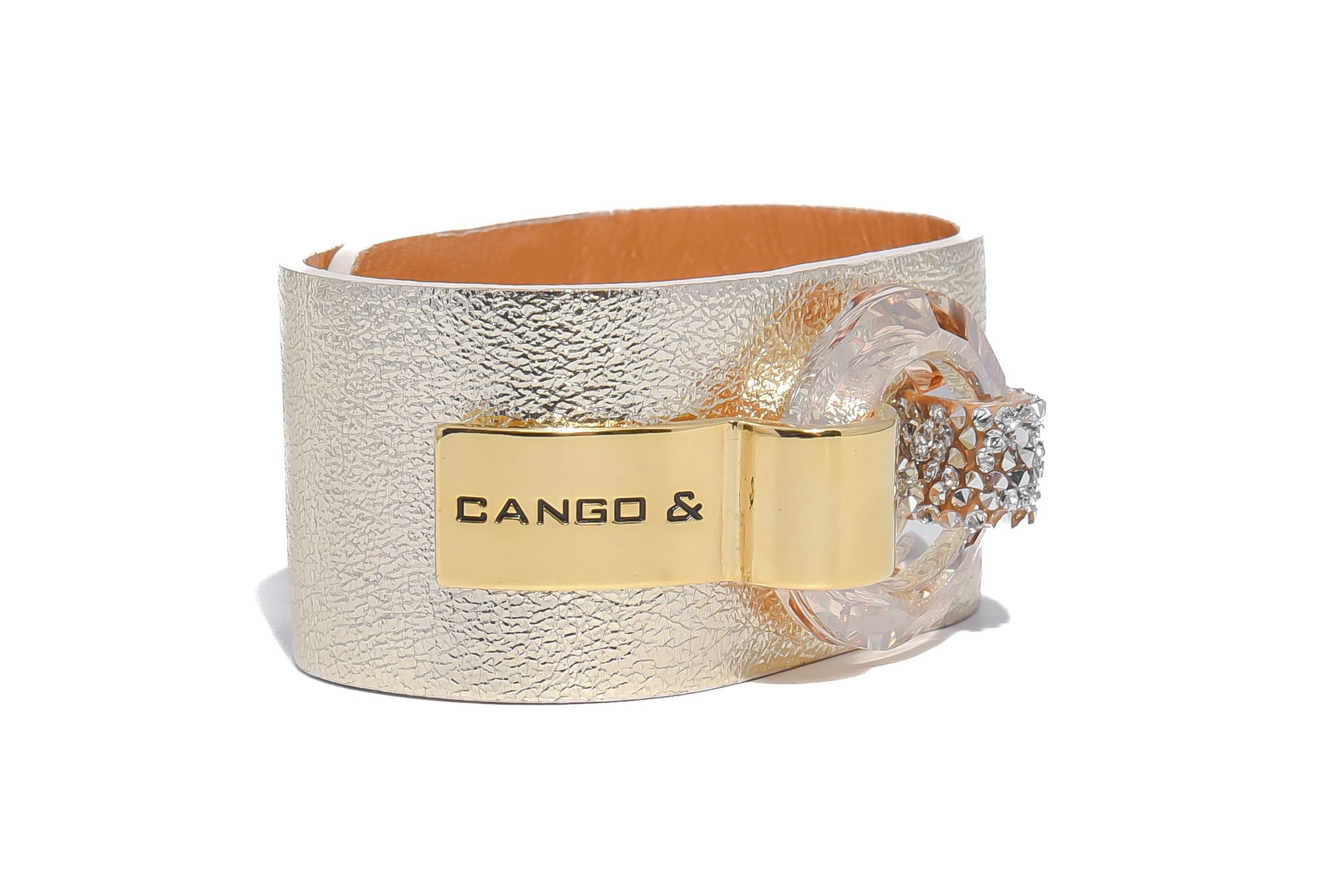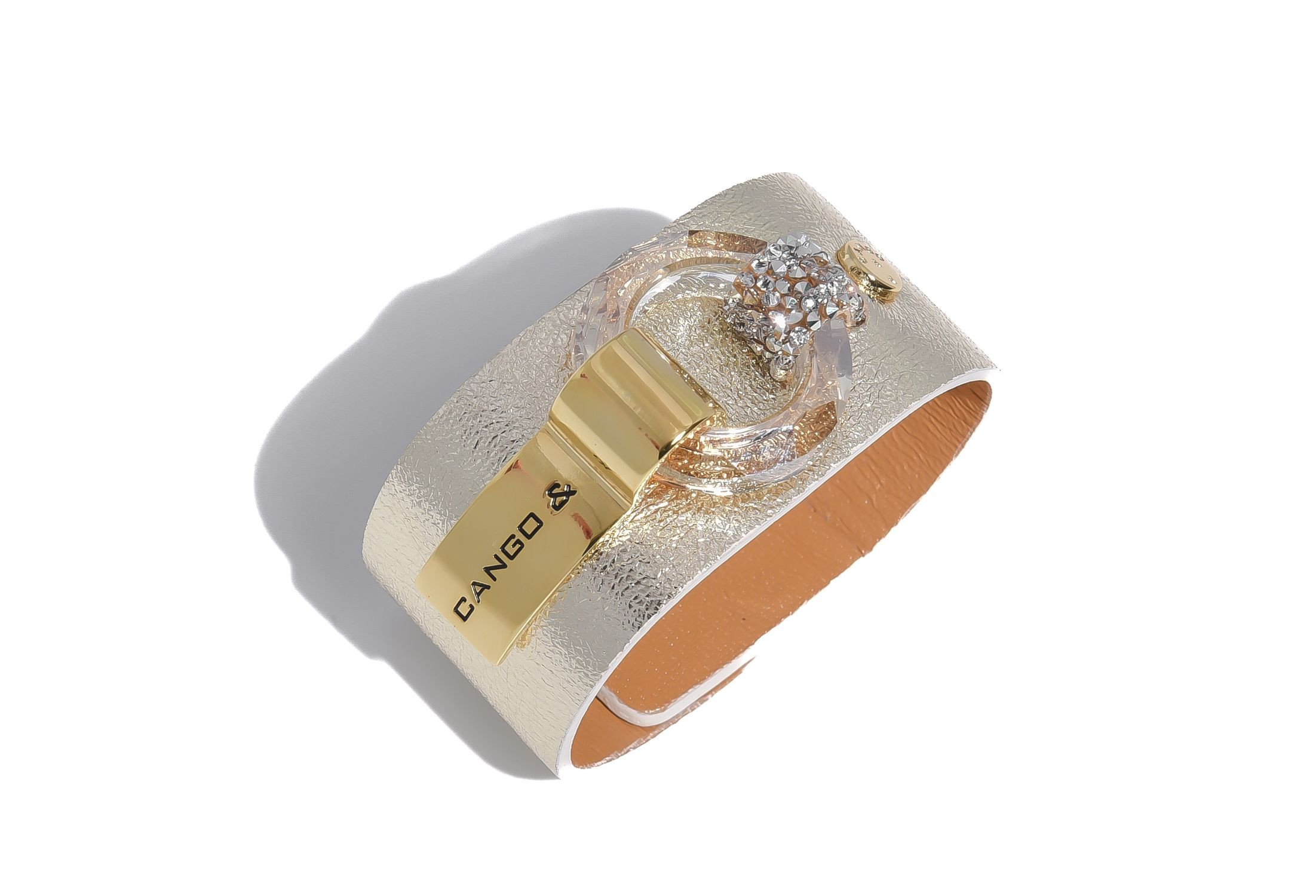 Cango&Rinaldi karkötő világos arany színű minőségi olasz bőrből, amelyet középen egy arany színű fém foglalatban különleges csiszolású kör alakú arany színű kő és fehér (001) szilánk formájú Crystal Rock Swarovski kristályok díszítenek. A fémkellékeken lévő gravírozott Cango& és Cango&R márka feliratok jelölik a brand eredetiséget és minőséget.