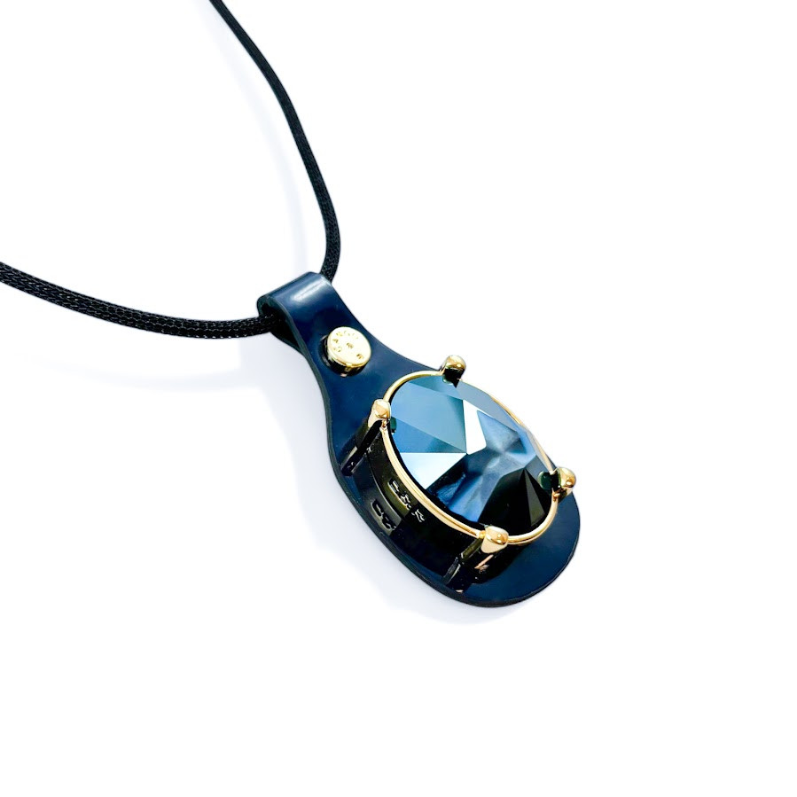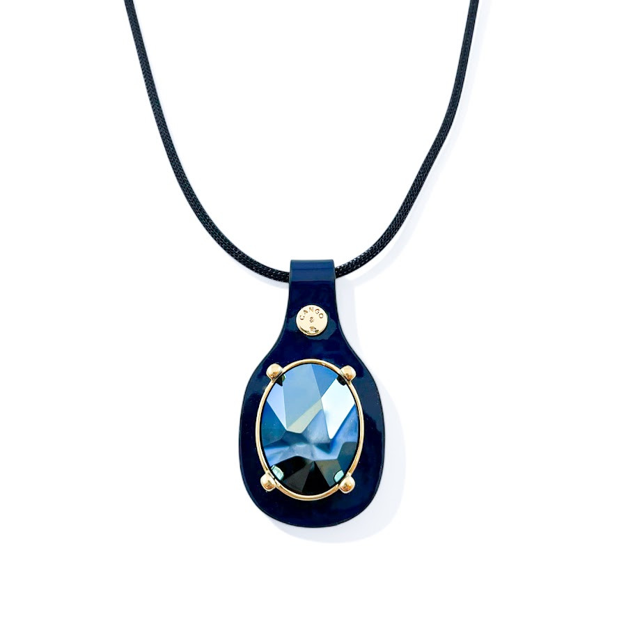Cango&Rinaldi nyaklánc fekete színű huzalból és sötétkék minőségi olasz lakk bőrből, melyen arany színű fém foglalatban egy darab különleges csiszolású és vésett króm felületű metál kék színű kristály található