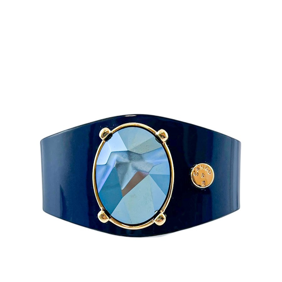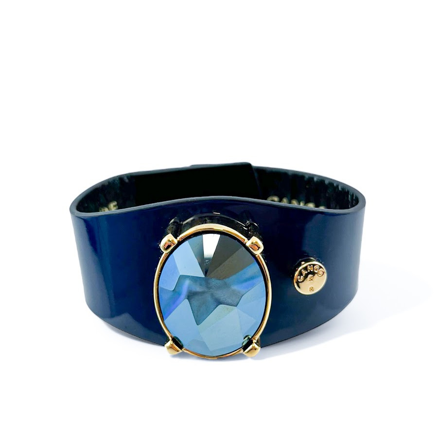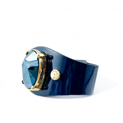 Cango&Rinaldi karkötő sötétkék színű minőségi olasz lakk bőrből, melyen arany színű fém foglalatban egy darab különleges csiszolású és vésett króm felületű metál kék színű kristály található.