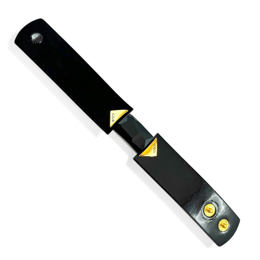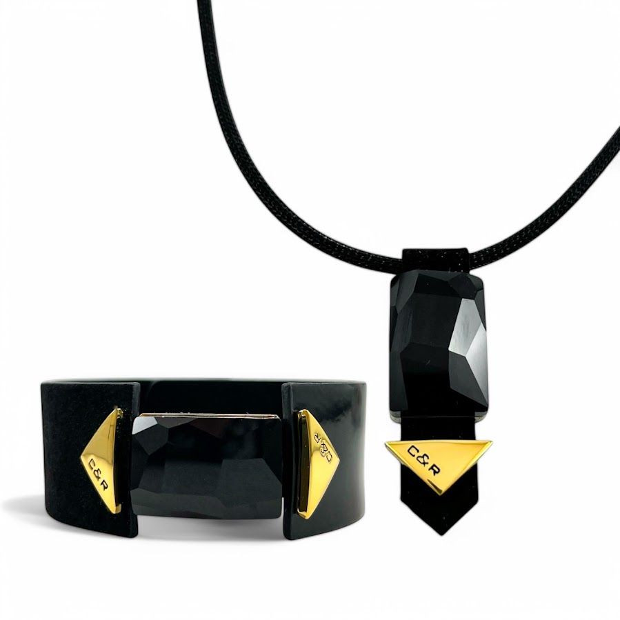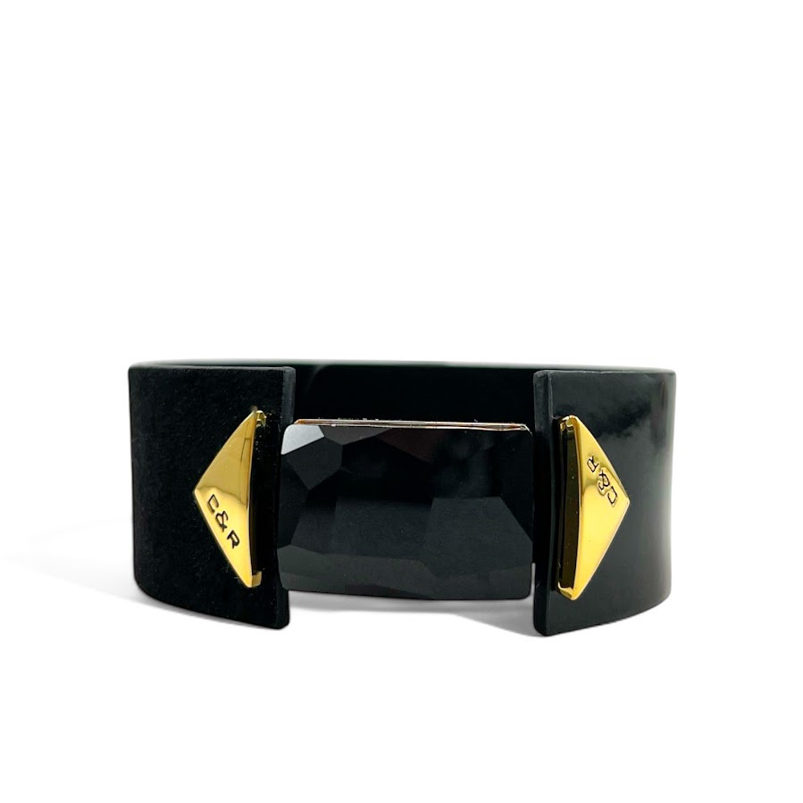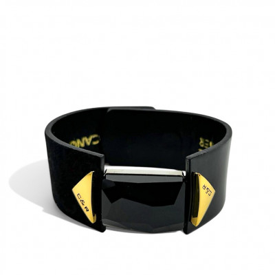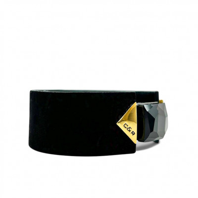 Cango&Rinaldi karkötő fekete színű minőségi olasz nubuk és lakk bőrből, melyen egy darab különleges csiszolású fekete színű kristály található, két oldalán márkajelzett arany színű fém kellékkel.