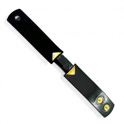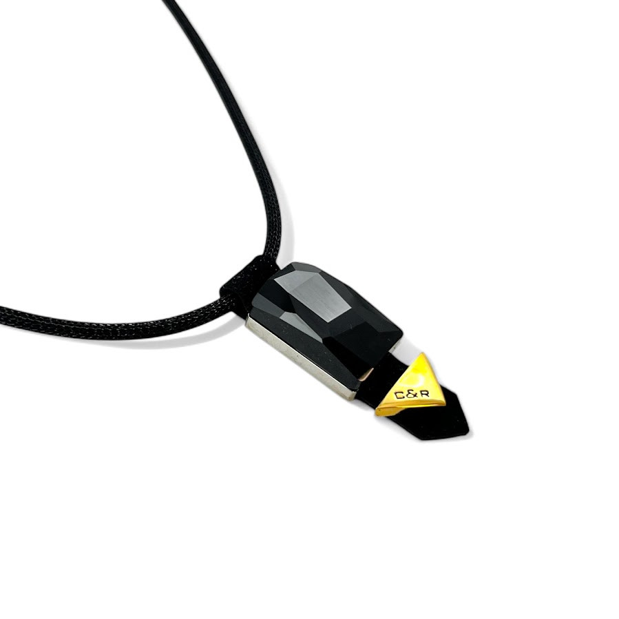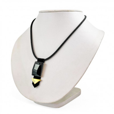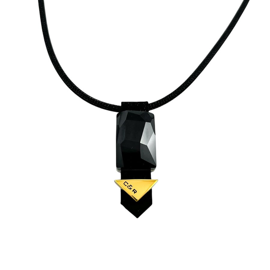 Cango&Rinaldi nyaklánc fekete színű huzalon és fekete színű minőségi olasz nubuk bőrből, melyen egy darab különleges csiszolású fekete színű kristály található, márkajelzett arany színű fém kellékkel.