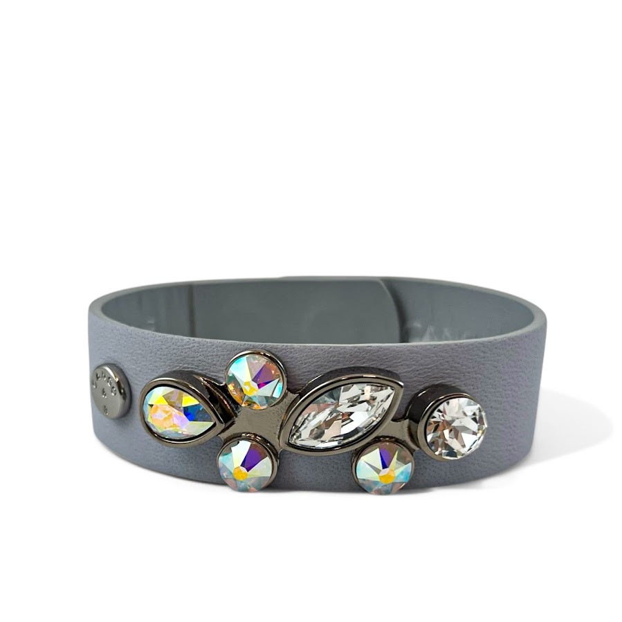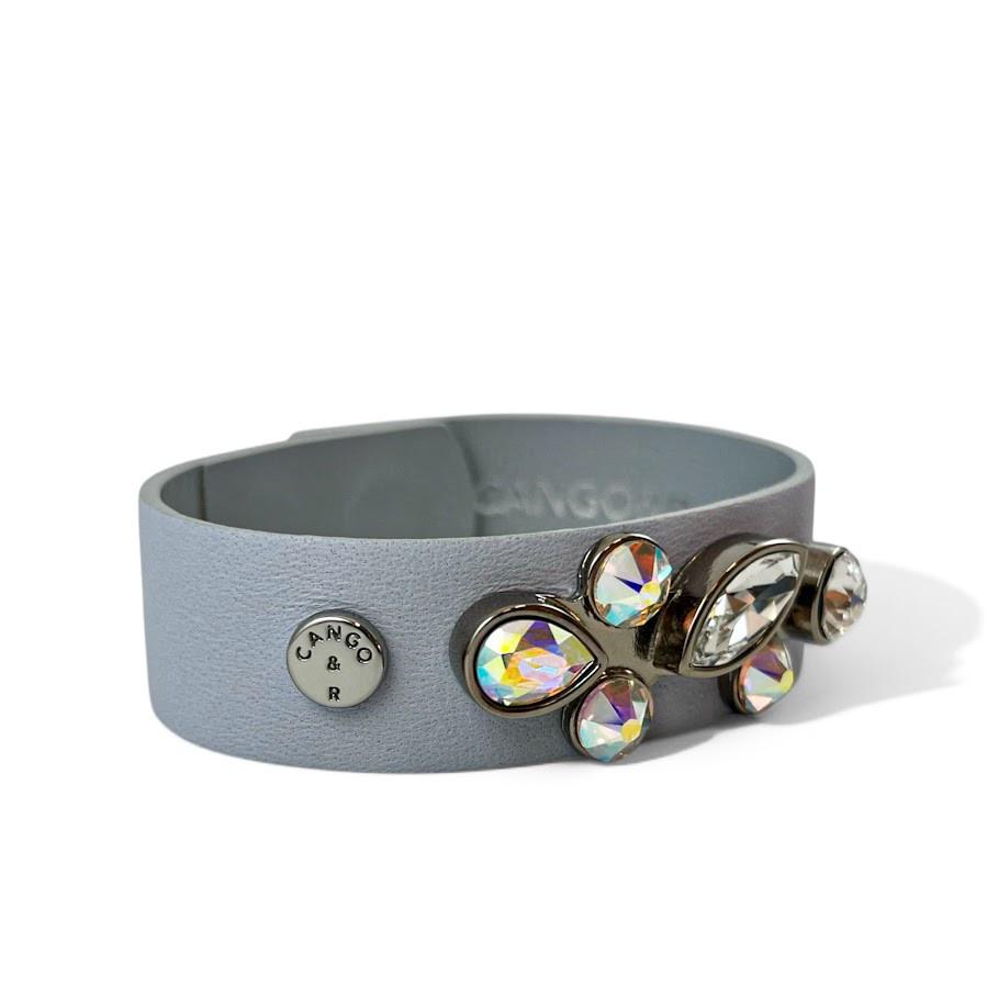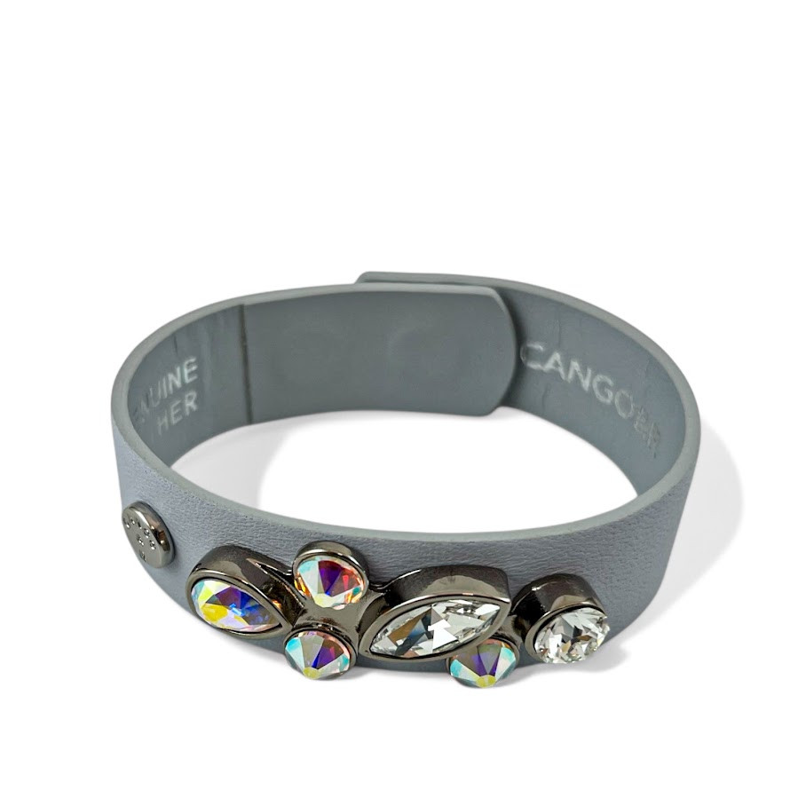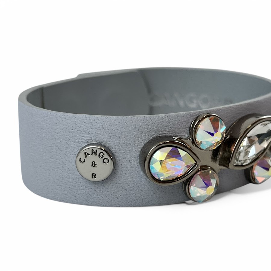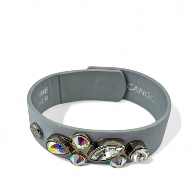 Cango&Rinaldi karkötő ködszürke színű minőségi olasz bőrből, amelynek közepén egy nikkel színű fém foglalatban különleges csiszolású színváltós (AB) és fehér (001) színű Swarovski kövek találhatóak.
