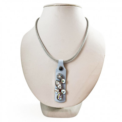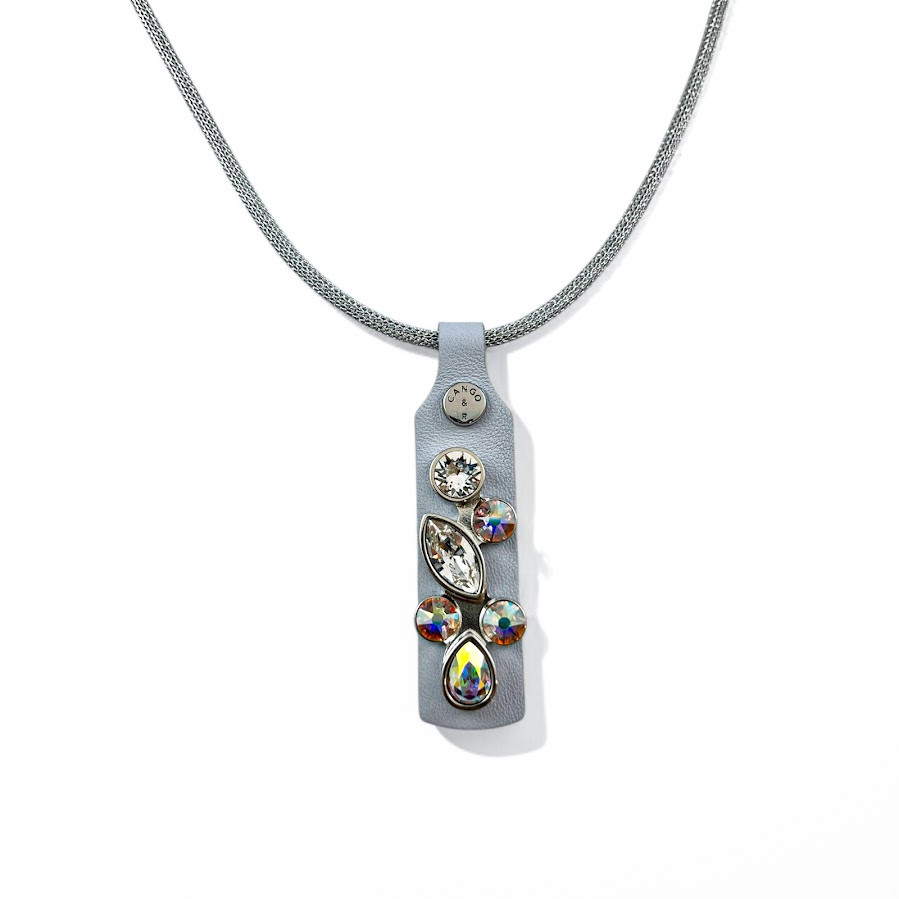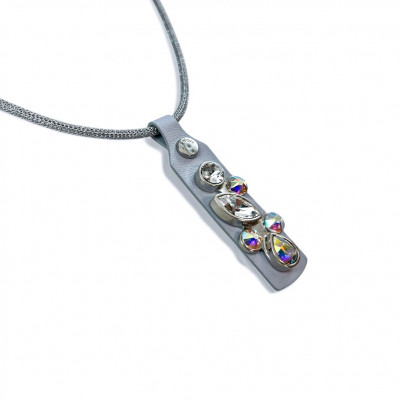 Cango&Rinaldi nyaklánc ezüst színű huzalon minőségi ködszürke színű olasz bőrön nikkel színű fém foglalatban különleges csiszolású színváltós (AB) és fehér (001) színű Swarovski kövek találhatóak.