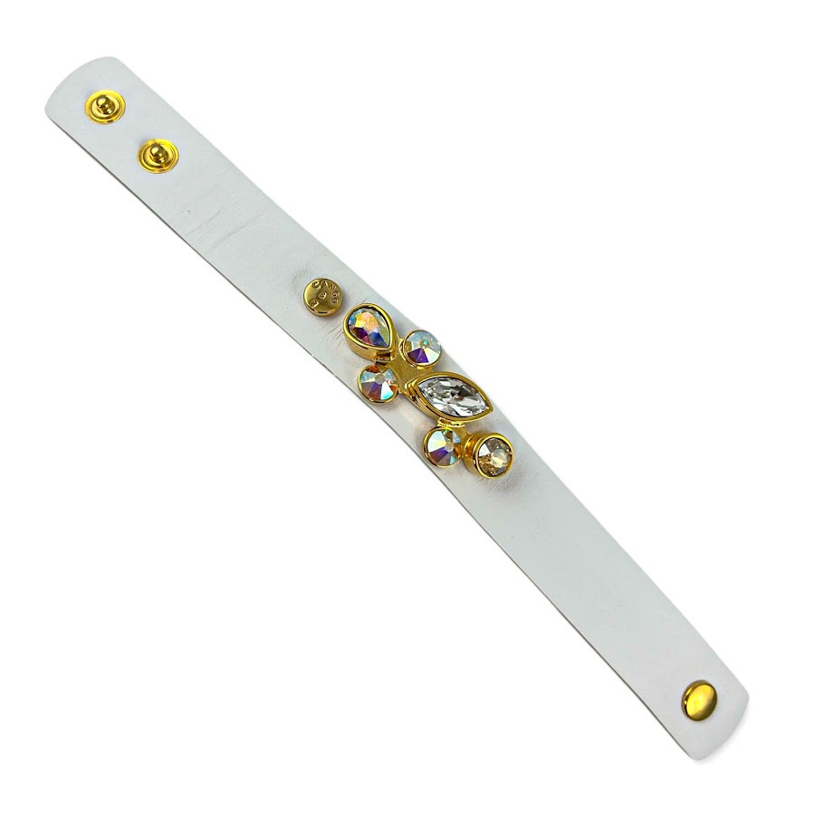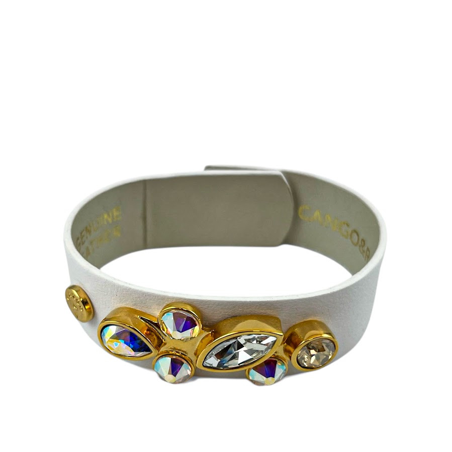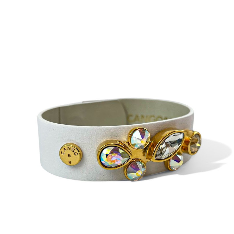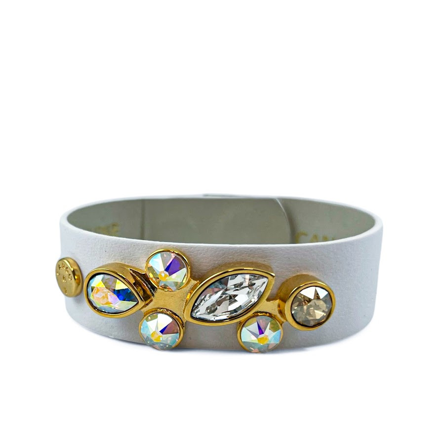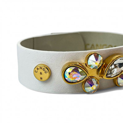 Cango&Rinaldi karkötő fehér színű minőségi olasz bőrből, amelynek közepén egy arany színű fém foglalatban különleges csiszolású színváltós (AB), fehér (001) és arany színű Swarovski kövek találhatóak.