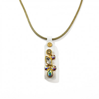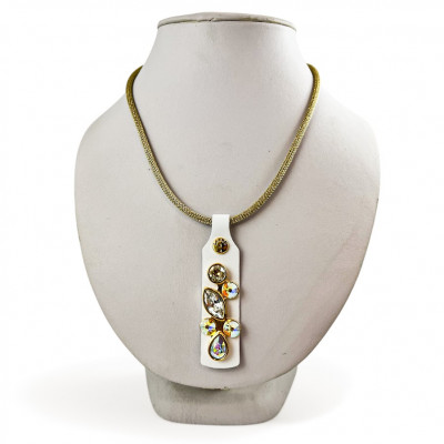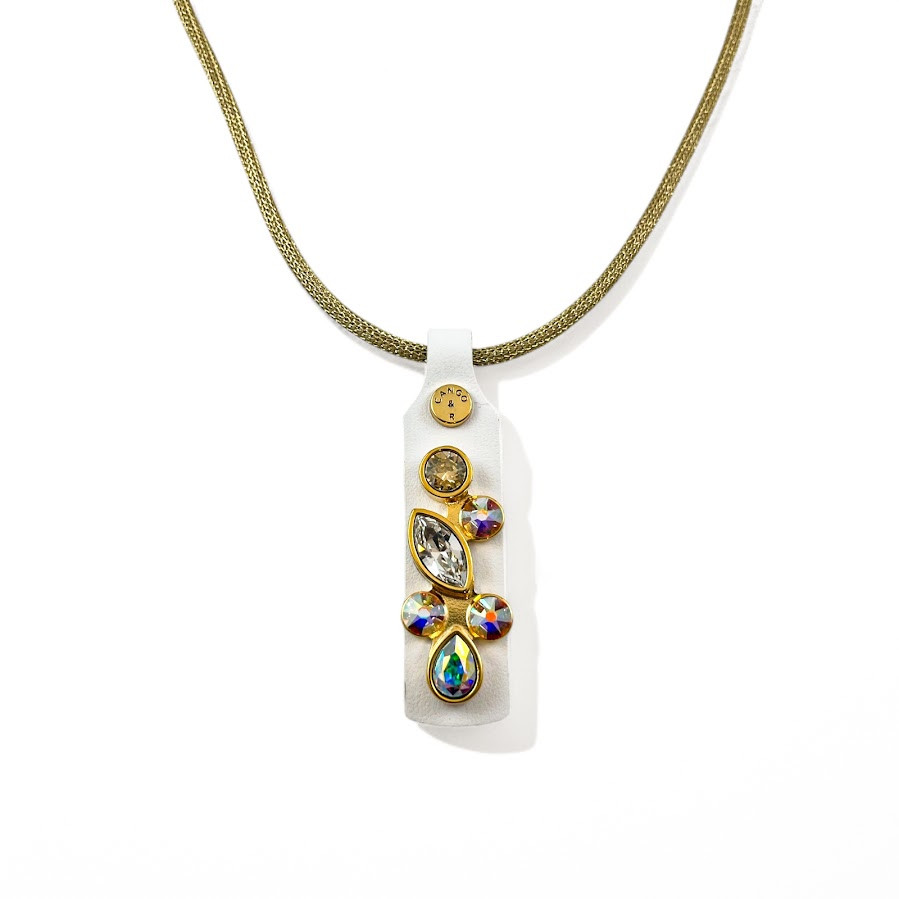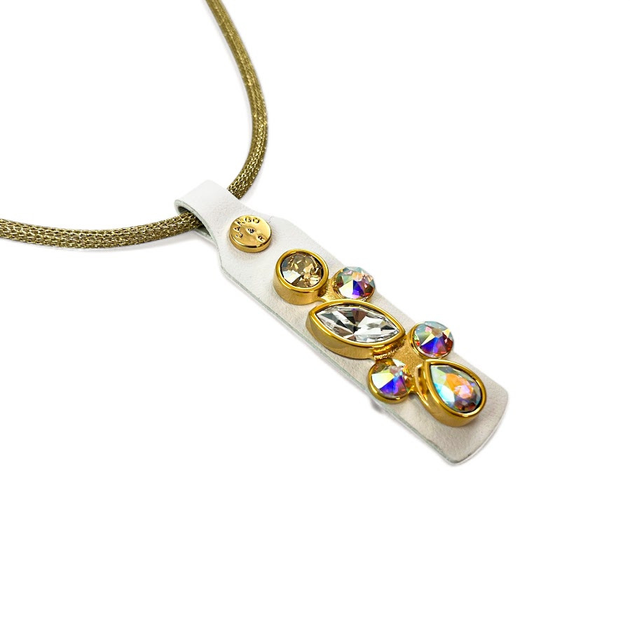 Cango&Rinaldi nyaklánc arany színű huzalon fehér színű minőségi olasz bőrön arany színű fém foglalatban különleges csiszolású színváltós (AB), fehér (001) és arany színű Swarovski kövek találhatóak.