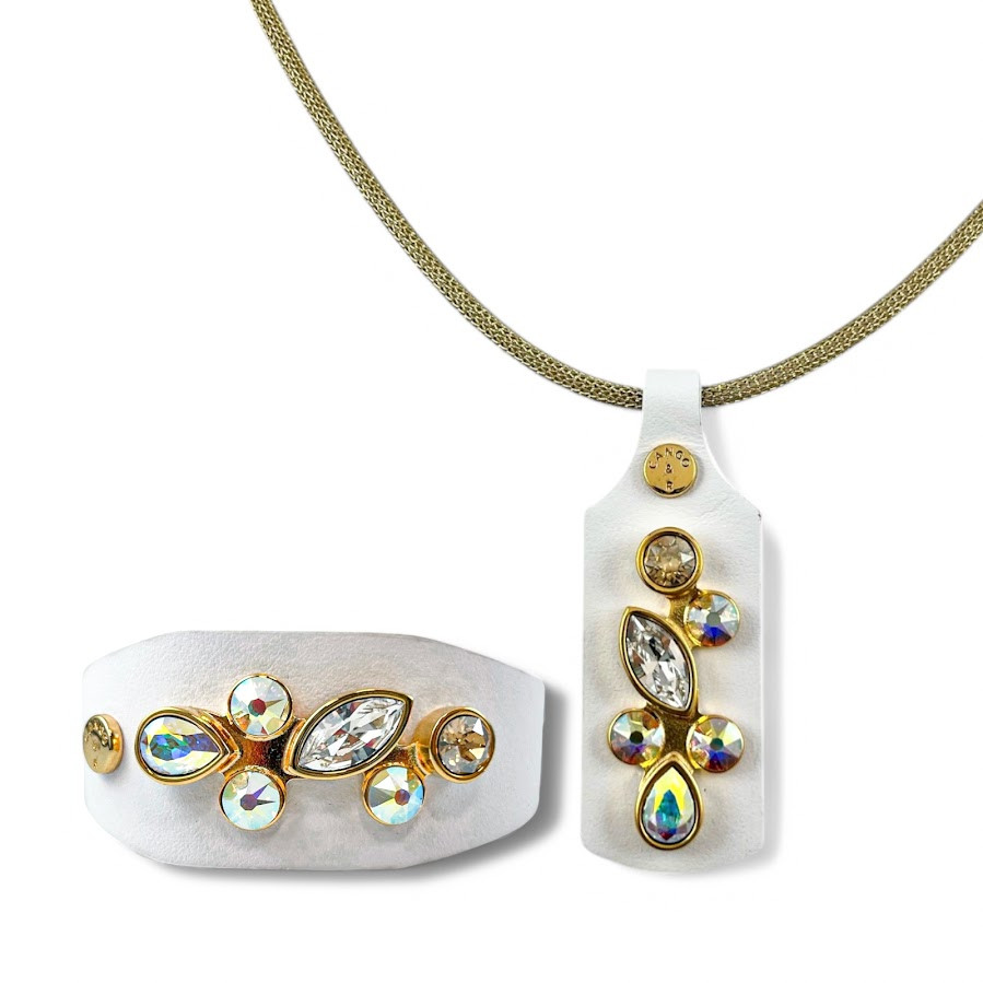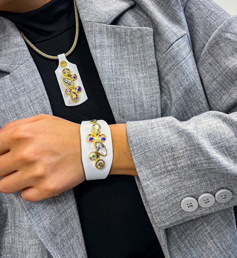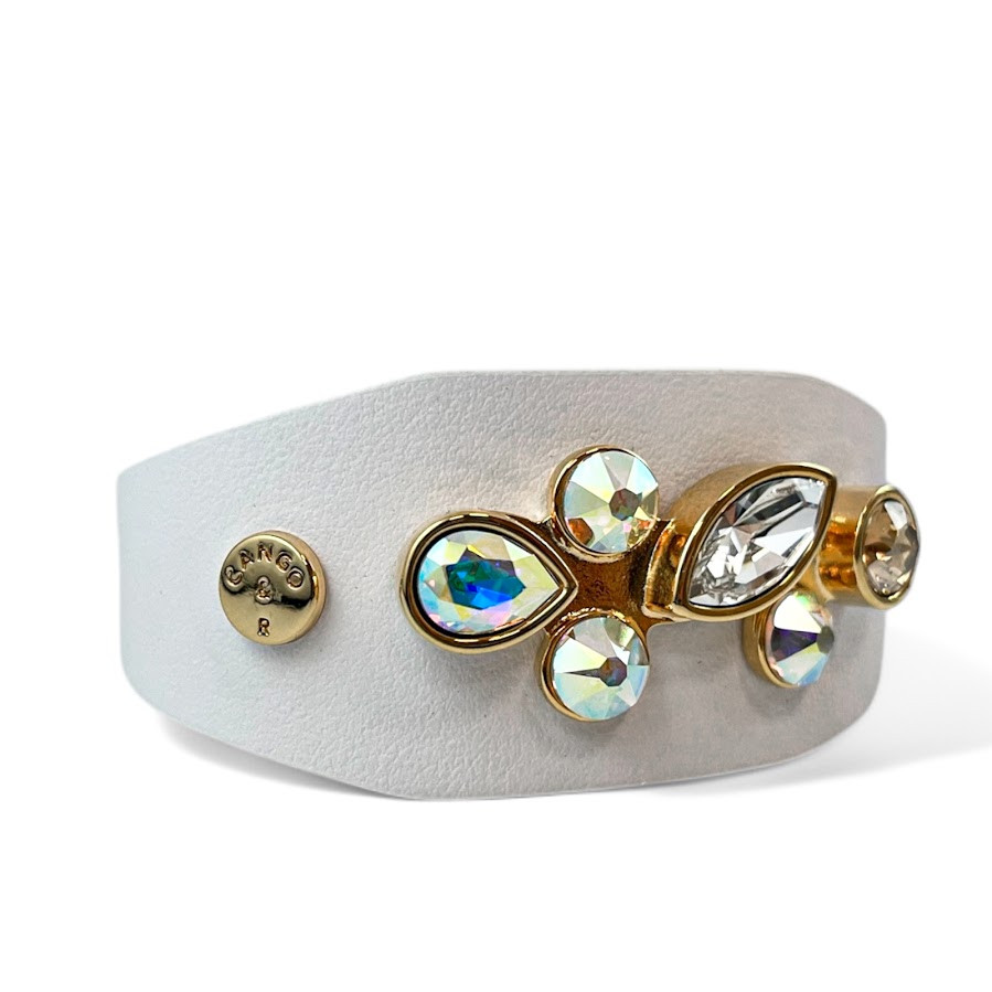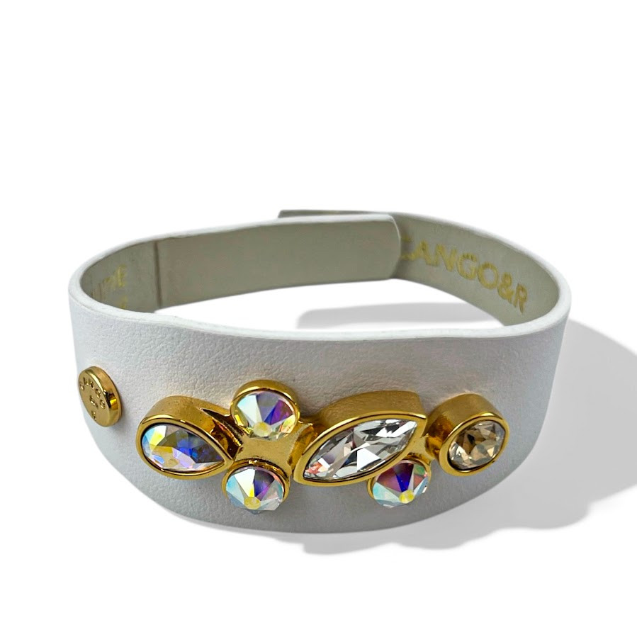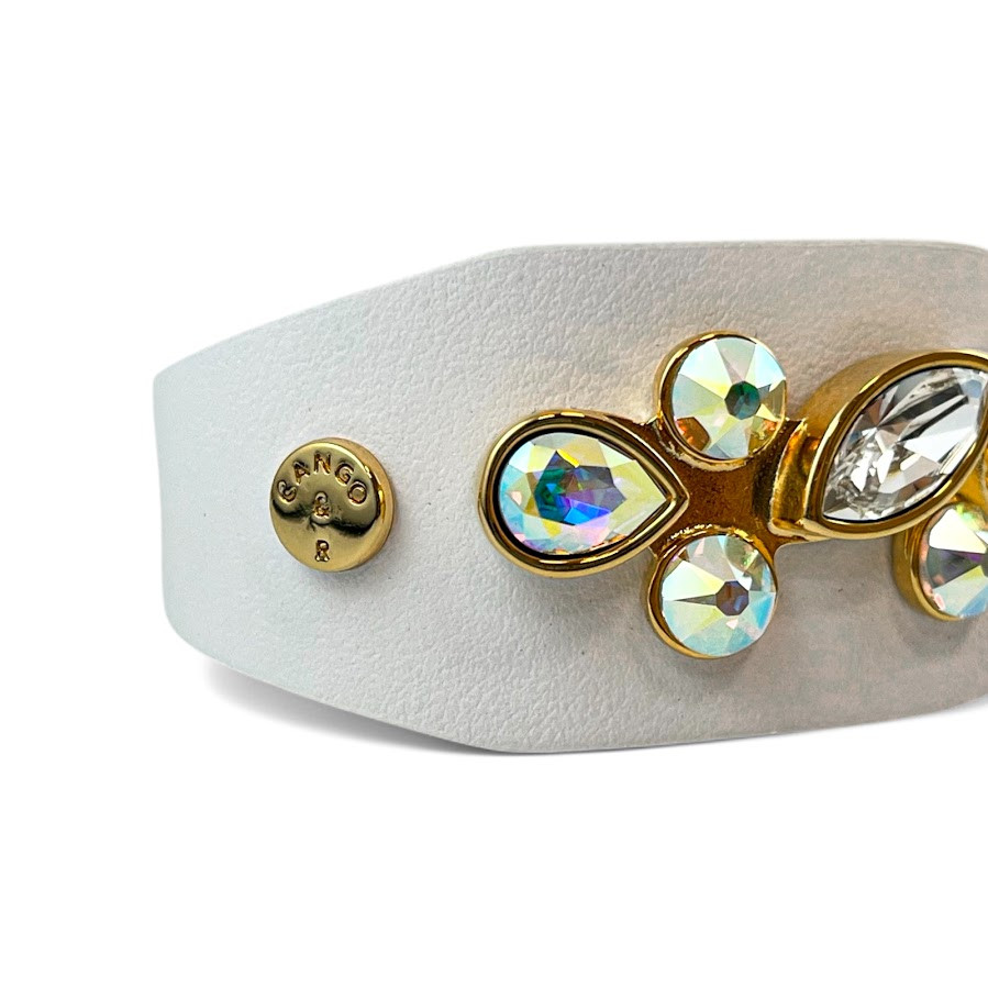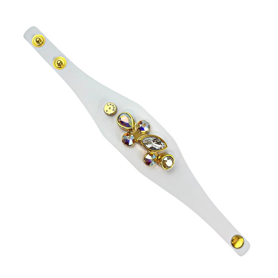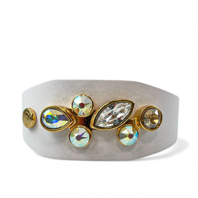 Cango&Rinaldi karkötő, amely fehér színű minőségi olasz bőrből készült, közepén egy arany színű fém foglalatban különleges csiszolású színváltós (AB), arany és fehér (001) színű Swarovski kövekkel díszítve.