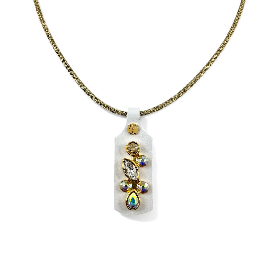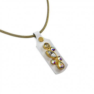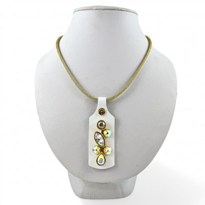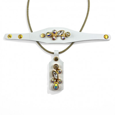 Cango&Rinaldi nyaklánc arany színű huzalból, melyet fehér színű minőségi olasz bőrőn, arany színű fém foglalatban különleges csiszolású színváltós (AB), arany és fehér (001) színű Swarovski kövek díszítenek.
