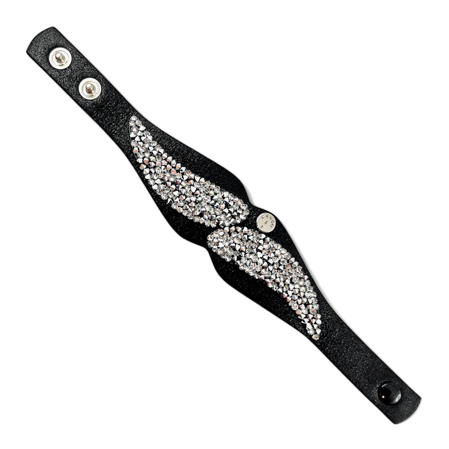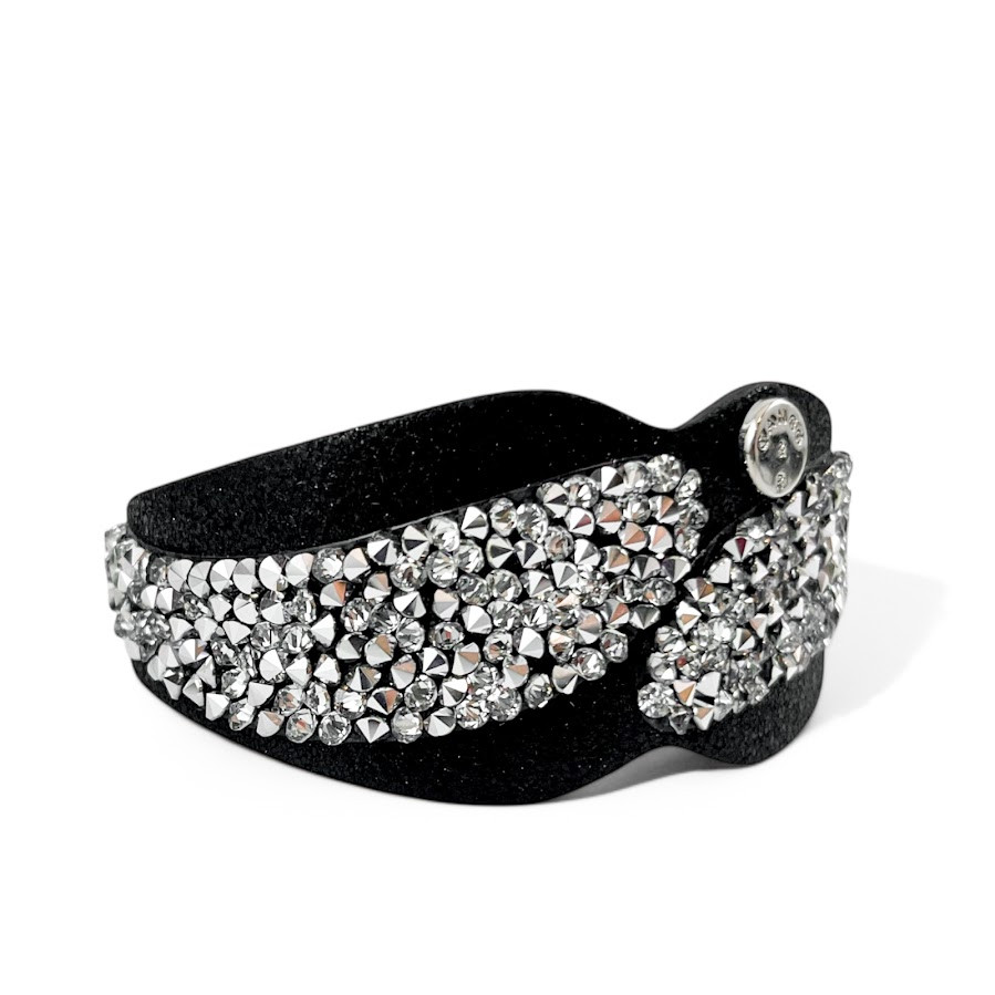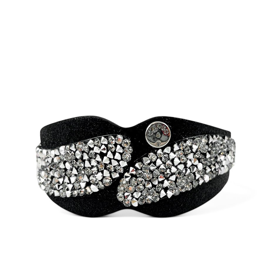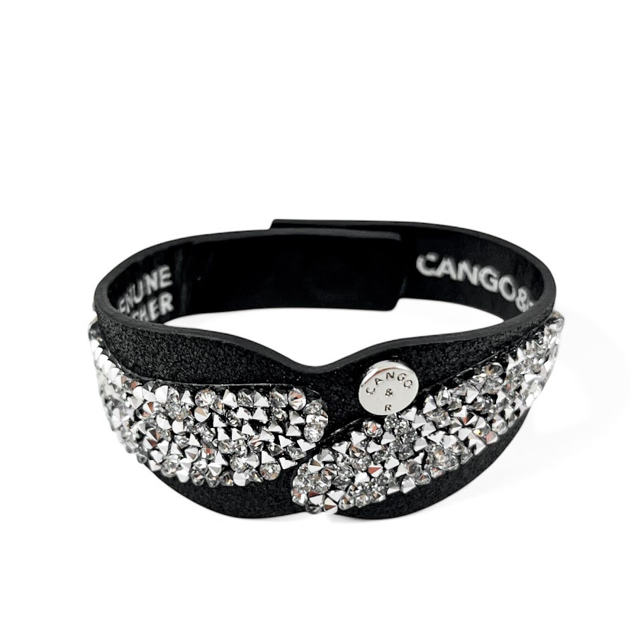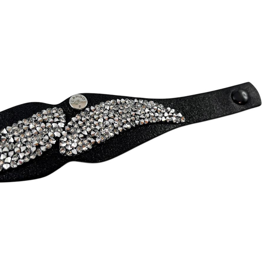 Cango&Rinaldi karkötő fekete színű puha minőségi olasz bőrből, mely különleges formában fehér színű szilánk formájú Crystal Rock Swarovski kristályokkal és egy márkajelzett szegeccsel díszített.