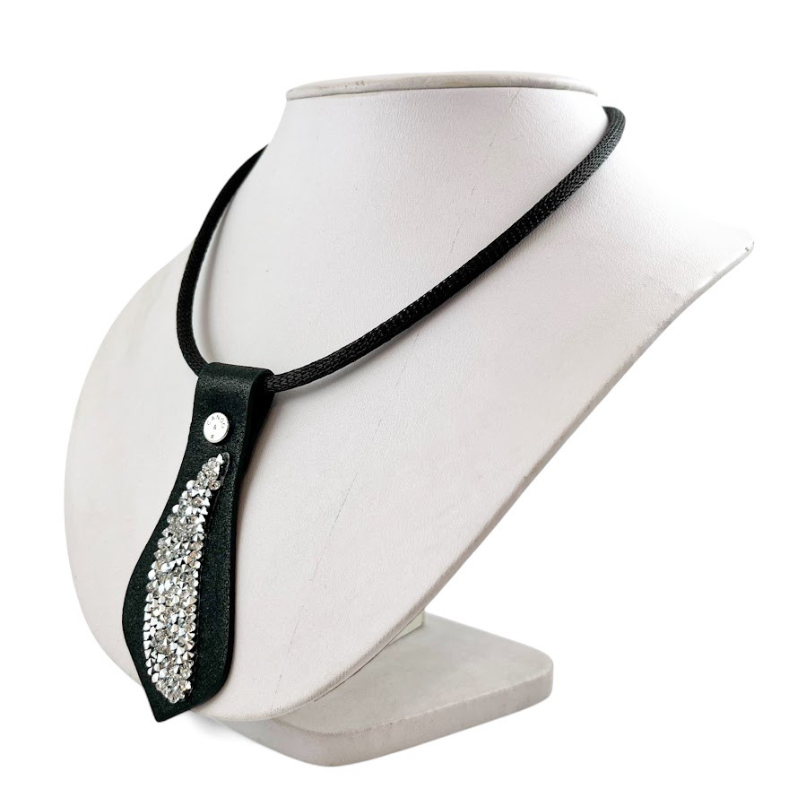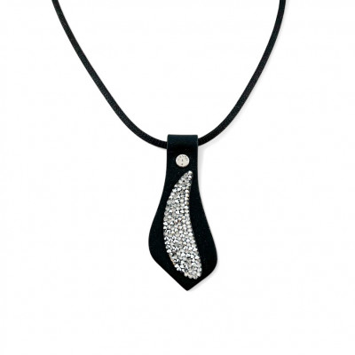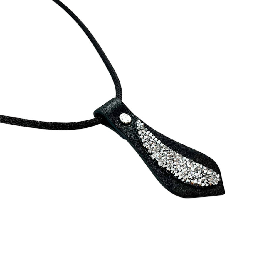 Cango&Rinaldi nyaklánc fekete színű huzalon, egy fekete színű puha minőségi olasz bőr medál, mely különleges formában fehér színű szilánk formájú Crystal Rock Swarovski kristályokkal és egy márkajelzett szegeccsel díszített.
