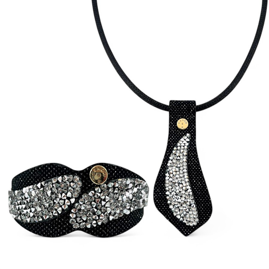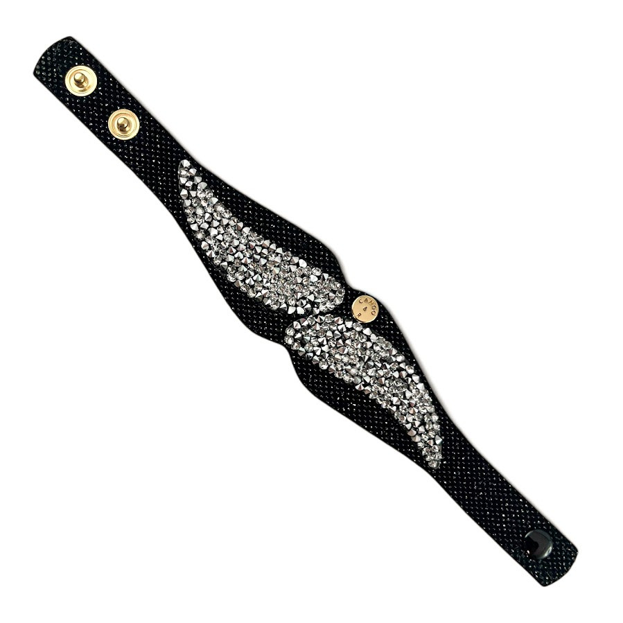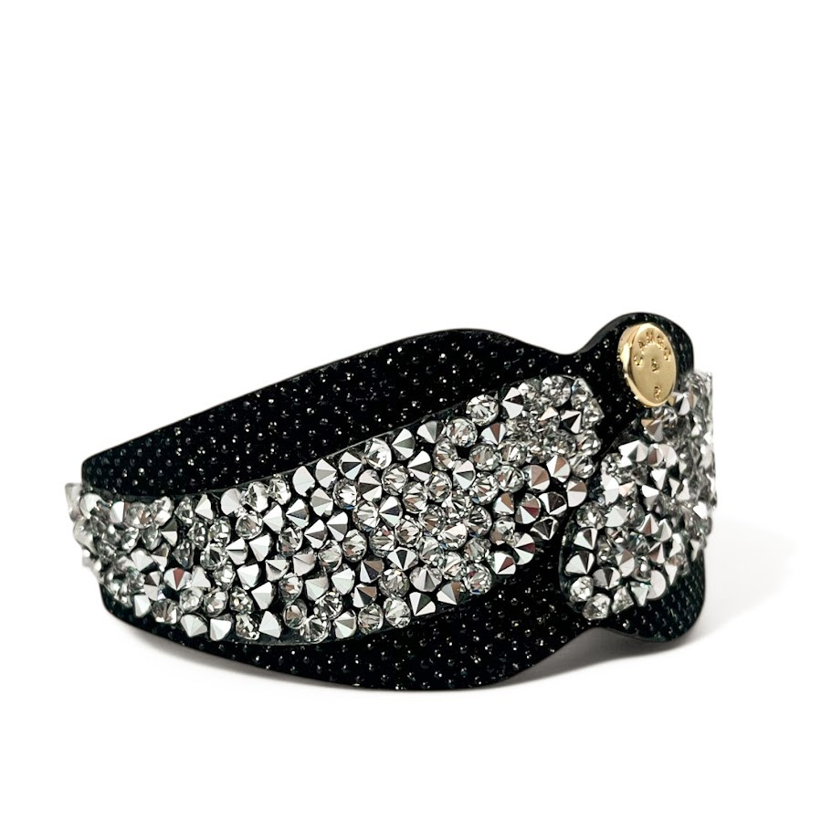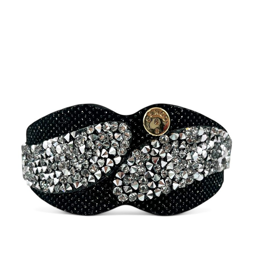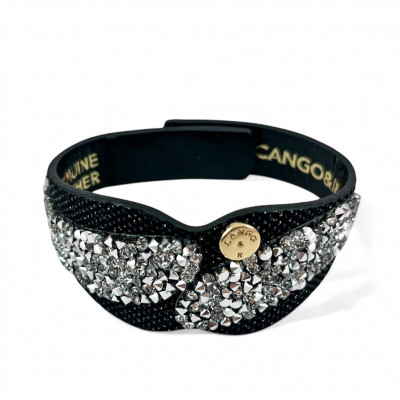 Cango&Rinaldi karkötő fekete színű minőségi csillogó olasz bőrből, mely különleges formában fehér színű szilánk formájú Crystal Rock Swarovski kristályokkal és egy márkajelzett szegeccsel díszített.