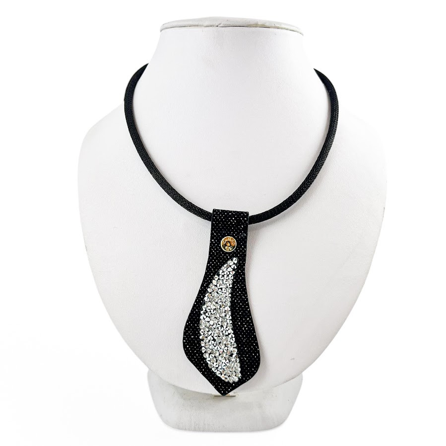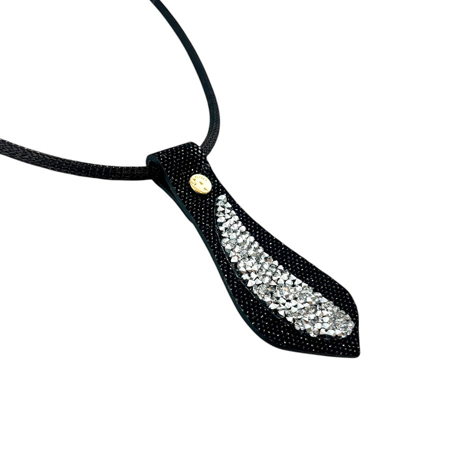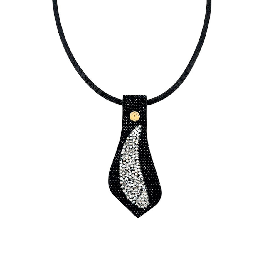 Cango&Rinaldi nyaklánc fekete színű huzalon, egy fekete színű minőségi csillogó olasz bőr medál, mely különleges formában fehér színű szilánk formájú Crystal Rock Swarovski kristályokkal és egy márkajelzett szegeccsel díszített.