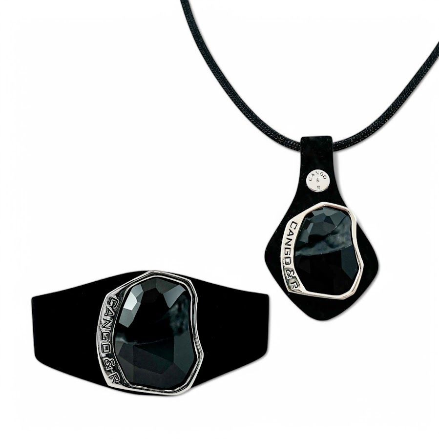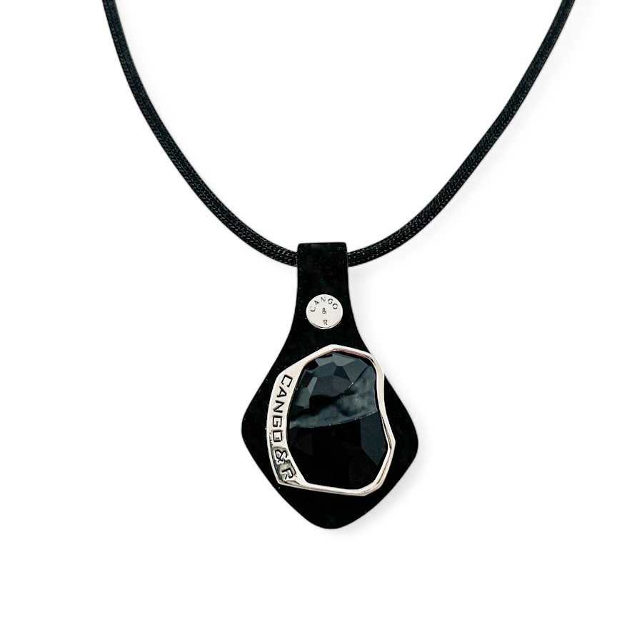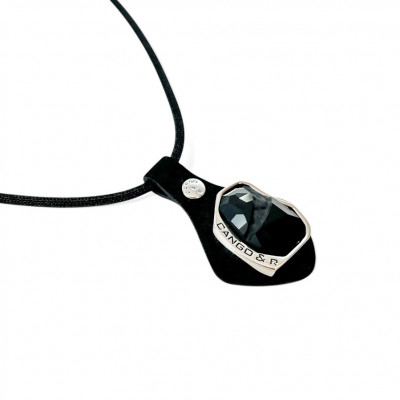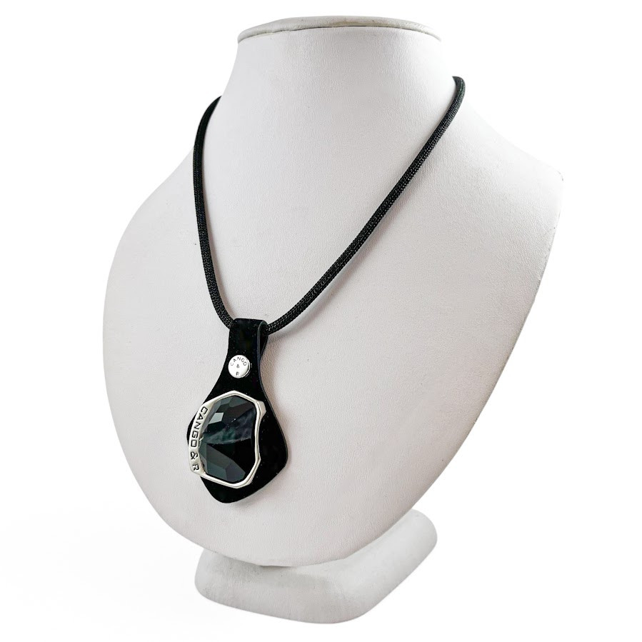 Cango&Rinaldi nyaklánc fekete színű huzalon, melyet fekete színű minőségi olasz nubuk bőrön, nikkel színű fém foglalatban egy nagyobb méretű, különleges csiszolású és vésett fekete (jet) színű Swarovski kristály díszít.