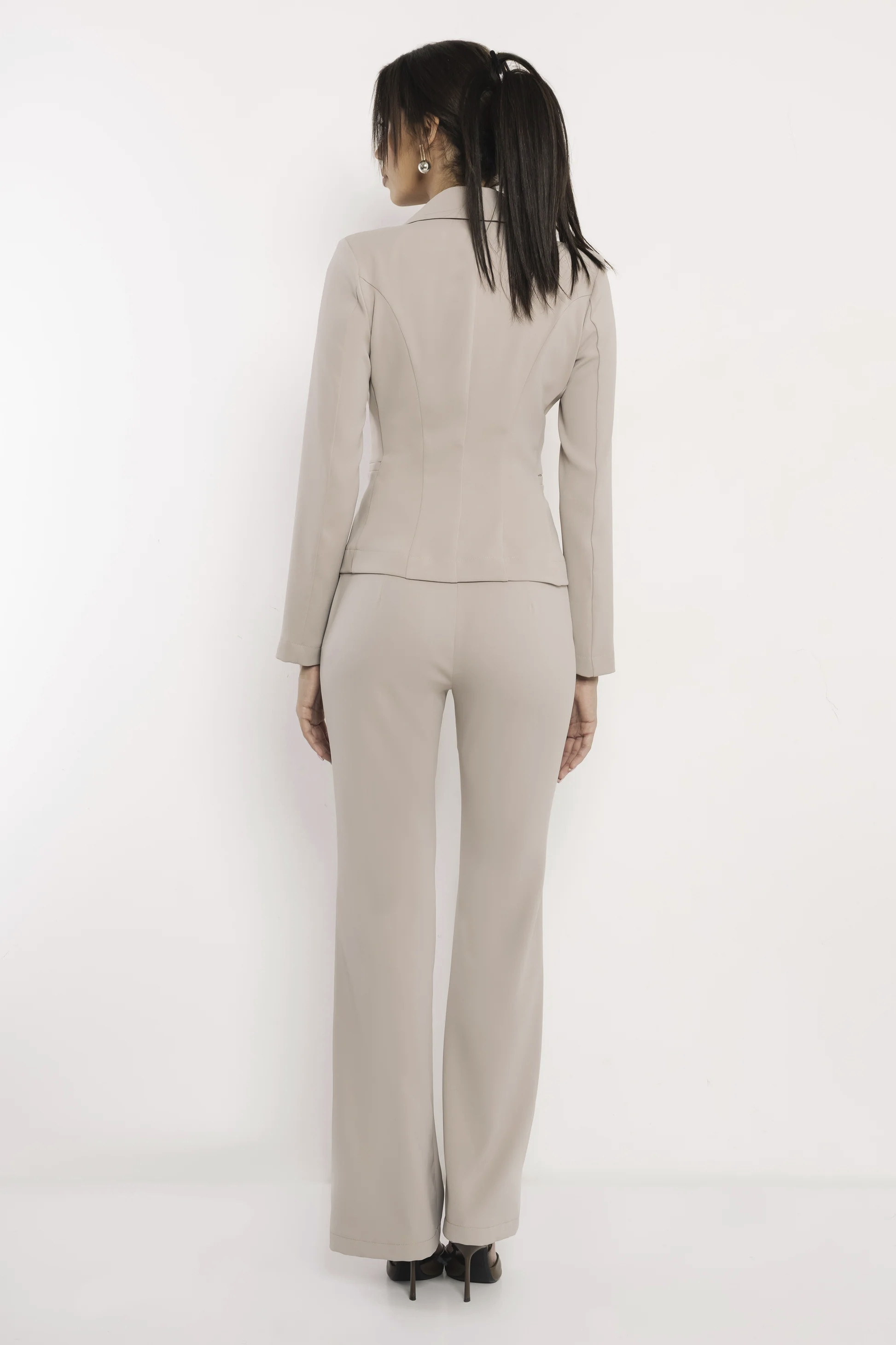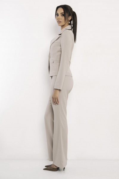 Amnesia karcsúsított szabású, béleletlen zakó fango színben; széles gallérral; gombos záródással; válltöméssel; álzsebekkel; elején diszkrét fém márkajelzéssel.