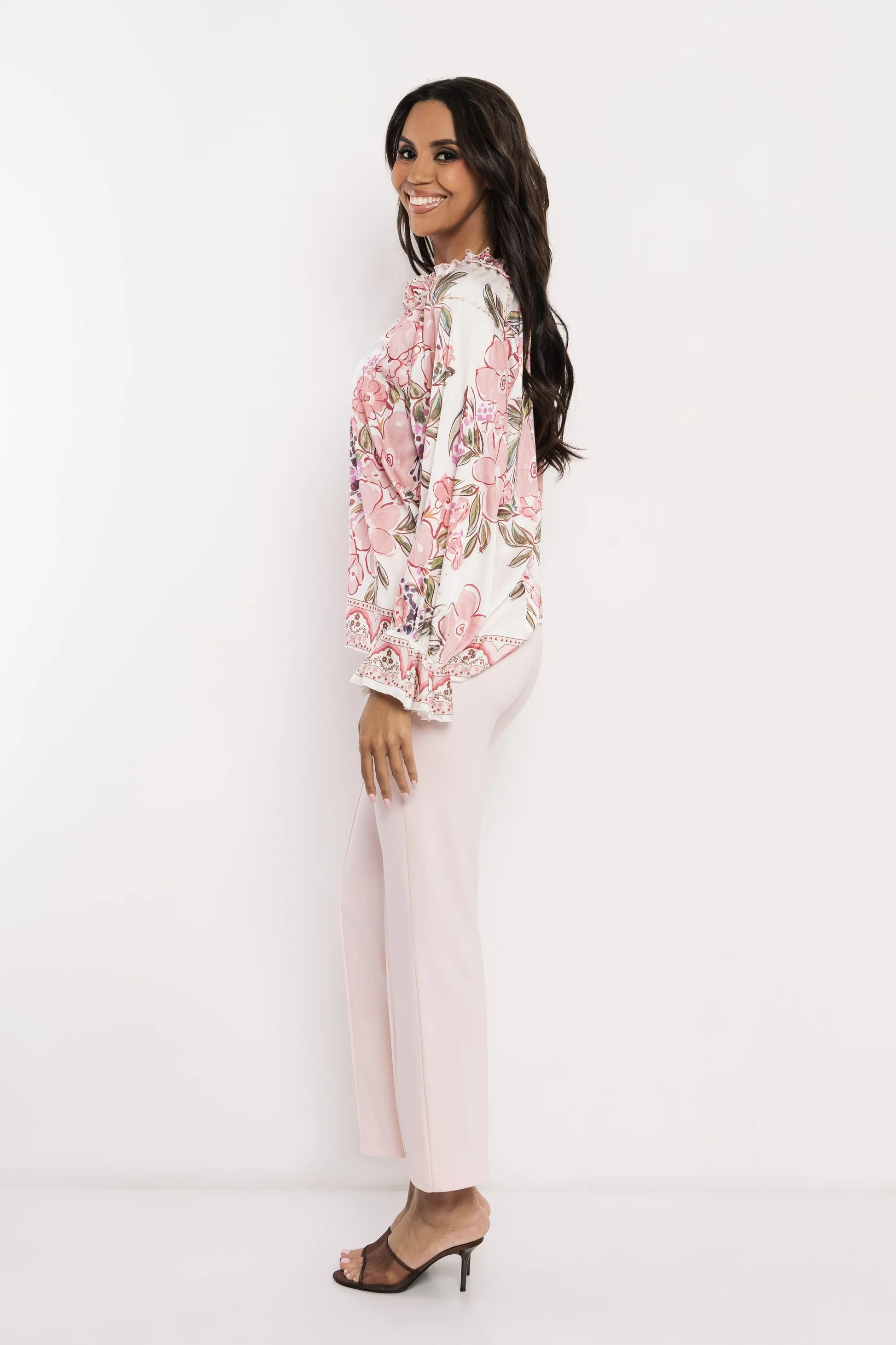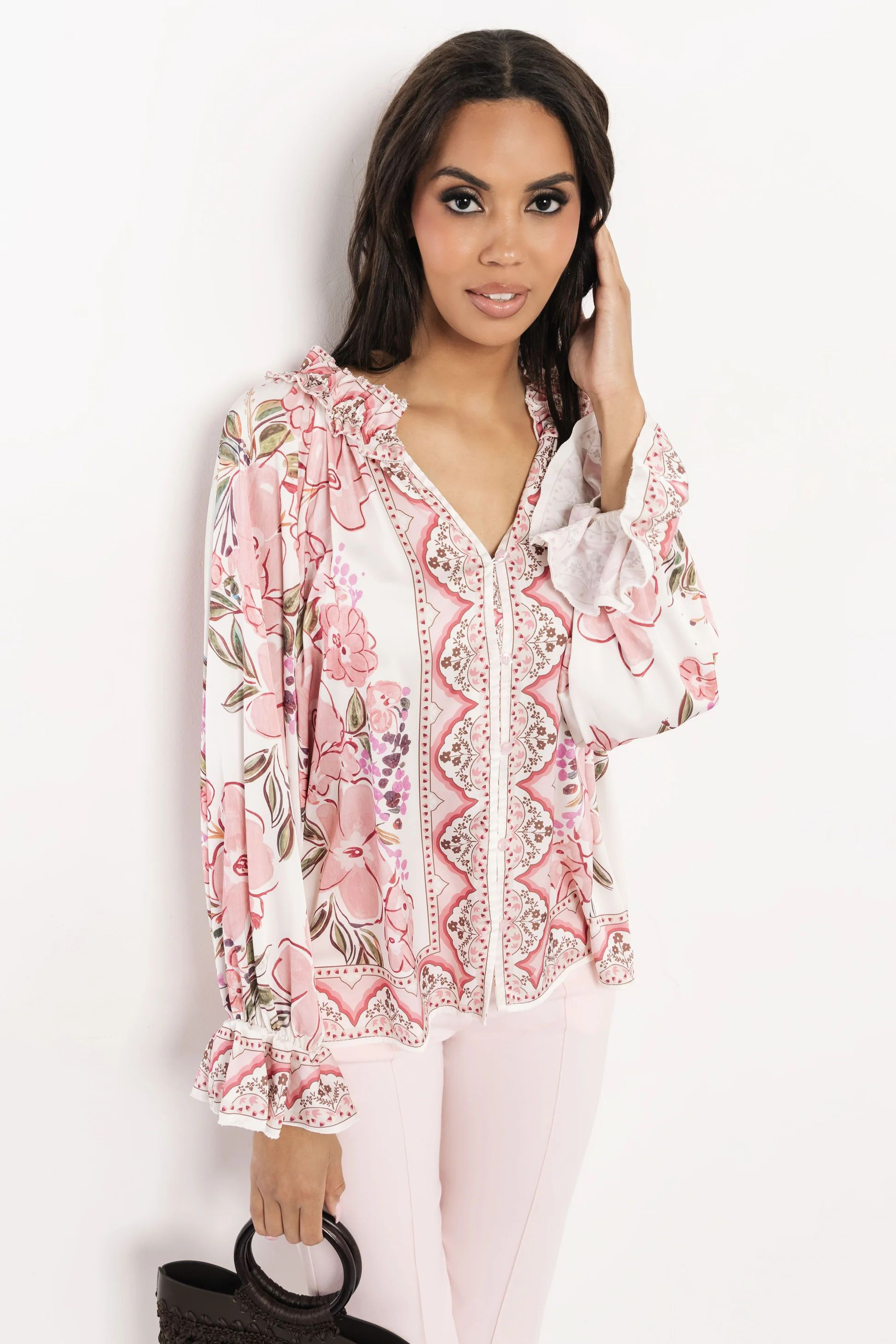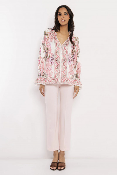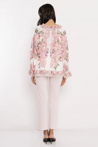 Amnesia blúz, krém alapon púder virág mintás. Bő fazonú, elején gombos, ujján és nyakán fodorral. Nyakán hátul fém márkajelzéssel.