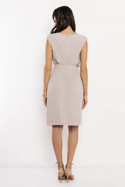 Amnesia karcsúsított szabású, ruha fangó színben, oldalán dekoratív márkajelzett gombokkal, derekán anyagazonos megkötővel, hátán rejtett cipzáras záródással.